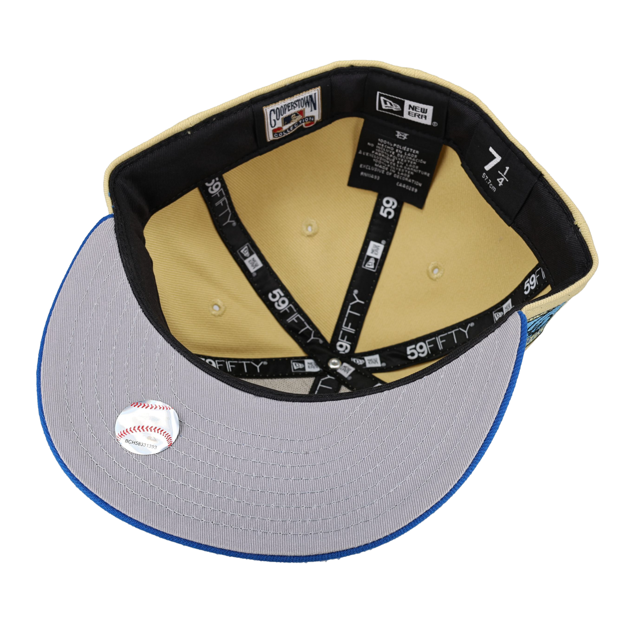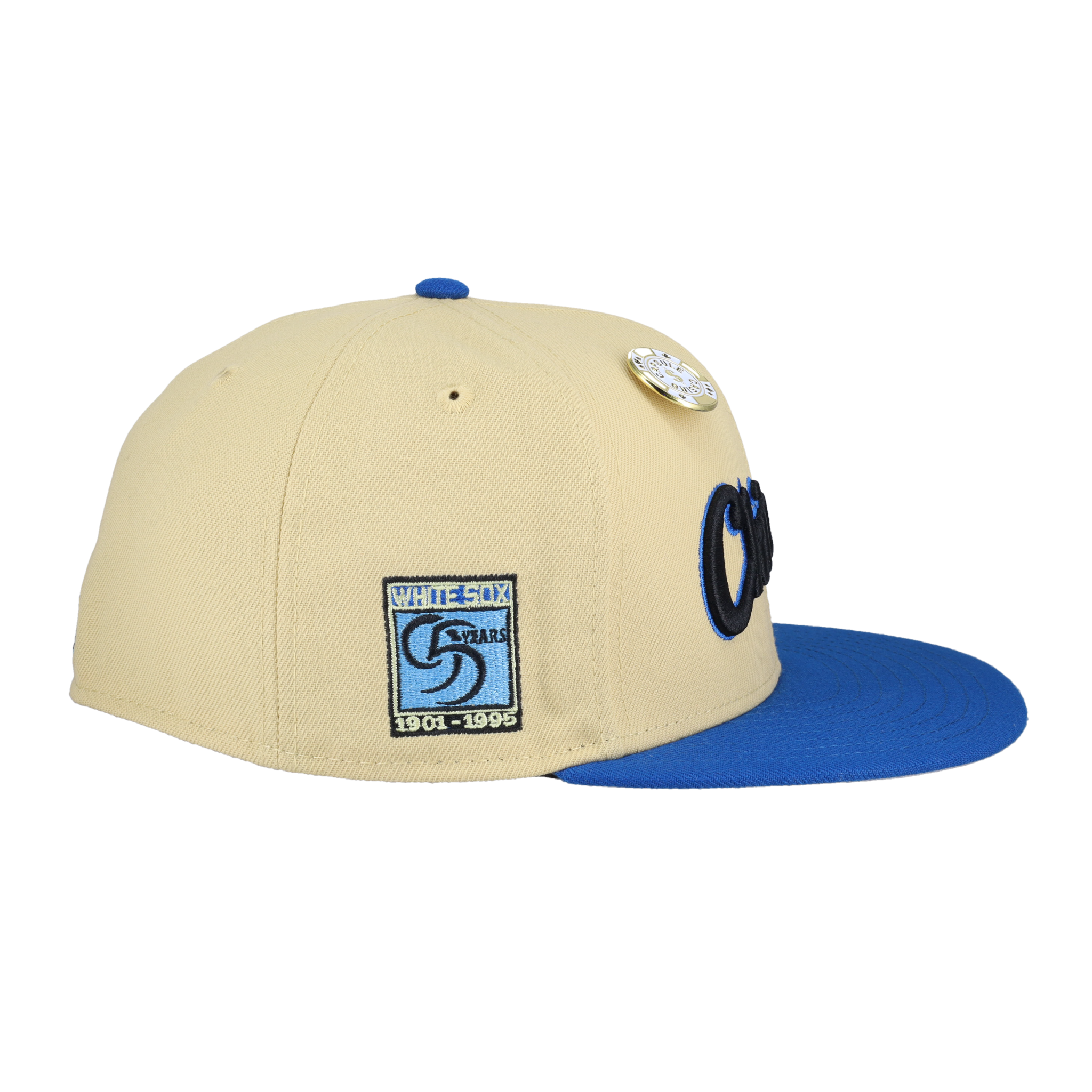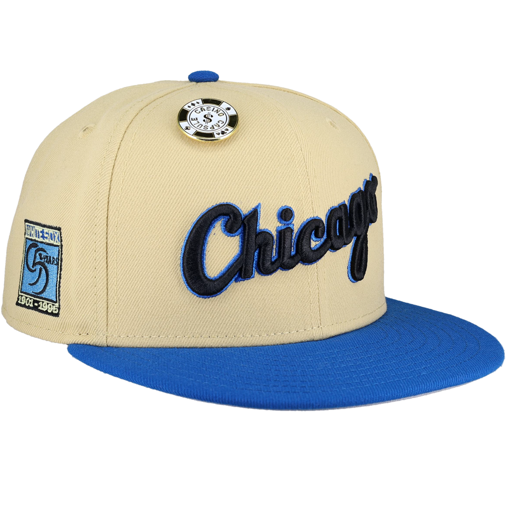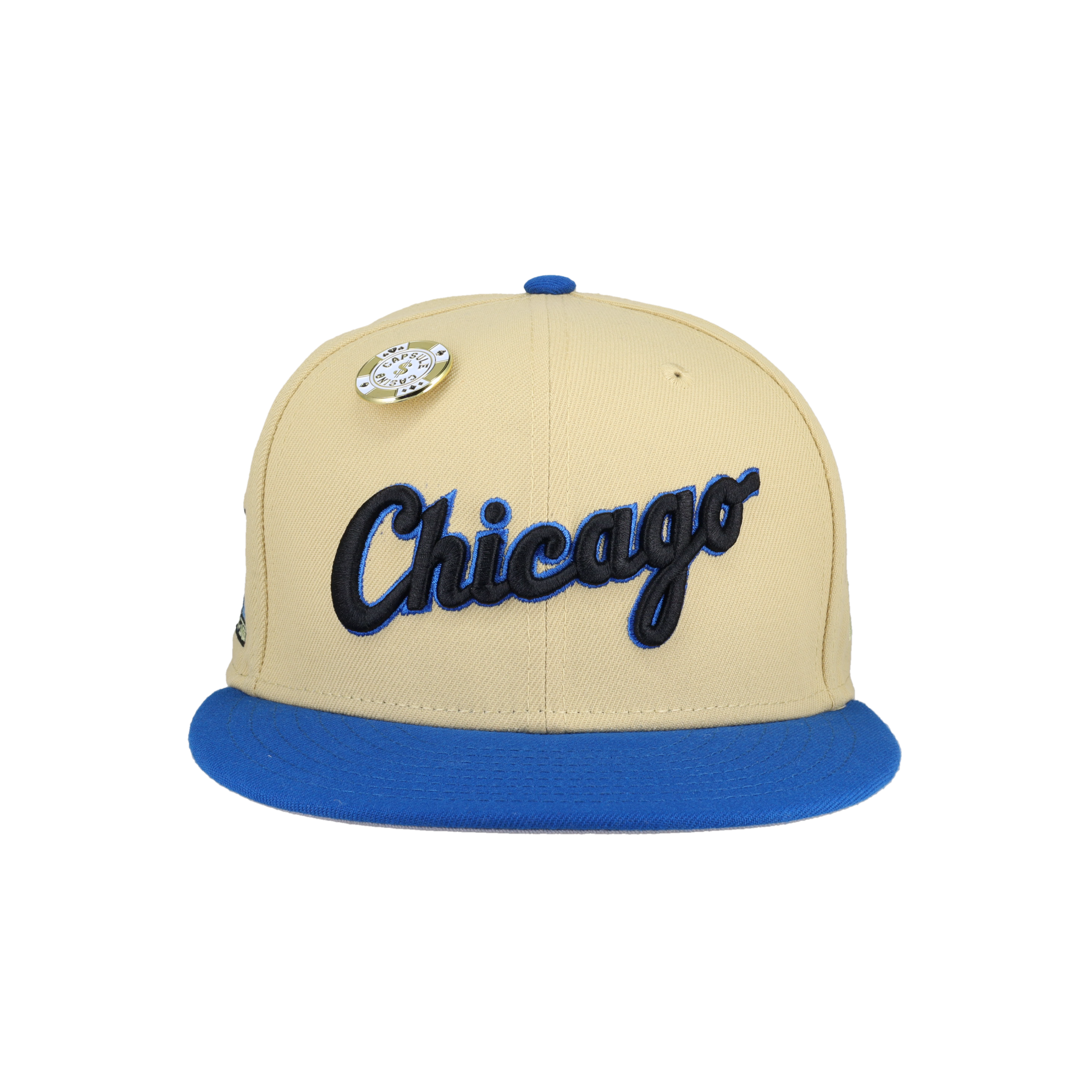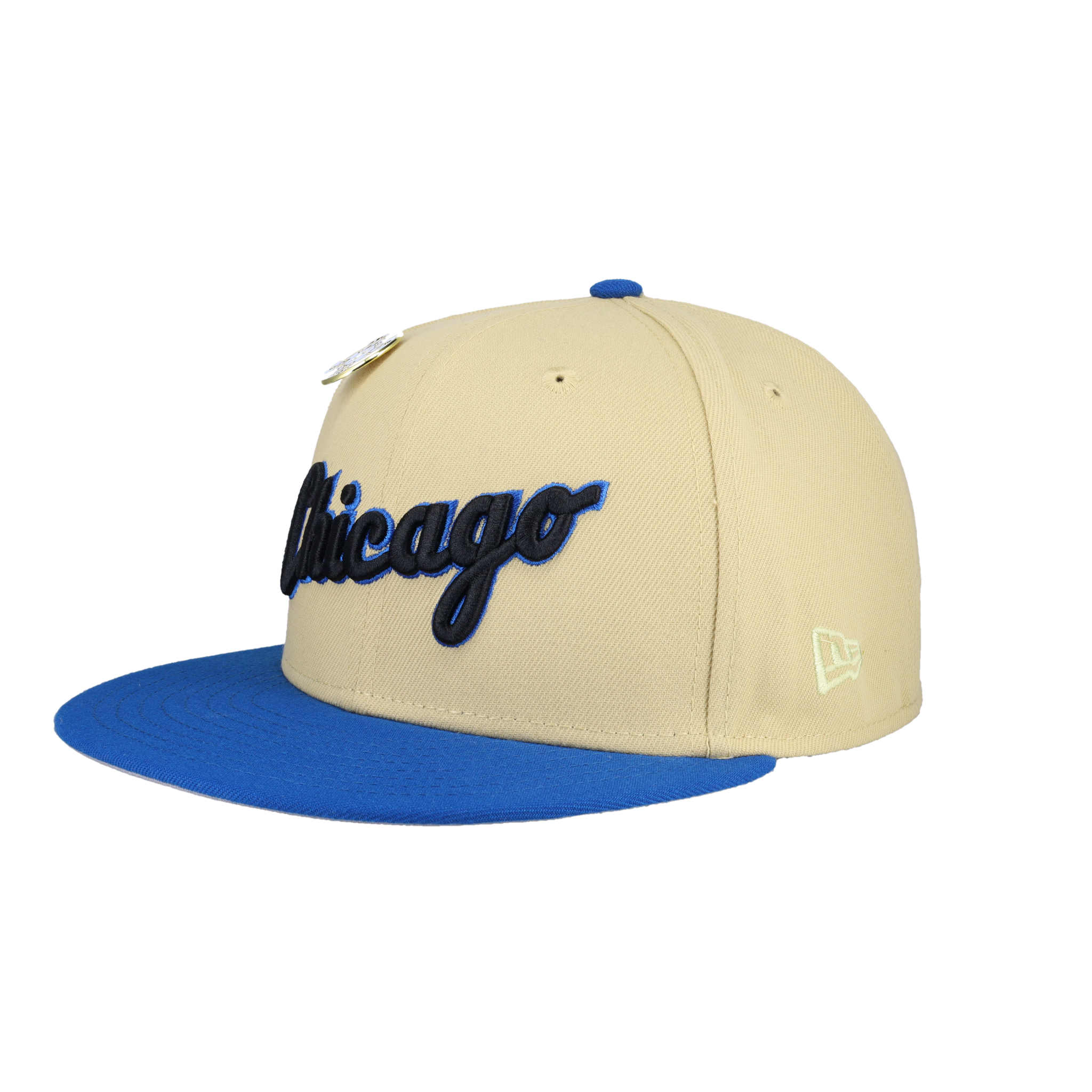 This New Era x Capsule Chicago White Sox Vegas Gold Collection 95 Years Fitted Hat was released by Capsule Hats. The fitted has a vegas gold six panel structured high crown and eyelets with a blue squatchee button. The flat bill of the fitted cap is blue with a grey undervisor. The front panel features the Chicago White Sox logo embroidery and a side patch embroidery on the right panel. The left panel of the fitted displays the New Era logo and the official MLB logo on the rear-crown .