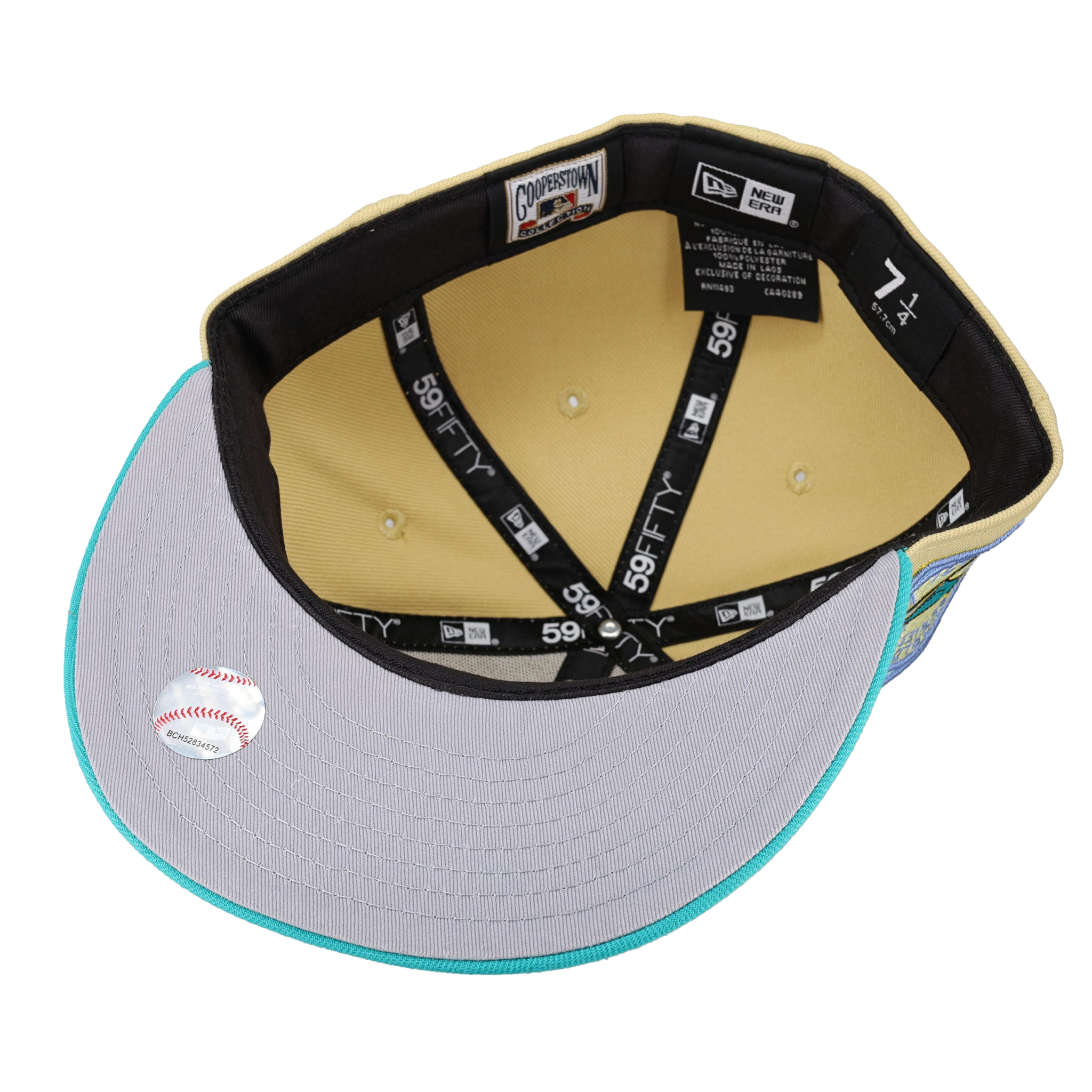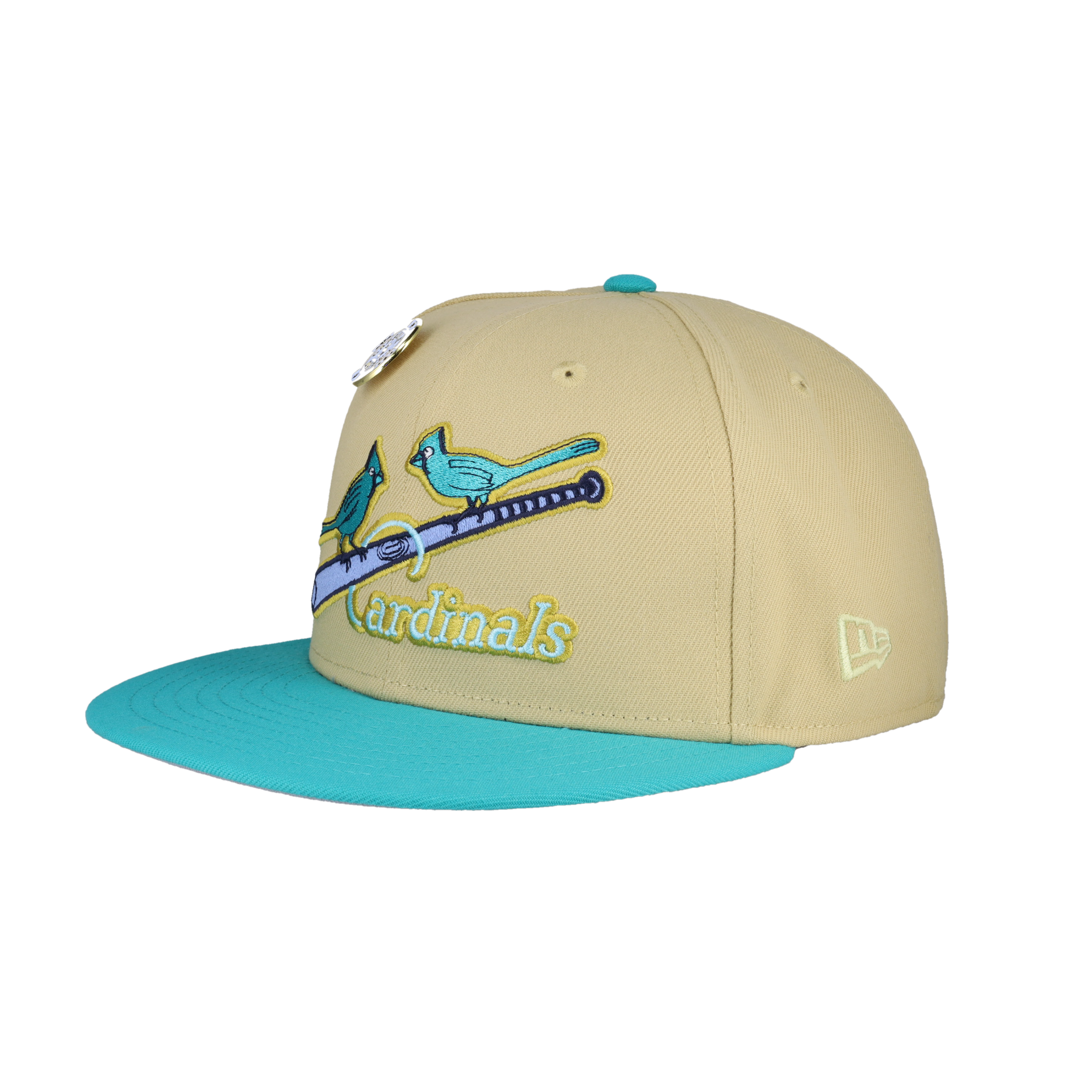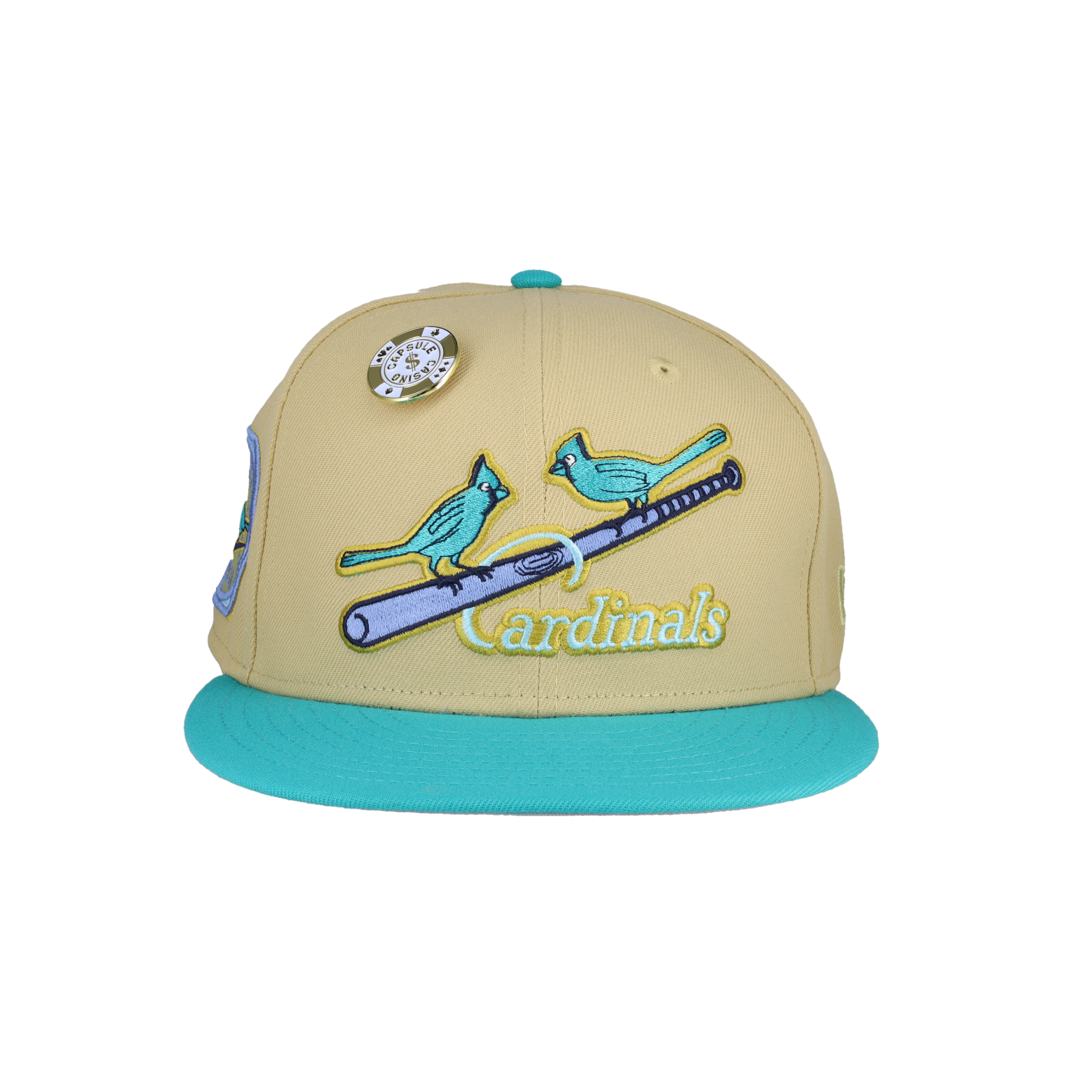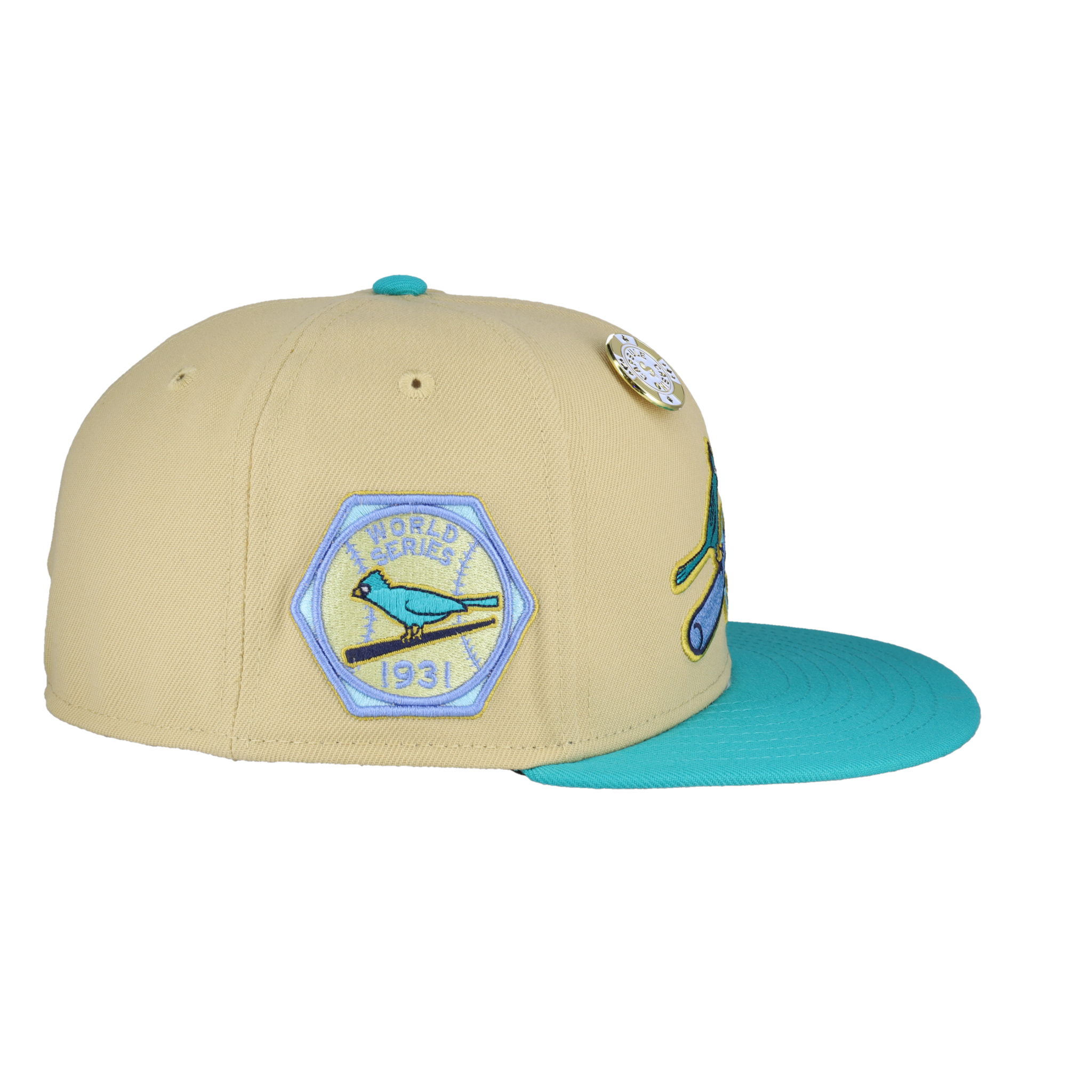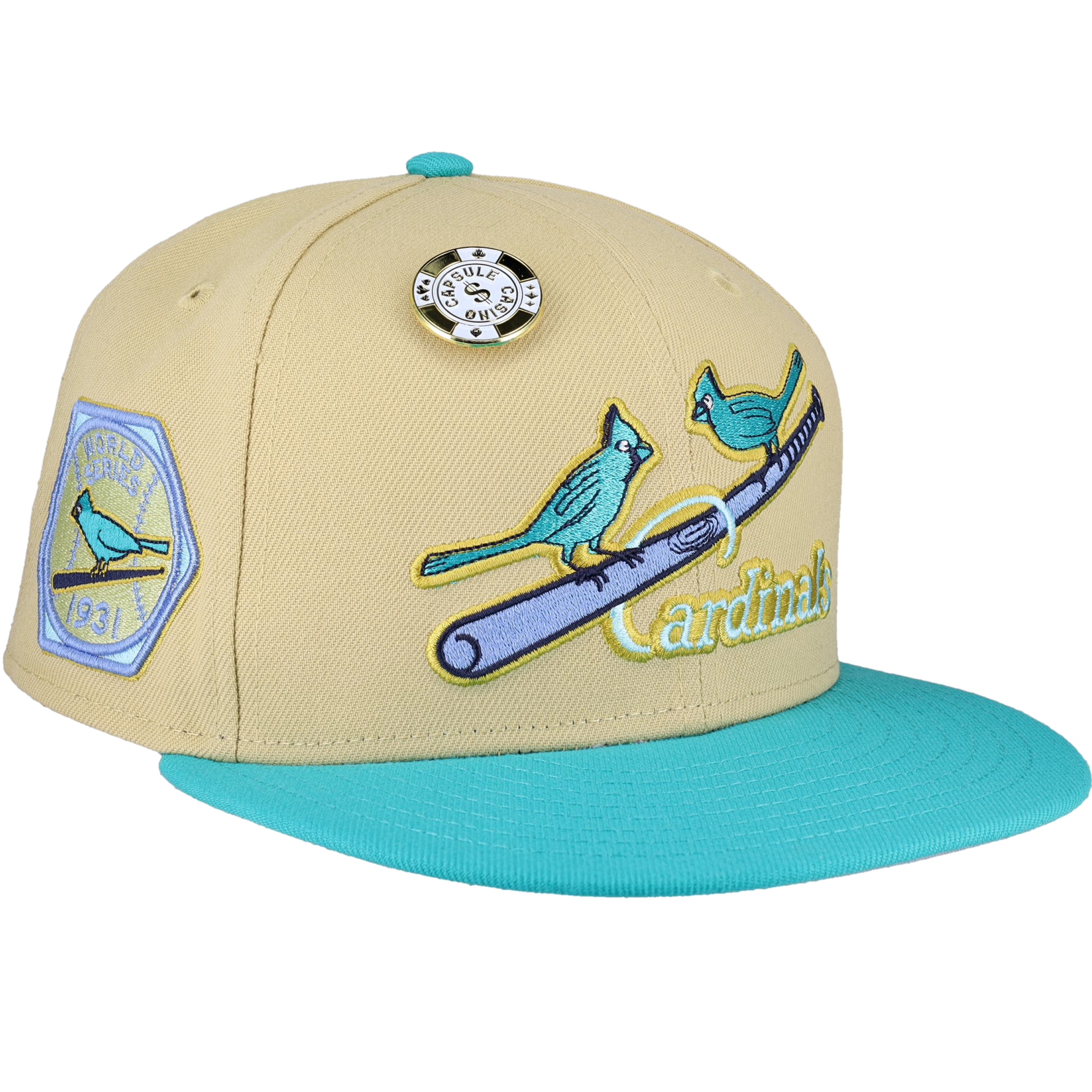 This New Era x Capsule St. Louis Cardinals Vegas Gold Collection 1931 World Series Fitted Hat was released by Capsule Hats. The fitted has a vegas gold six panel structured high crown and eyelets with a teal squatchee button. The flat bill of the fitted cap is teal with a grey undervisor. The front panel features the St. Louis Cardinals logo embroidery and a side patch embroidery on the right panel. The left panel of the fitted displays the New Era logo and the official MLB logo on the rear-crown .
