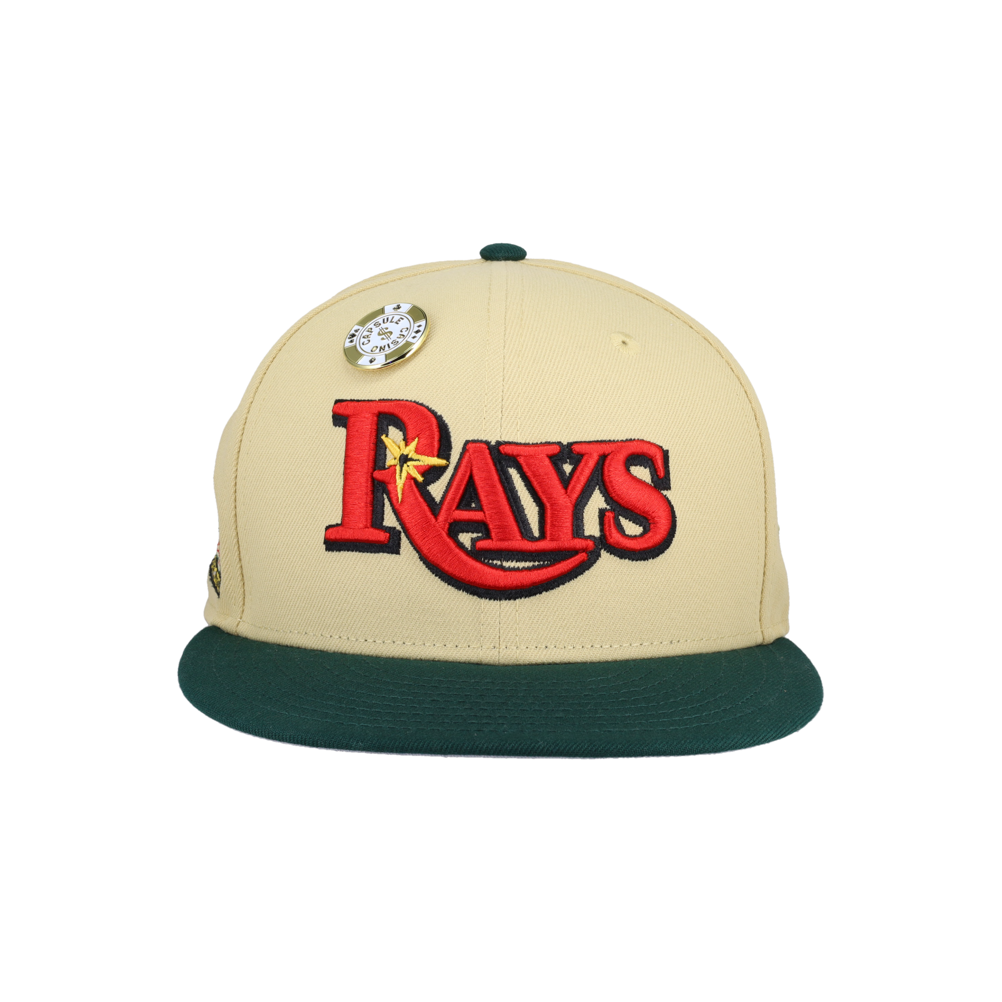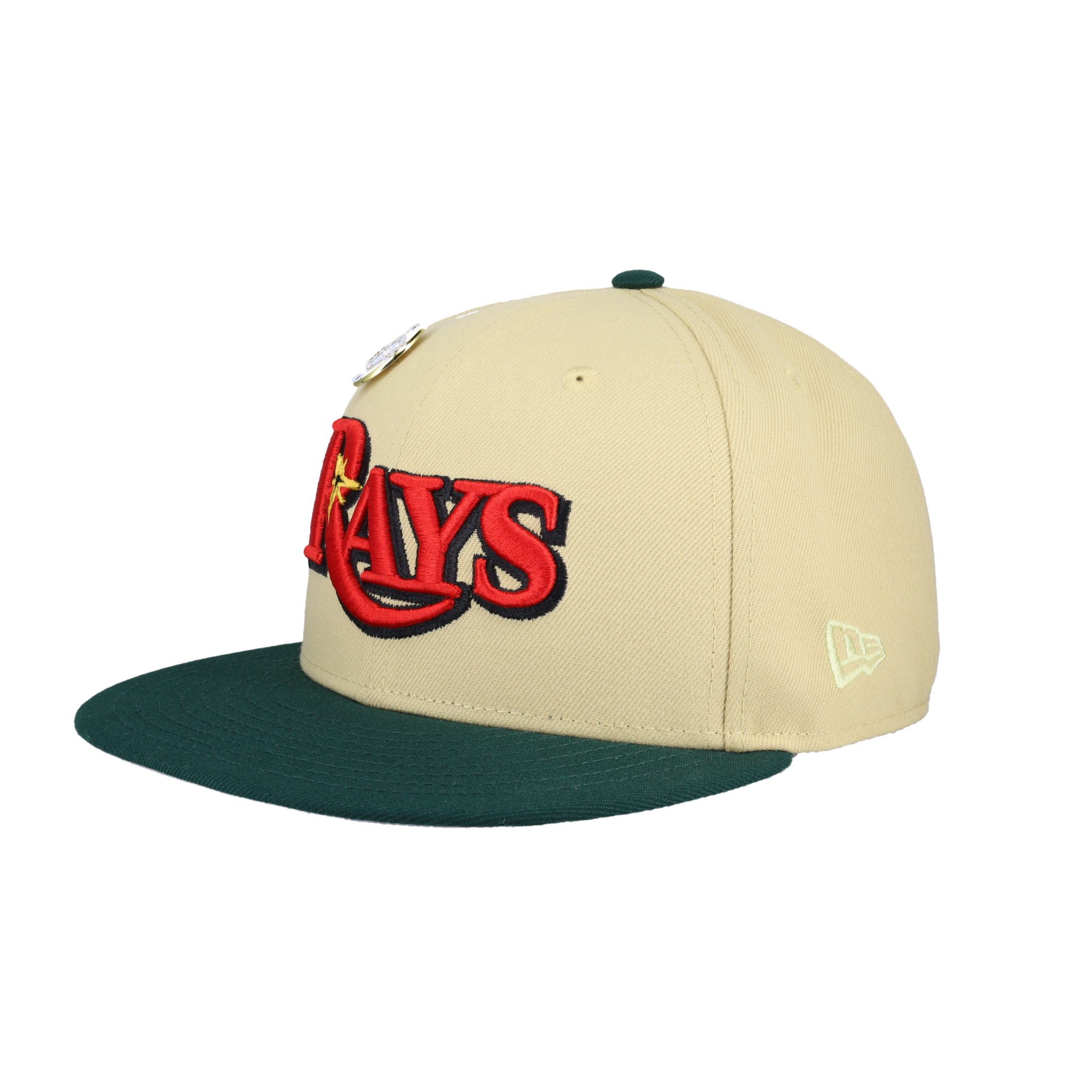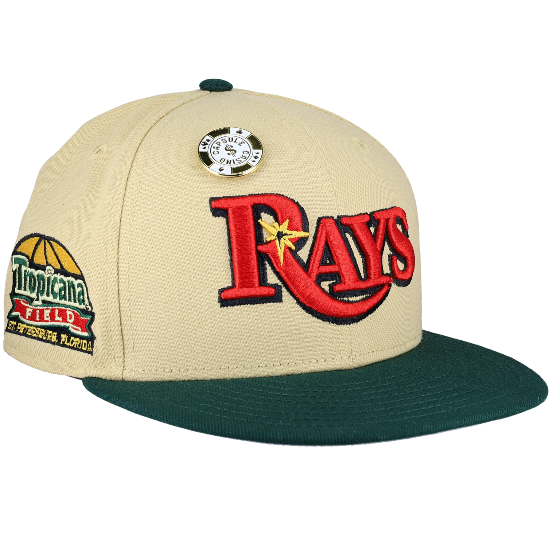 This New Era x Capsule Tampa Bay Rays Vegas Gold Collection Tropicana Field Fitted Hat was released by Capsule Hats. The fitted has a vegas gold six panel structured high crown and eyelets with a dark green squatchee button. The flat bill of the fitted cap is dark green with a grey undervisor. The front panel features the Tampa Bay Devil Rays logo embroidery and a side patch embroidery on the right panel. The left panel of the fitted displays the New Era logo and the official MLB logo on the rear-crown .