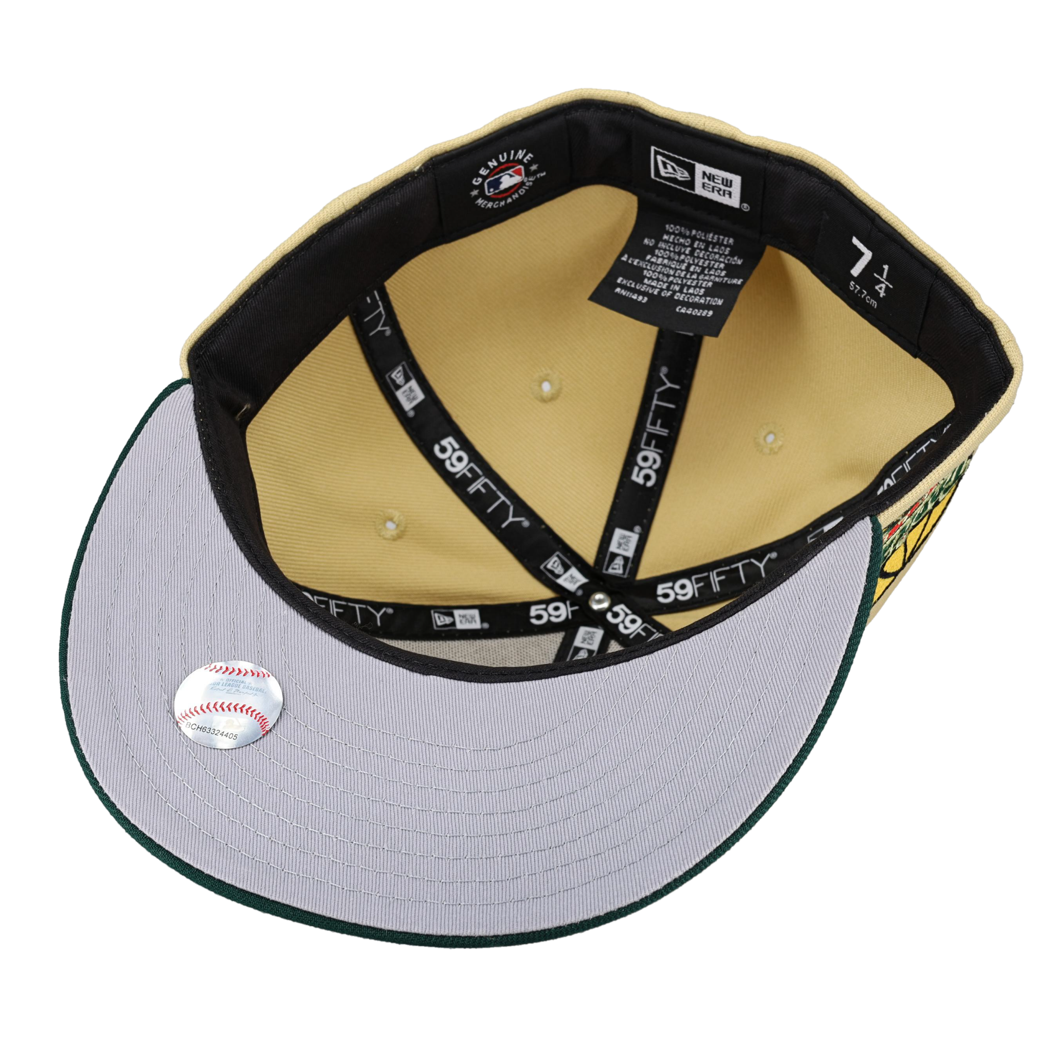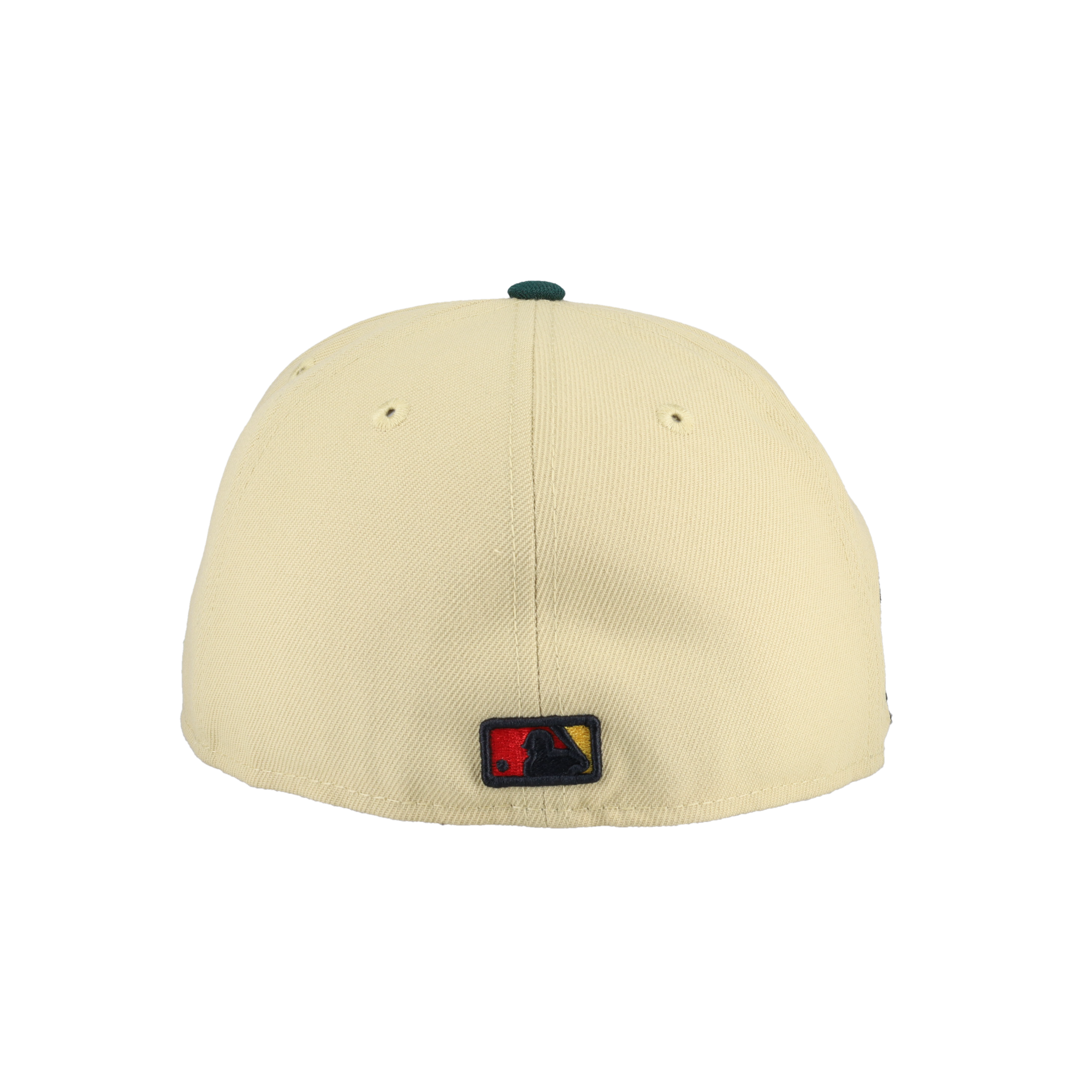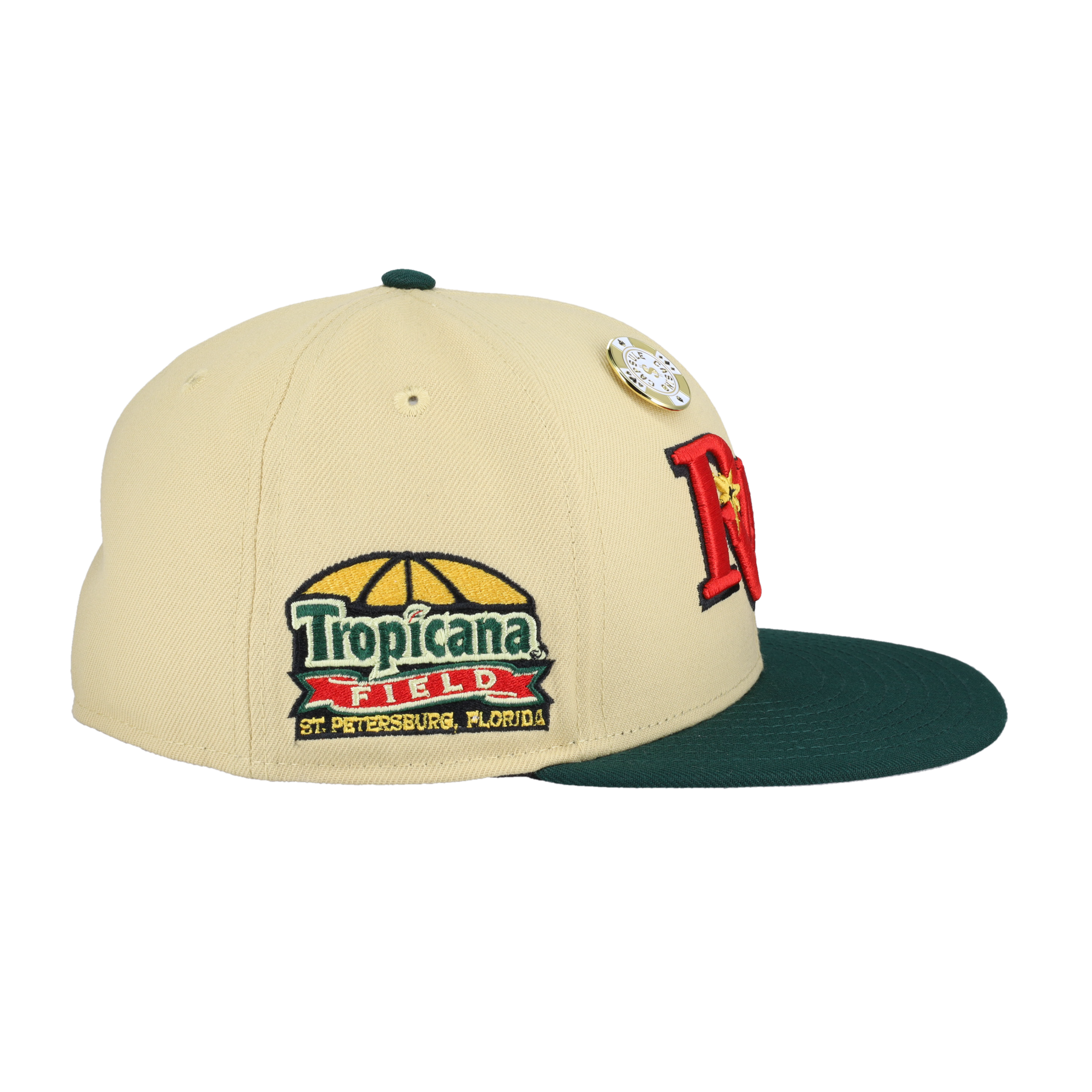 This New Era x Capsule Tampa Bay Rays Vegas Gold Collection Tropicana Field Fitted Hat was released by Capsule Hats. The fitted has a vegas gold six panel structured high crown and eyelets with a dark green squatchee button. The flat bill of the fitted cap is dark green with a grey undervisor. The front panel features the Tampa Bay Devil Rays logo embroidery and a side patch embroidery on the right panel. The left panel of the fitted displays the New Era logo and the official MLB logo on the rear-crown .
