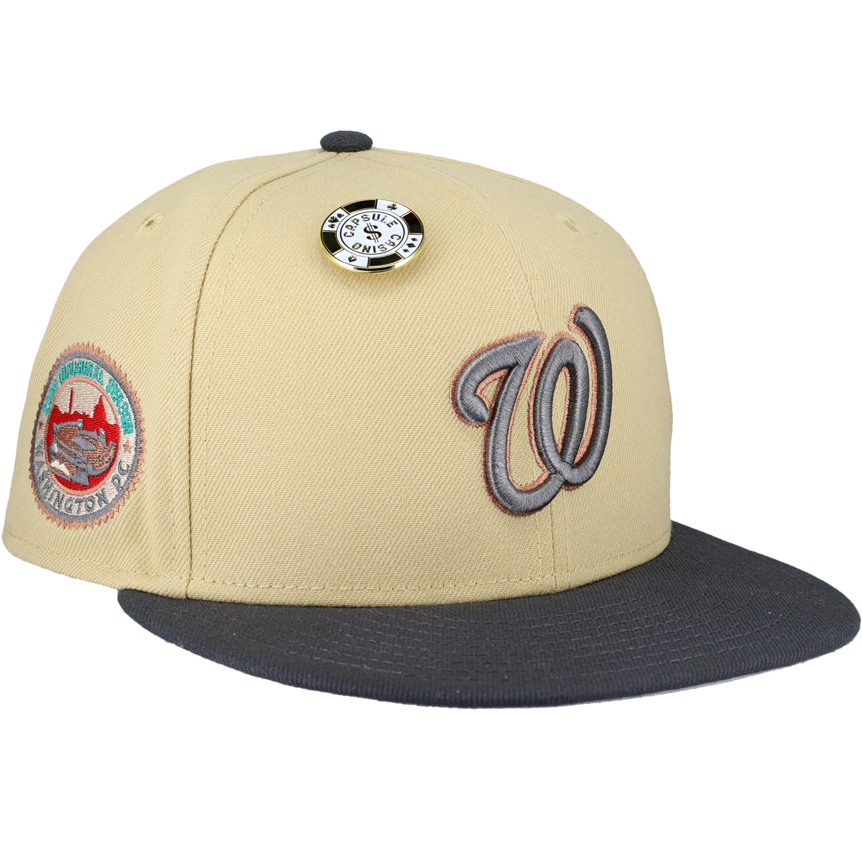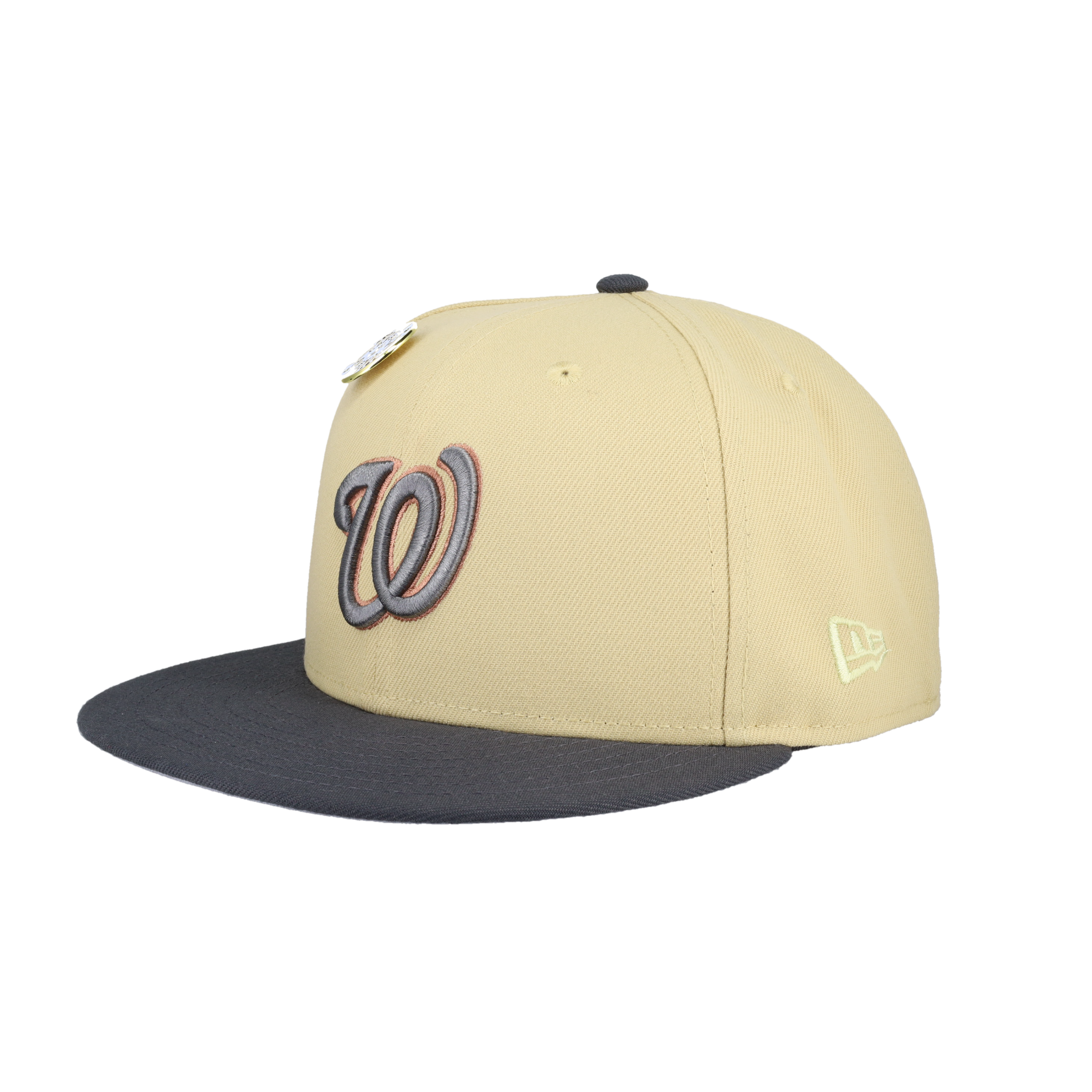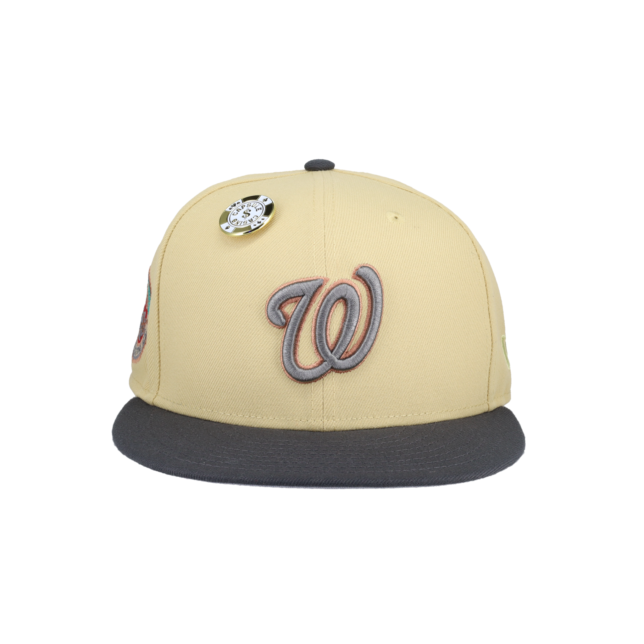This New Era x Capsule Washington Nationals Vegas Gold Collection Inaugural Season Fitted Hat was released by Capsule Hats. The fitted has a vegas gold six panel structured high crown and eyelets with a graphite squatchee button. The flat bill of the fitted cap is graphite with a grey undervisor. The front panel features the Washington Nationals logo embroidery and a side patch embroidery on the right panel. The left panel of the fitted displays the New Era logo and the official MLB logo on the rear-crown .