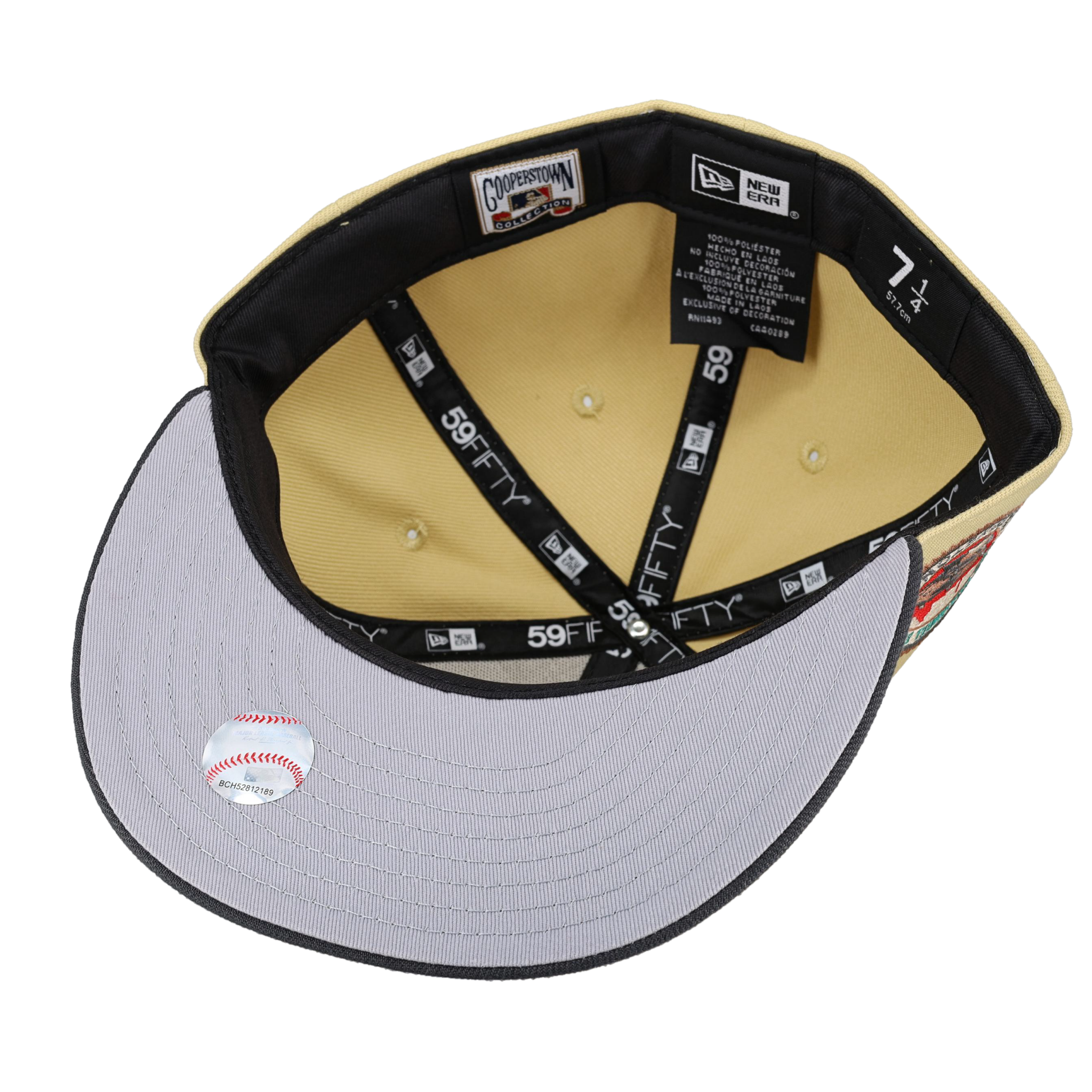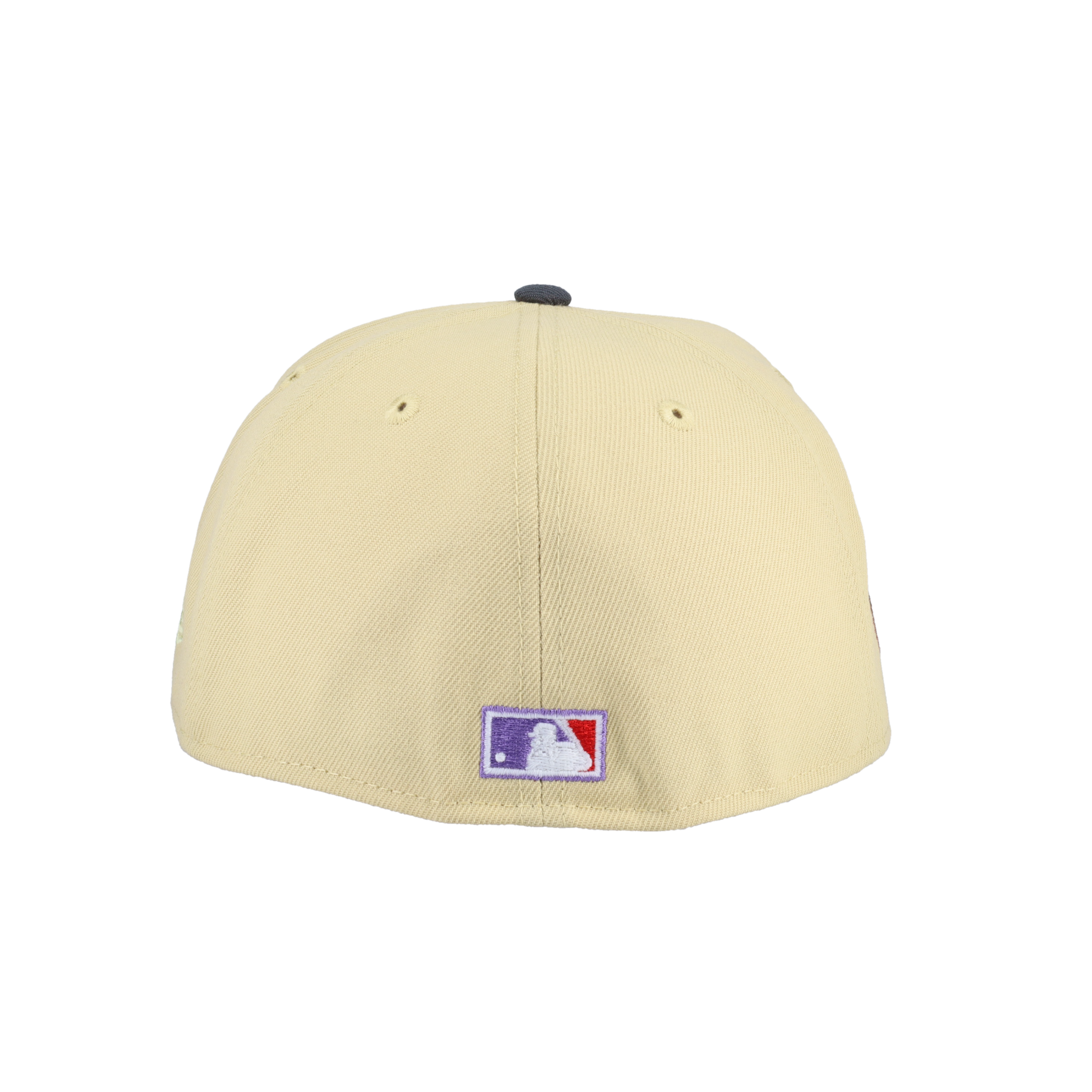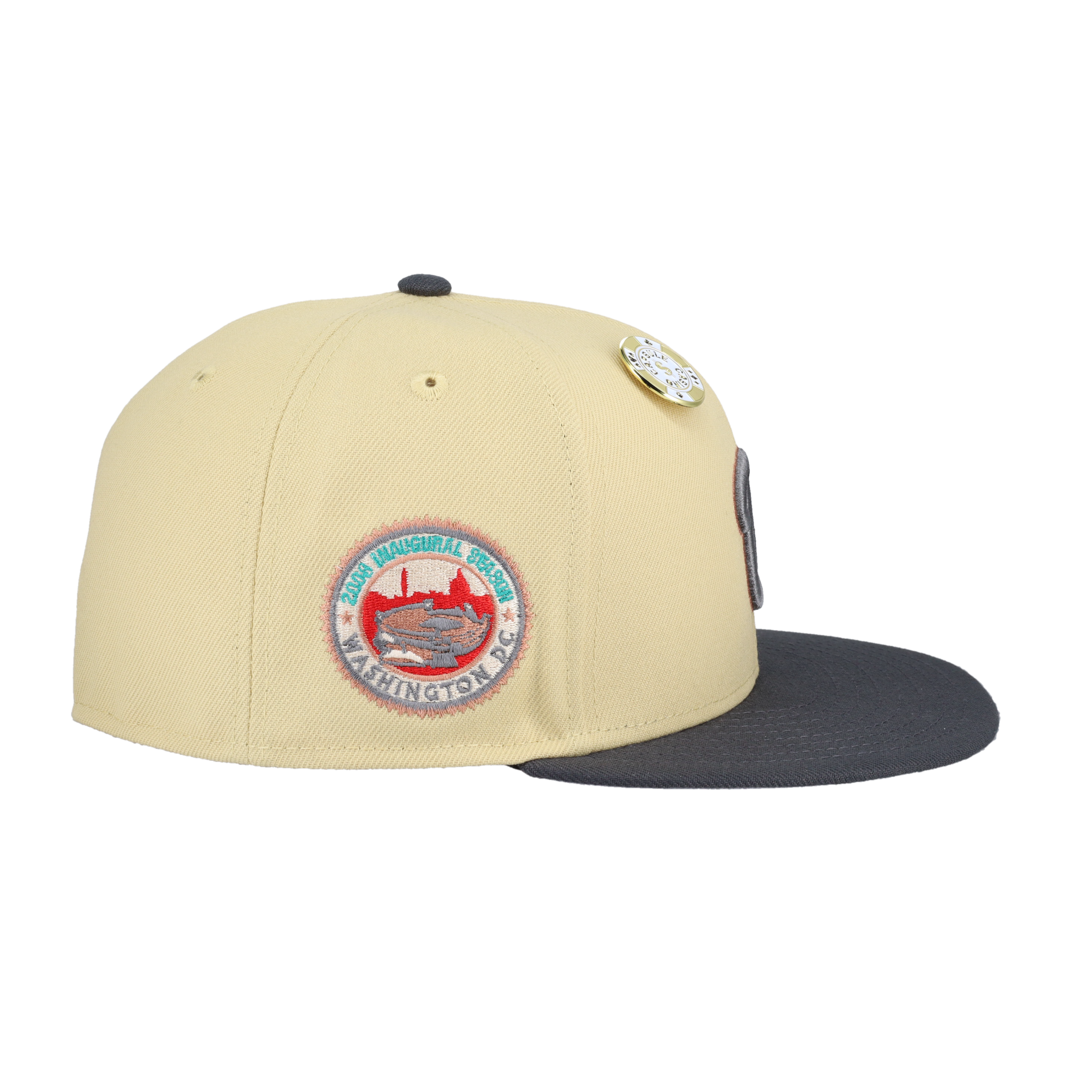 This New Era x Capsule Washington Nationals Vegas Gold Collection Inaugural Season Fitted Hat was released by Capsule Hats. The fitted has a vegas gold six panel structured high crown and eyelets with a graphite squatchee button. The flat bill of the fitted cap is graphite with a grey undervisor. The front panel features the Washington Nationals logo embroidery and a side patch embroidery on the right panel. The left panel of the fitted displays the New Era logo and the official MLB logo on the rear-crown .