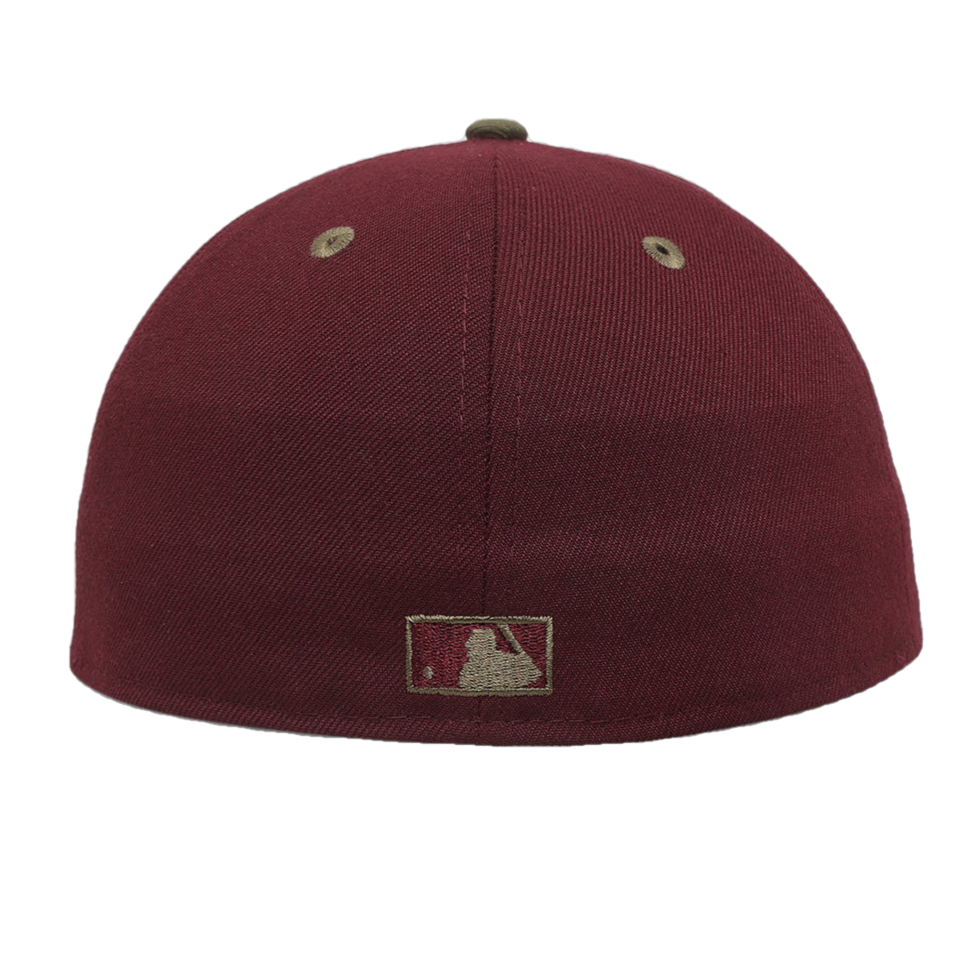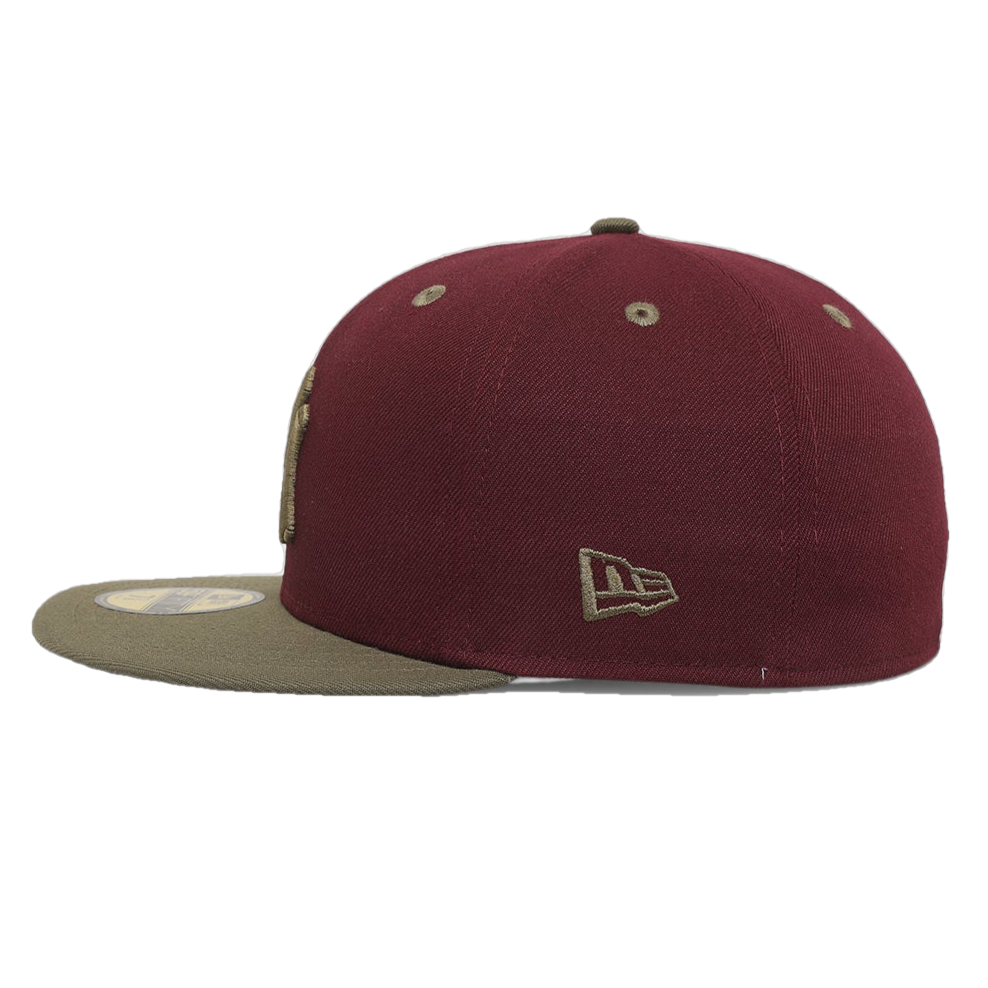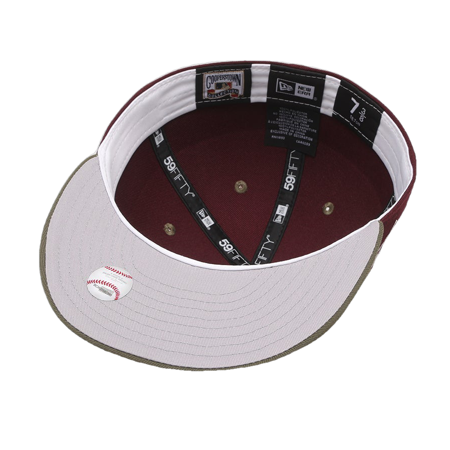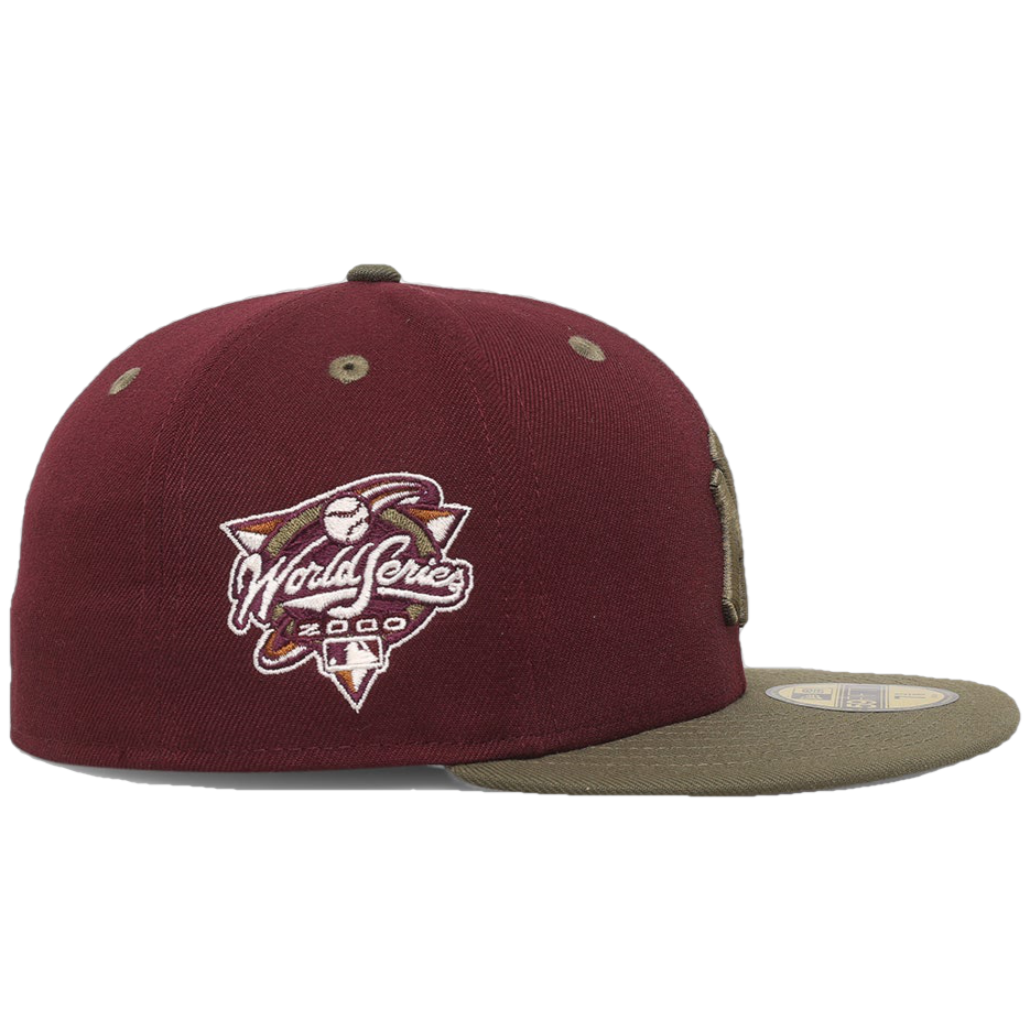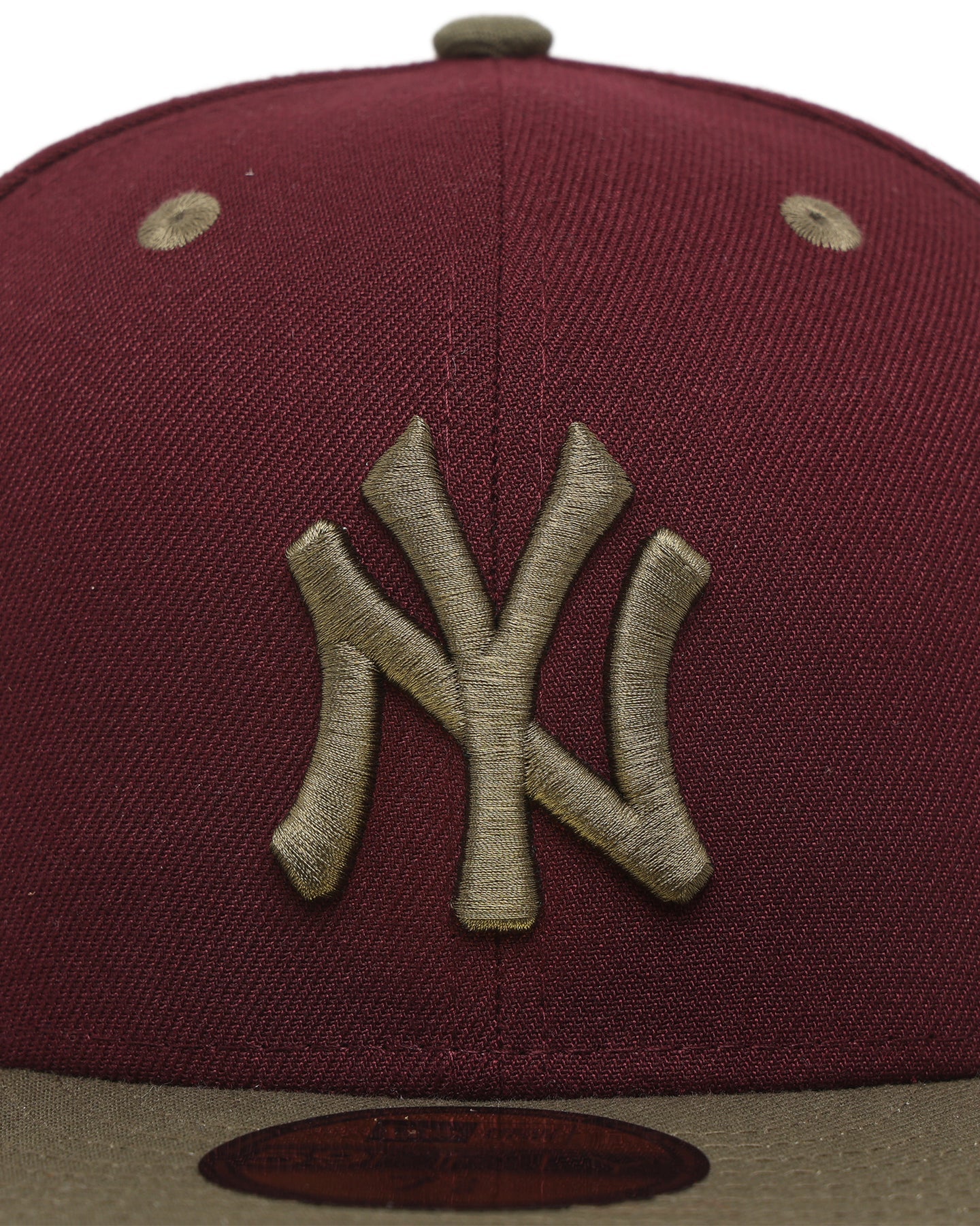 This New Era x Culture Kings New York Yankees 'Burgundy World Series' 59FIFTY Fitted Hat was released by Culture Kings. The fitted cap features a six panel structured high crown and embroidered eyelets with a fabric squatchee button and flat bill. The fitted has an undervisor and a sweatband as well. The front panel includes the New York Yankees logo embroidery and the New Era logo embroidered on the left panel.