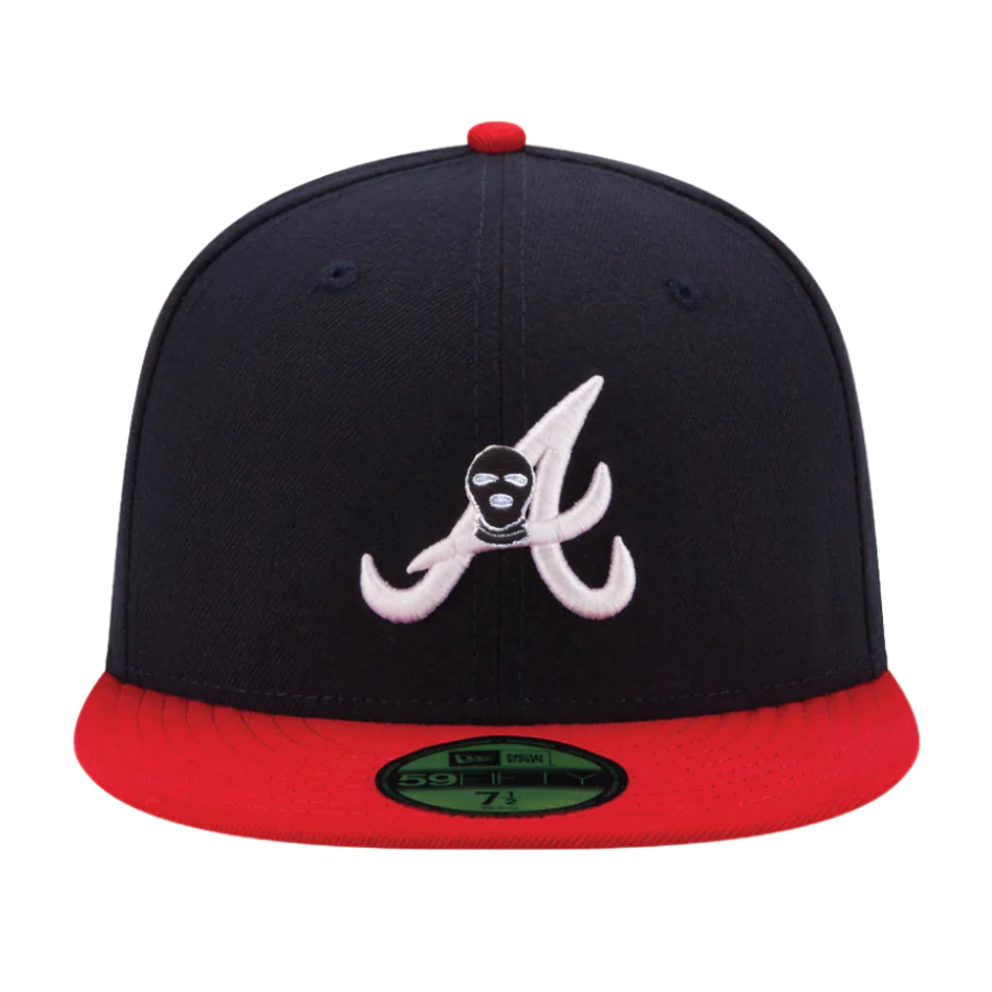 This customized New Era x Dumbfreshco Atlanta Braves 59FIFTY Fitted Hat has a navy six panel structured high crown and embroidered eyelets, with a red fabric squatchee button and flat bill. The front panel features Dumbfreshco logo ontop of the Atlanta Braves team logo embroidery.