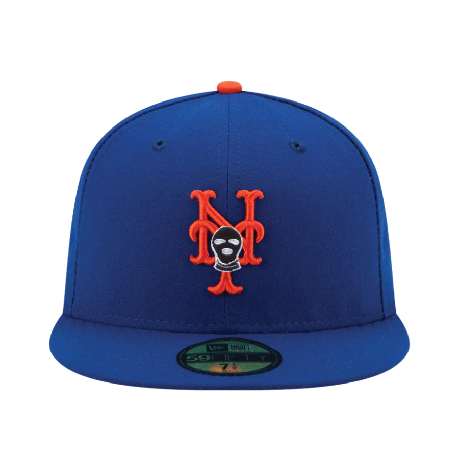 This customized New Era x Dumbfreshco New York Mets Blue/Orange 59FIFTY Fitted Hat has a blue six panel structured high crown, orange embroidered eyelets, blue fabric squatchee button and flat bill. The front panel features Dumbfreshco logo ontop of the New York Mets team logo embroidery.