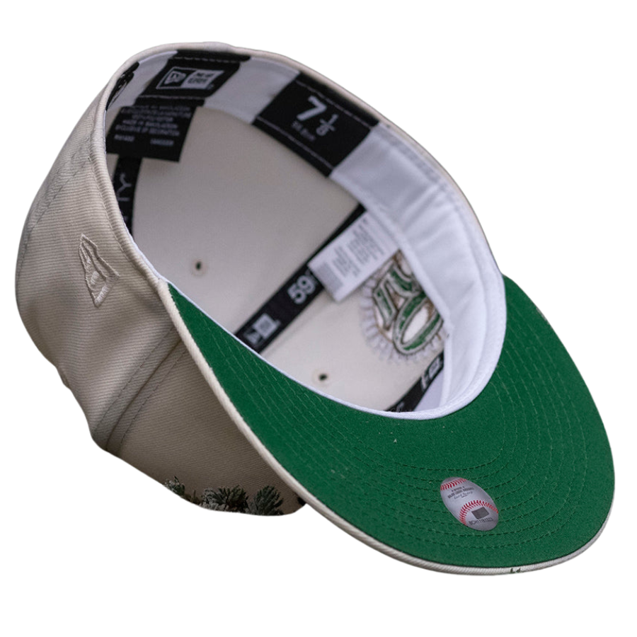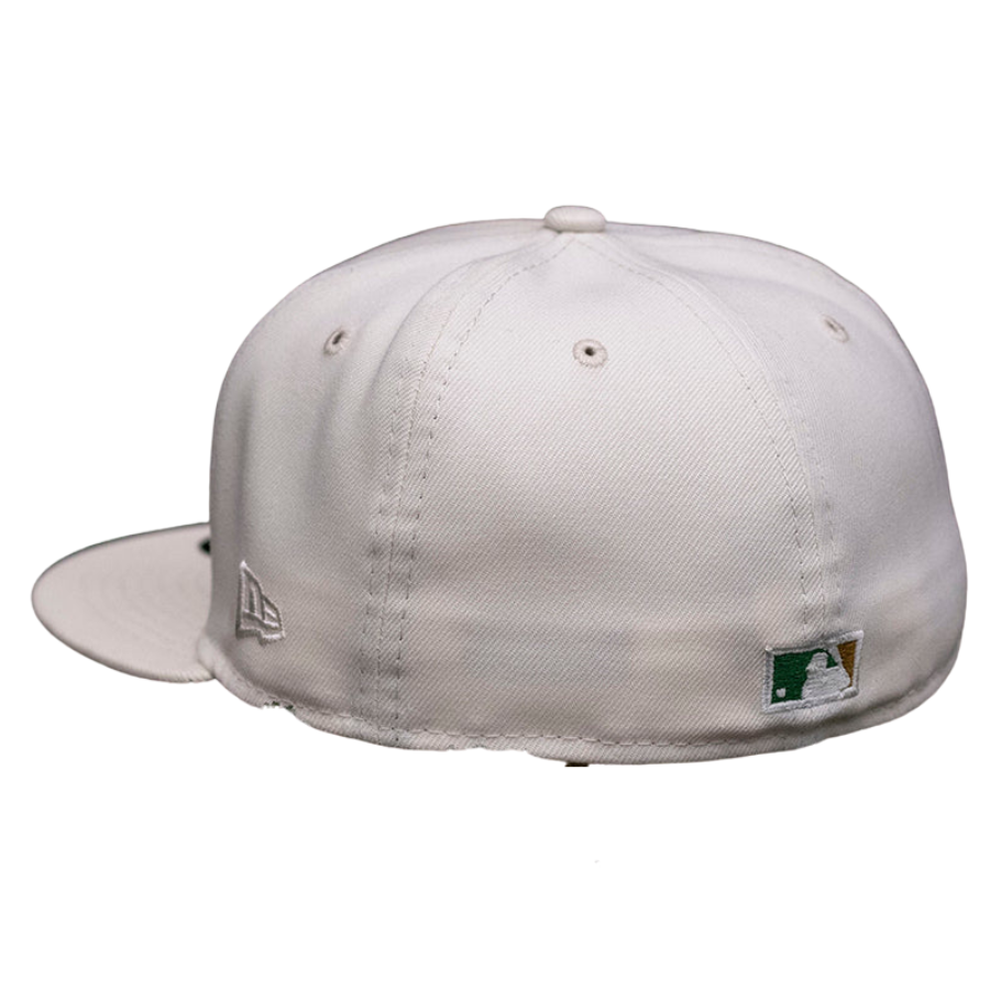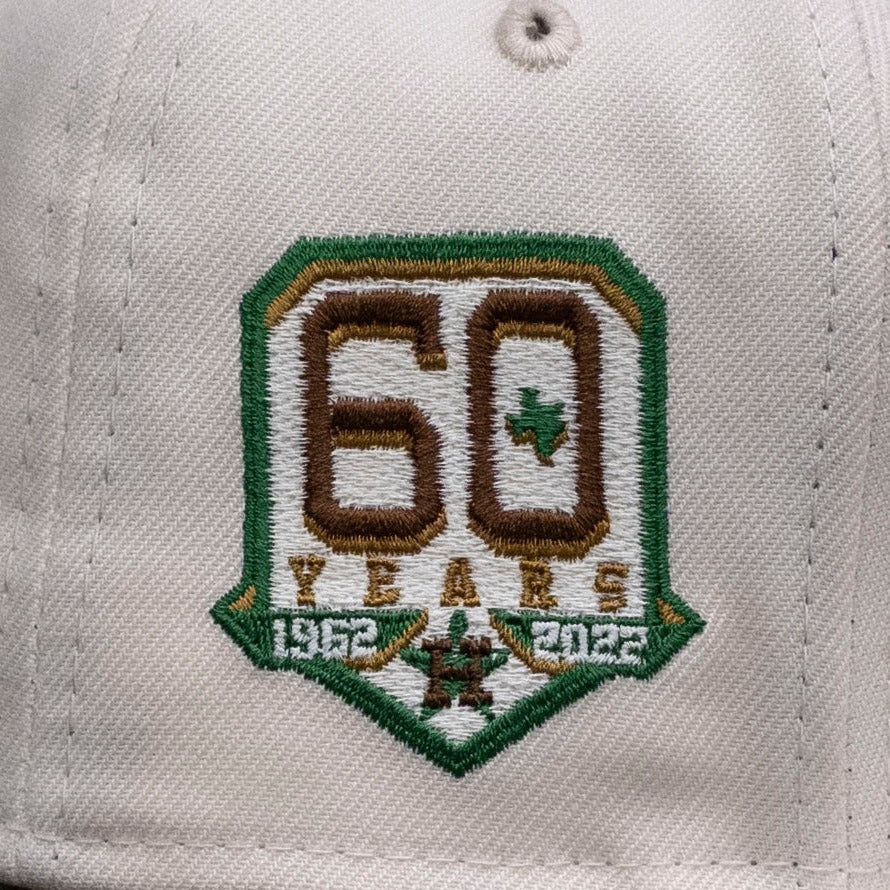 This New Era Houston Astros 59FIFTY fitted hat has a white six panel structured high crown, embroidered eyelets and fabric squatchee button. The fitted cap also has a white flat bill with a kelly green undervisor and white sweatband. The front panel features the Houston Astros logo embroidery and a 60 Years side patch embroidery on the right panel. The left panel of the fitted displays the New Era logo and the official MLB Batterman logo embroidery on the rear crown.
