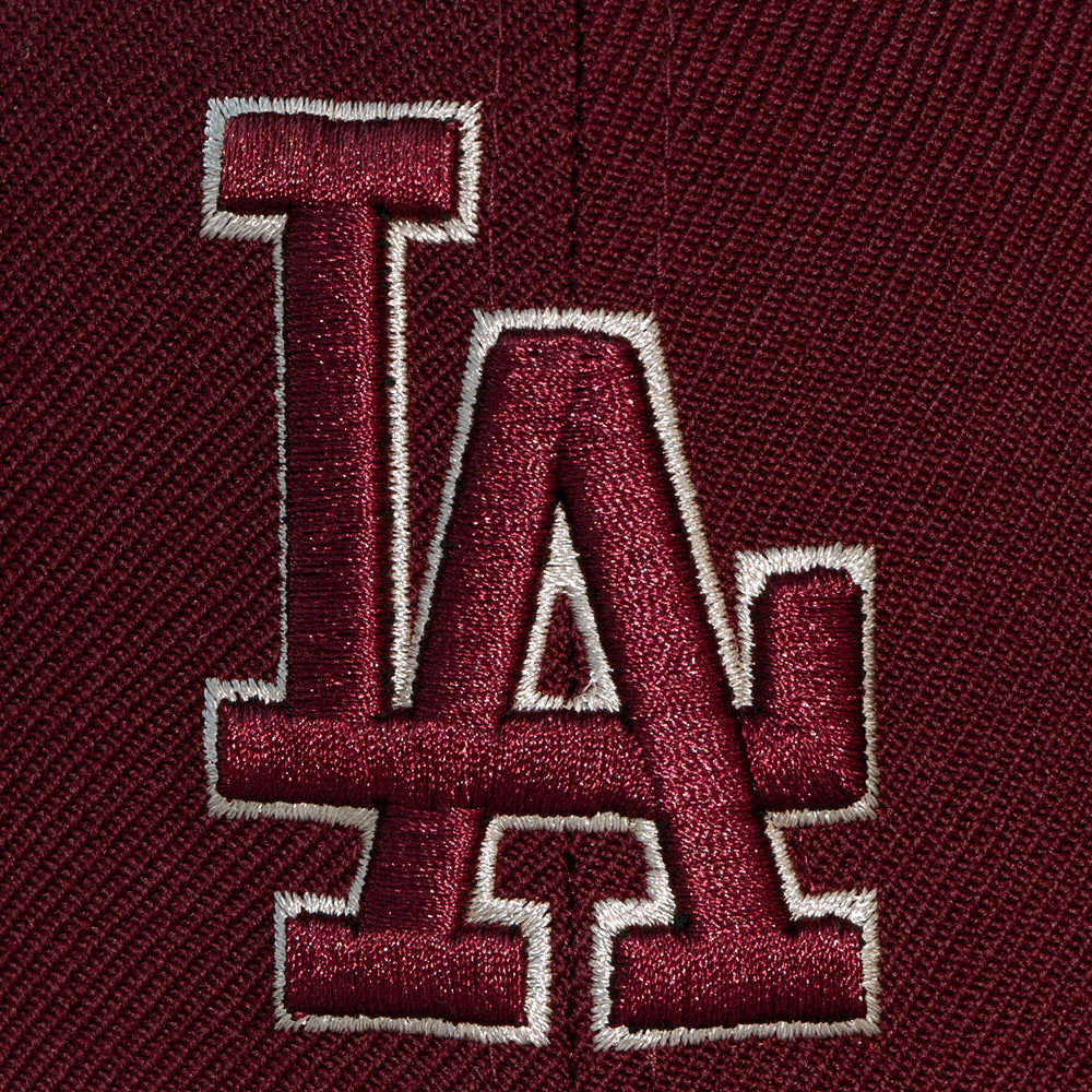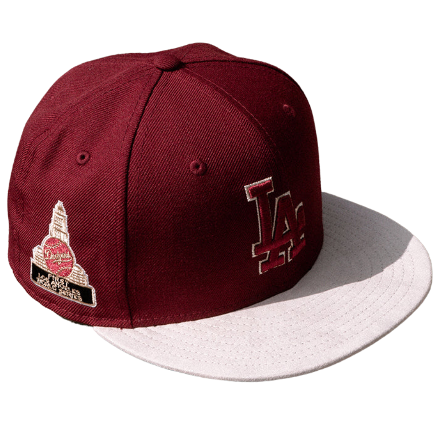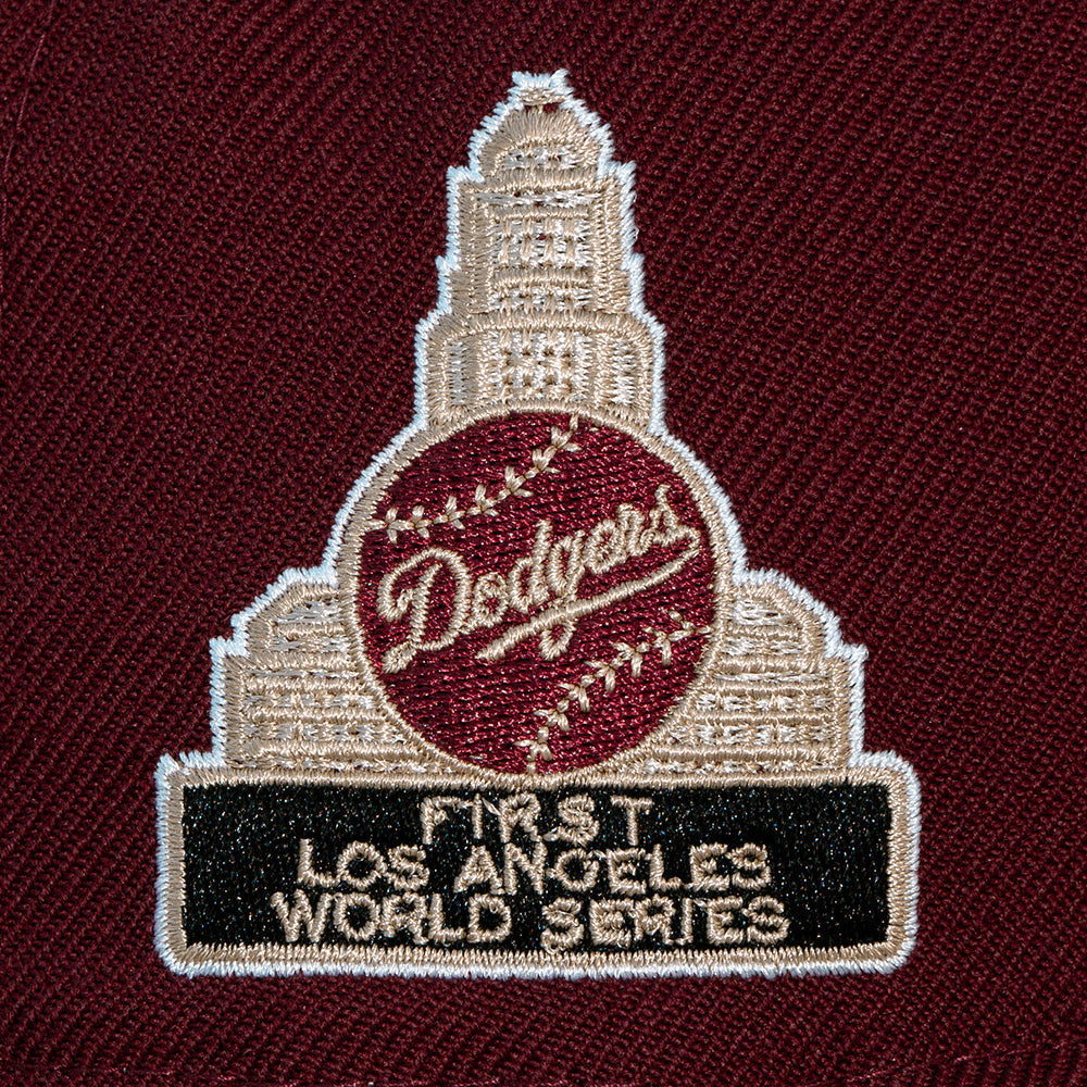 This New Era x FAM Los Angeles Dodgers World Series Suede 59FIFTY Fitted Cap was released by FAM. The fitted has a burgundy six panel structured high crown, embroidered eyelets and fabric squatchee button. The fitted cap has a stone (approximate color) flat bill with a kelly green undervisor and white sweatband. The front panel features the LA Dodgers logo embroidery and a "First Los Angeles World Series" side patch embroidery on the right panel. The left panel of the fitted displays the New Era logo and the official MLB logo embroidery on the rear crown.