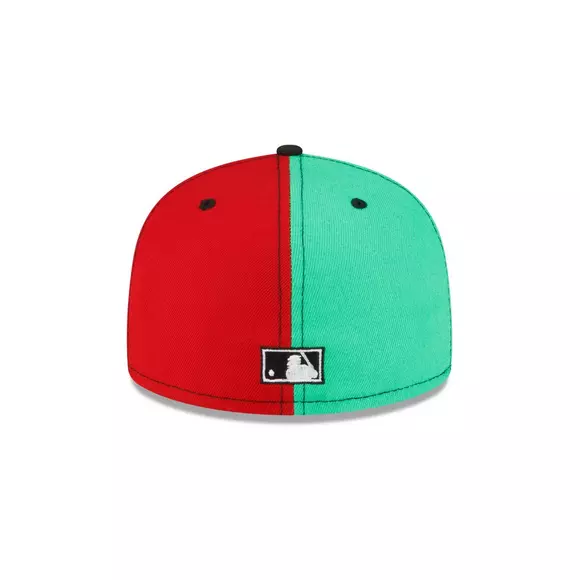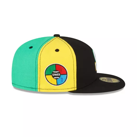 This New Era x Hibbett Seattle Mariners Holiday Games Simon 59FIFTY Fitted Hat has a split colored crown of black, blue, yellow, green and red. The fitted has a grey undervisor with a unique side patch on the right panel.
