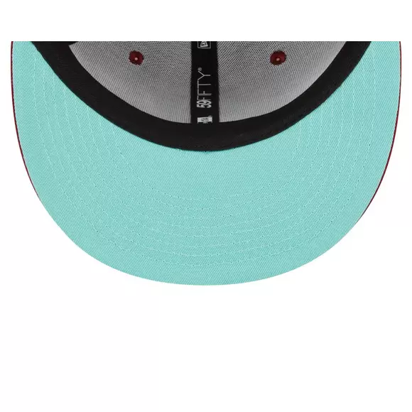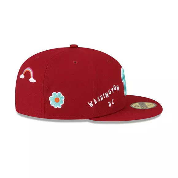 This New Era x Hibbett Washington Nationals Have A Happy Day Pack 59FIFTY Fitted Hat has a cardinal red/burgundy six panel structured high crown, embroidered eyelets and flat bill. The fitted has a mint blue undervisor with a black sweatband. The front panel includes the Washington Nationals logo embroidered in mint blue stitching with graphics allover the crown.