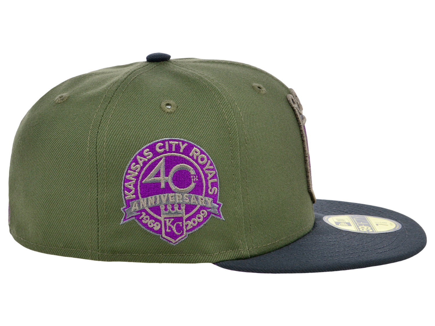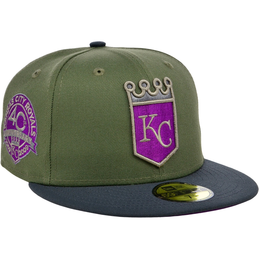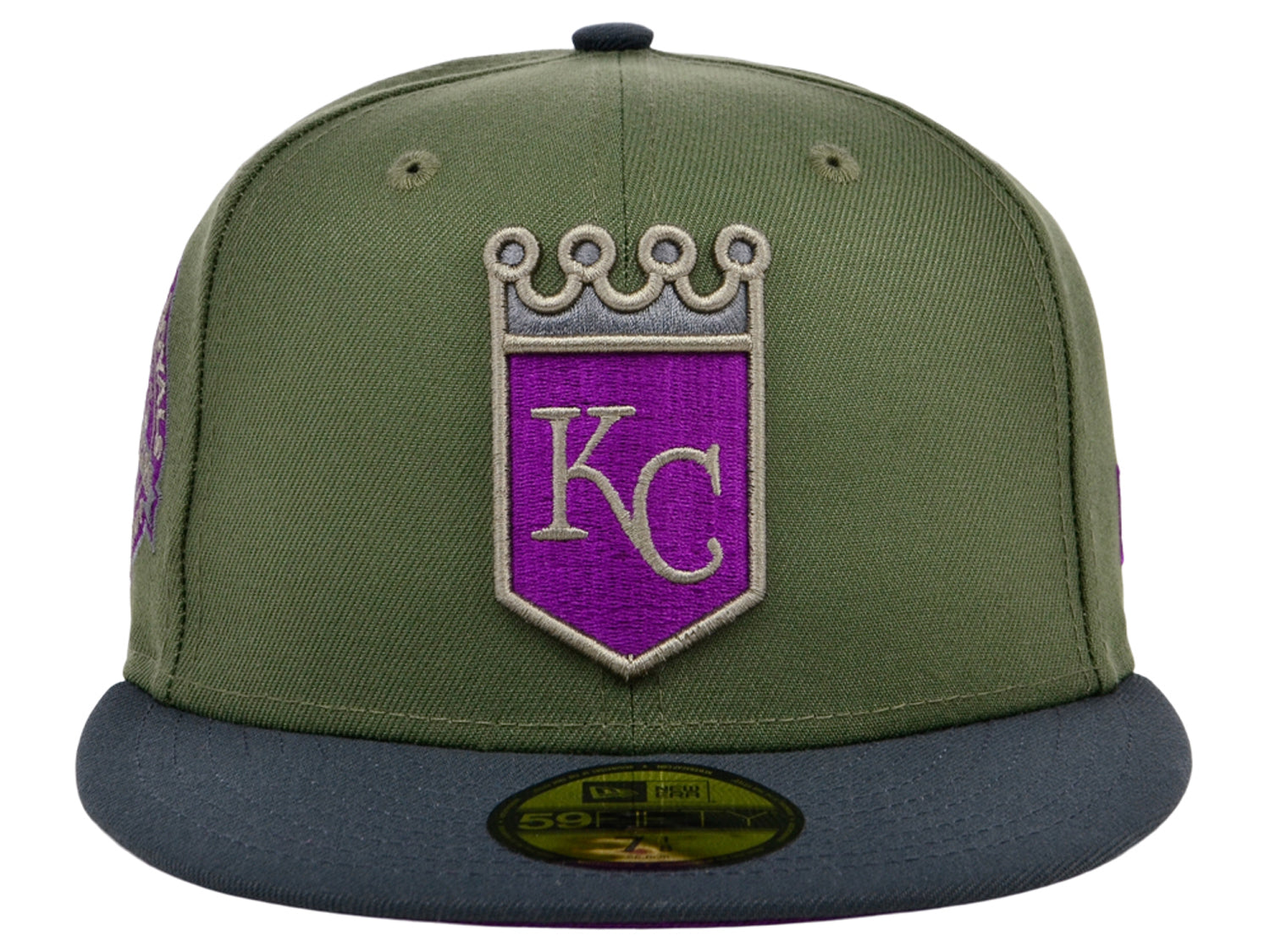 Lids Hat Drop is excited to bring unique and exclusive colorways to your favorite MLB team. This New Era Kansas City Royals Mossy Haze 59FIFTY fitted hat has a high crown, is structured with a flat rounded bill, threaded rivets, and a team patch to highlight the achievements. Find the look the fits your collection or wardrobe.