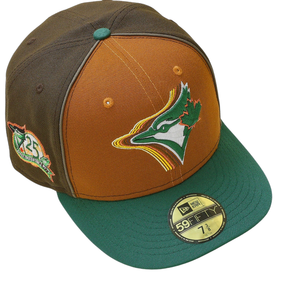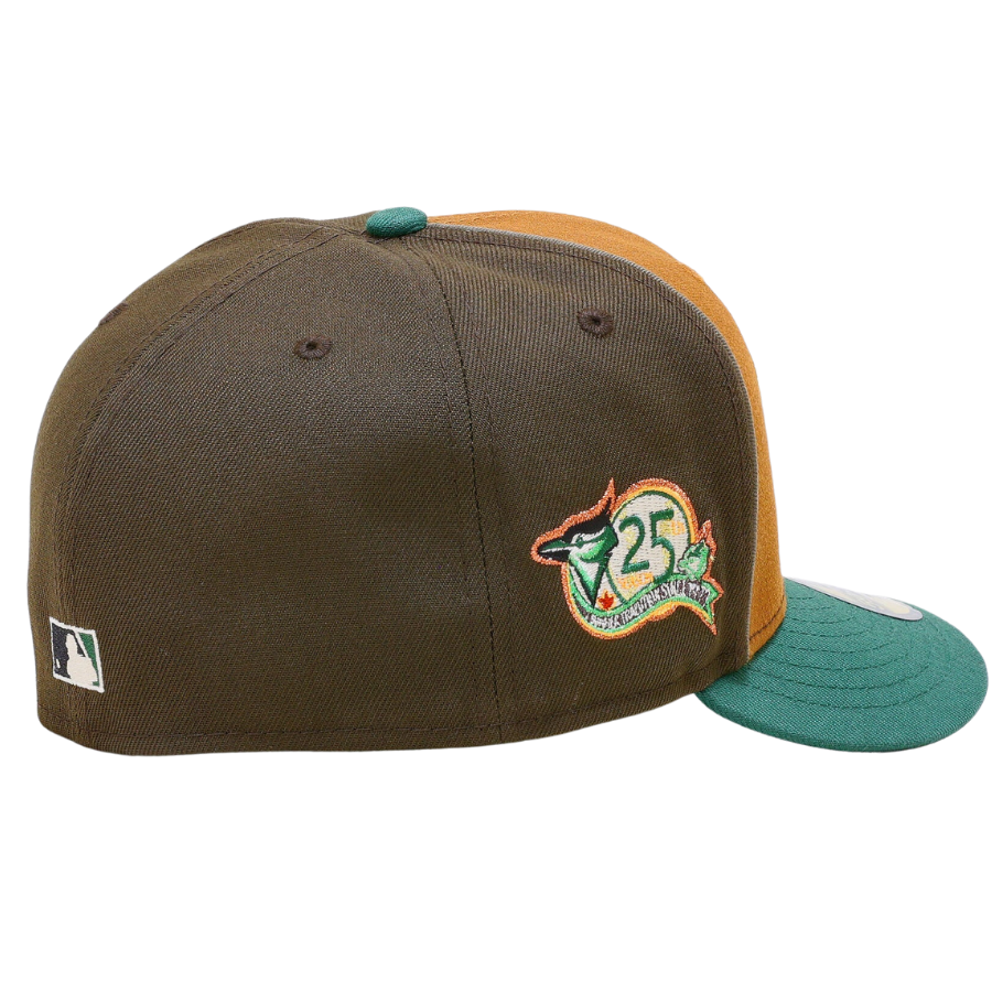 This New Era Toronto Blue Jays 59FIFTY fitted hat was released by My Fitteds. The two back and side panels of the six panel structured high crow are dark brown with a toasted peanut two front panel. The fabric squatchee button and the visor of the fitted is dark green. The front panel includes the Toronto Blue Jays logo embroidered in a prism like fashion with a 25th Anniversary side patch on the right panel.