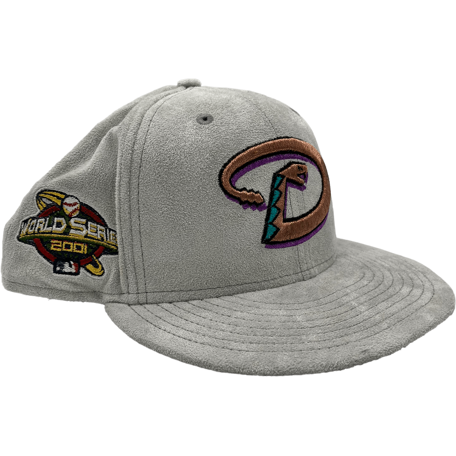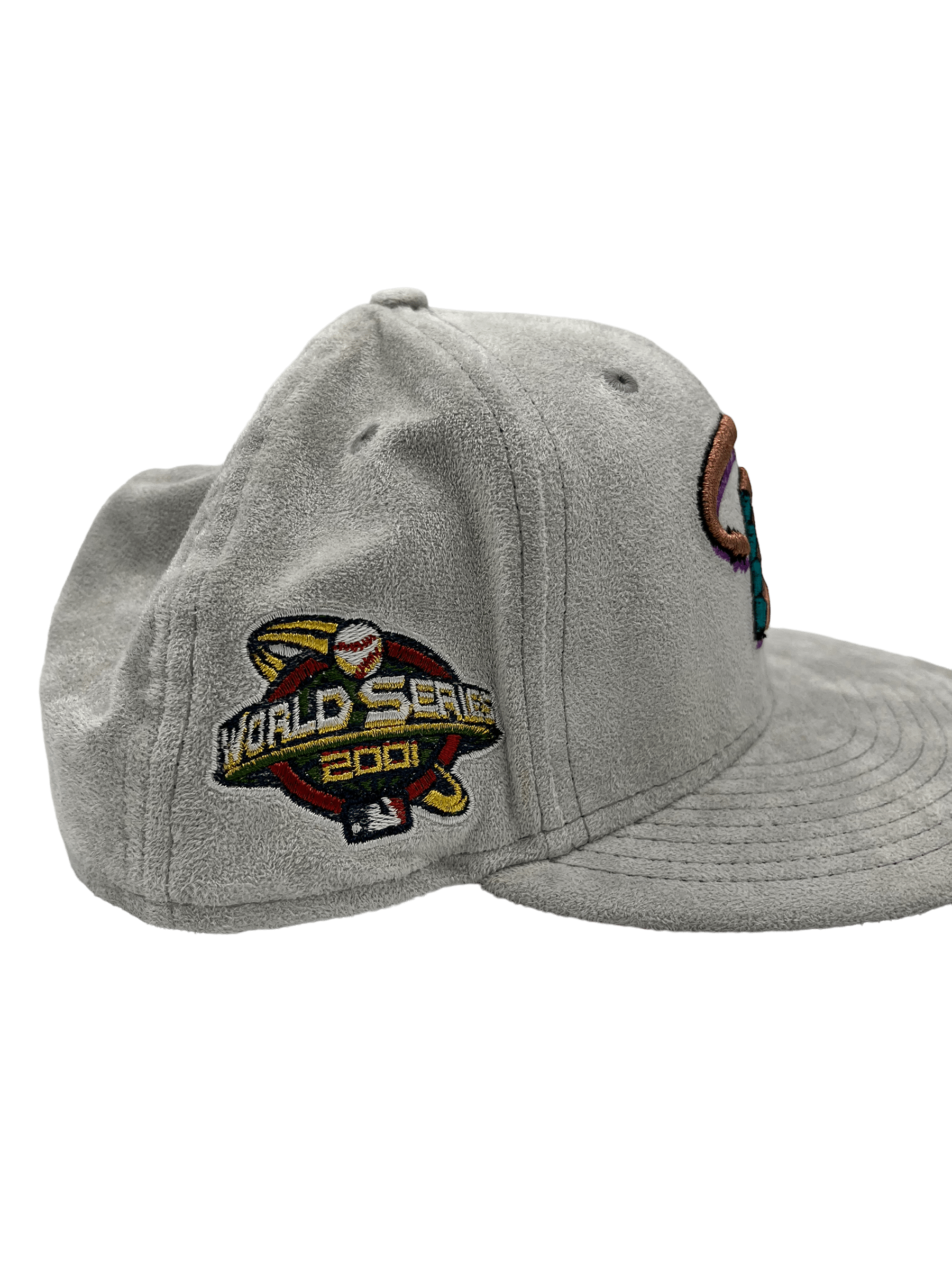 This New Era x Pro Image Sports Arizona Diamondbacks Gray Metallic Suede 59FIFTY Fitted Hat is an exclusive release by Pro Image Sports. The fitted has a gray metallic suede six panel structured high crown, eyelets and squatchee button. The flat bill of the fitted cap is also gray metallic suede with a blue undervisor and white sweatband. The front panel features the Arizona Diamondbacks logo embroidery