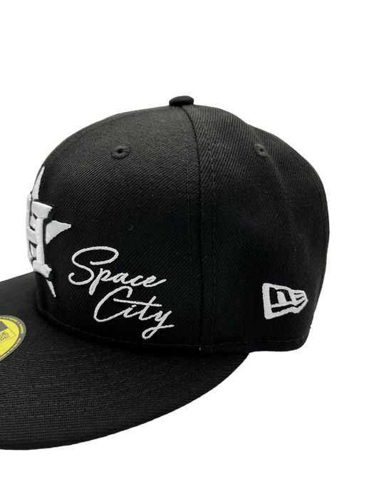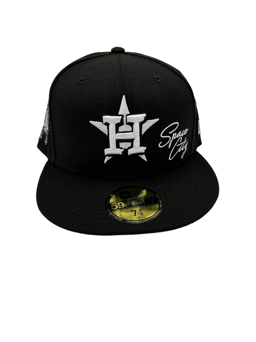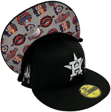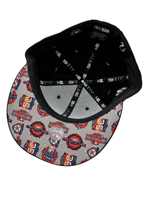 This New Era x Pro Image Sports Houston Astros UV 2023 59FIFTY Fitted Hat has a black six panel structured high crown and embroidered eyelets with a black fabric squatchee button. The fitted cap also has a black flat bill with an all over celebratory graphic undervisor. The front panel features the Houston Astros logo embroidery and a graphic side patch embroidery on the right panel. The left panel of the fitted displays the New Era logo and the official MLB logo embroidery on the rear crown.