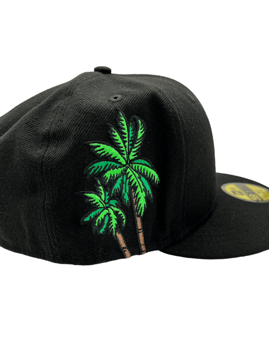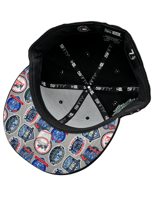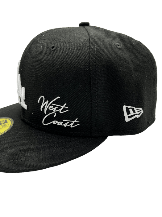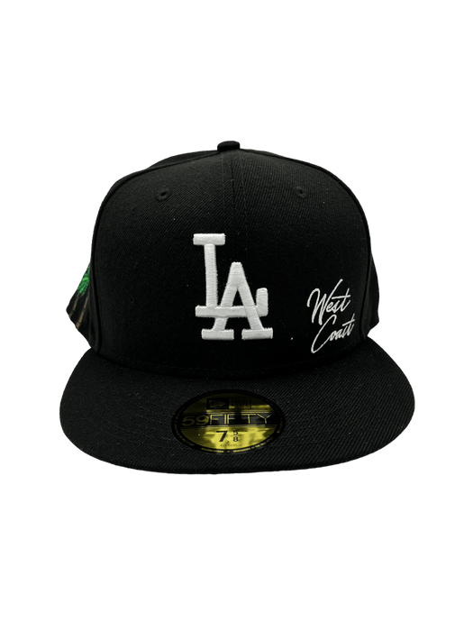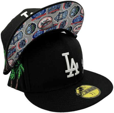 This New Era x Pro Image Sports Los Angeles Dodgers Logo UV 2023 59FIFTY Fitted Hat has a black six panel structured high crown and embroidered eyelets with a black fabric squatchee button. The fitted cap also has a black flat bill with an all over celebratory graphic undervisor. The front panel features the LA Dodgers logo embroidery and a graphic side patch embroidery on the right panel. The left panel of the fitted displays the New Era logo and the official MLB logo embroidery on the rear crown.