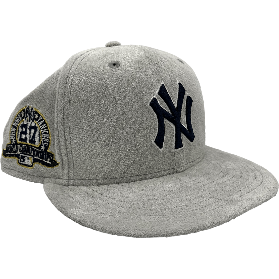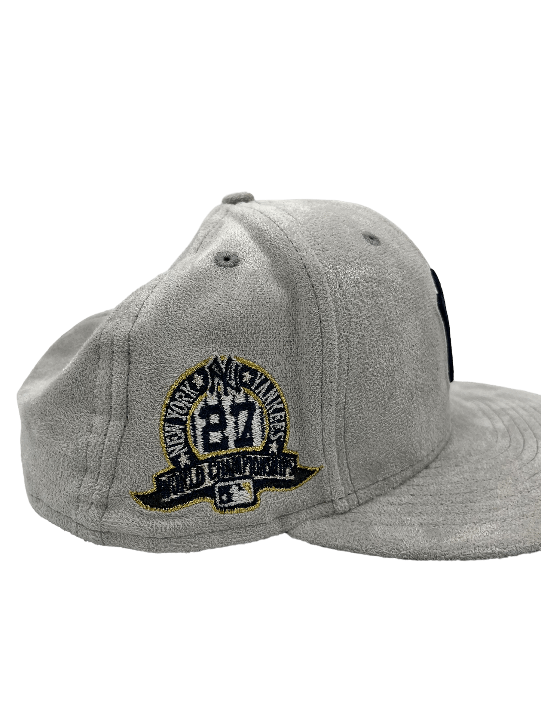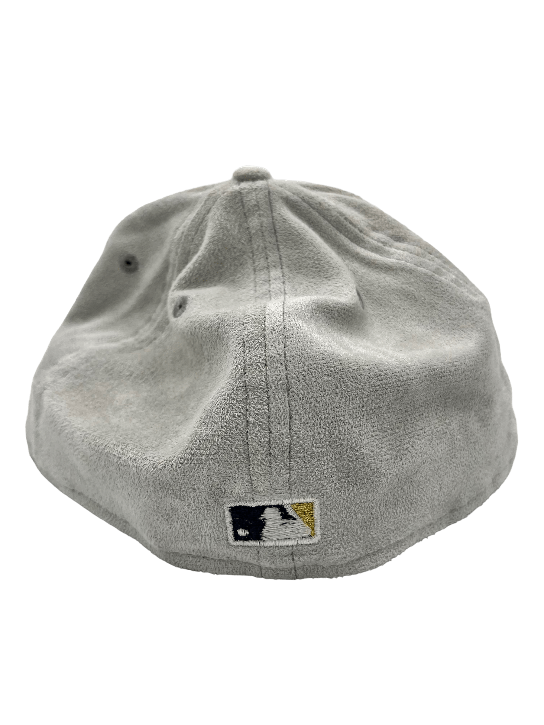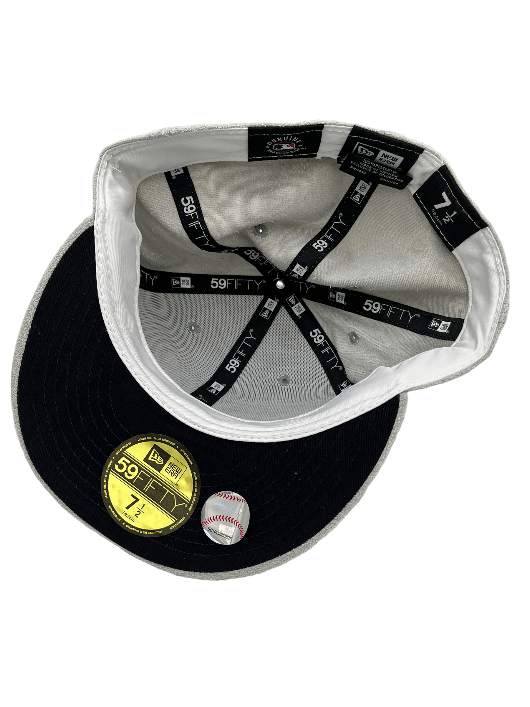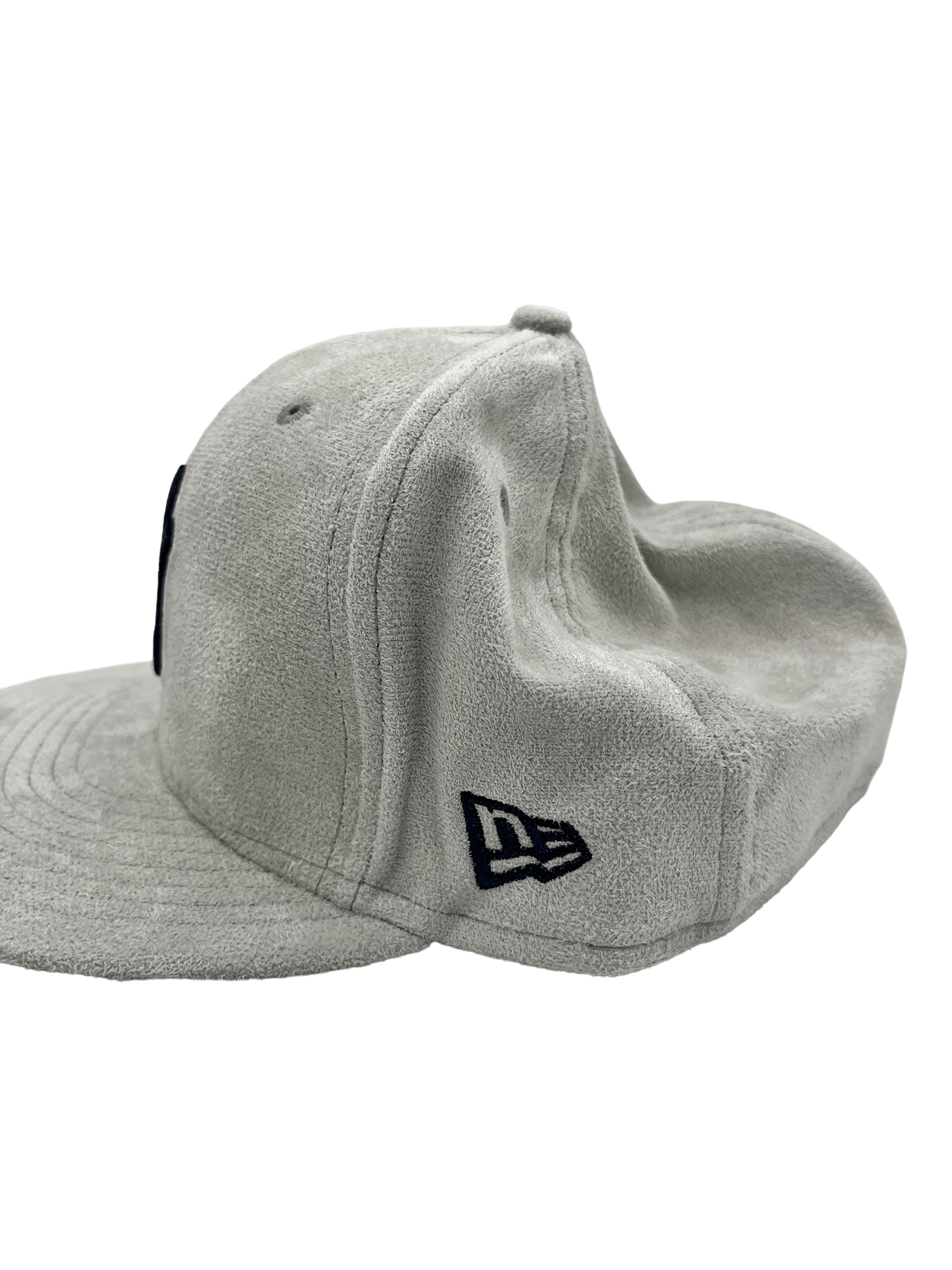 This New Era x Pro Image Sports New York Yankees Gray Metallic Suede 59FIFTY Fitted Hat is an exclusive release by Pro Image Sports. The fitted has a gray metallic suede six panel structured high crown, eyelets and squatchee button. The flat bill of the fitted cap is also gray metallic suede with a navy blue undervisor and white sweatband. The front panel features the New York Yankees logo embroidered in navy stitching with a World Champions side patch embroidery on the right panel. The left panel of the fitted displays the New Era logo and the official MLB logo on the rear-crown .