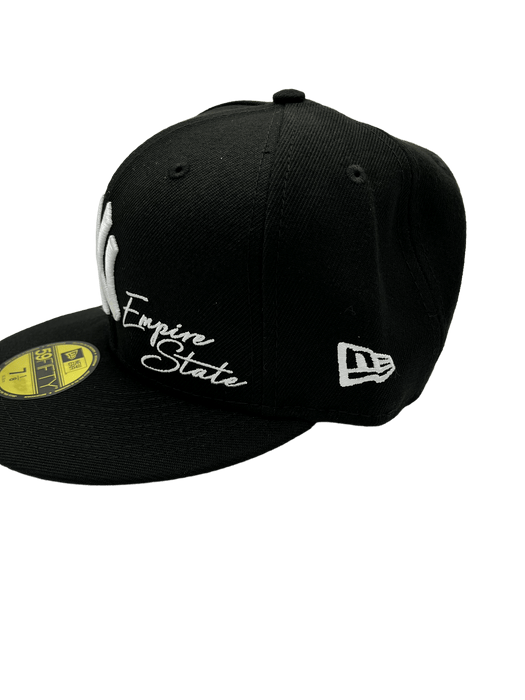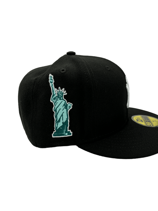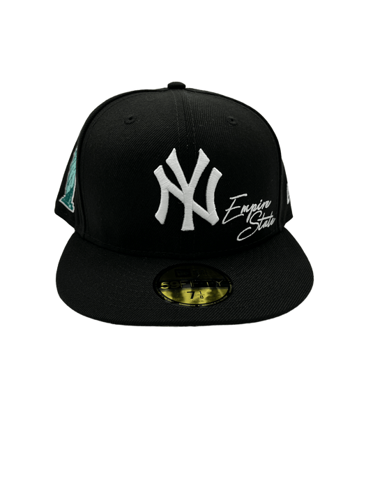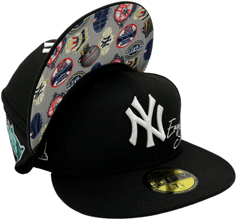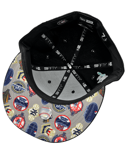 This New Era x Pro Image Sports New York Yankees Logo UV 2023 59FIFTY Fitted Hat has a black six panel structured high crown and embroidered eyelets with a black fabric squatchee button. The fitted cap also has a black flat bill with an all over celebratory graphic undervisor. The front panel features the New York Yankees logo embroidery and a graphic side patch embroidery on the right panel. The left panel of the fitted displays the New Era logo and the official MLB logo embroidery on the rear crown.