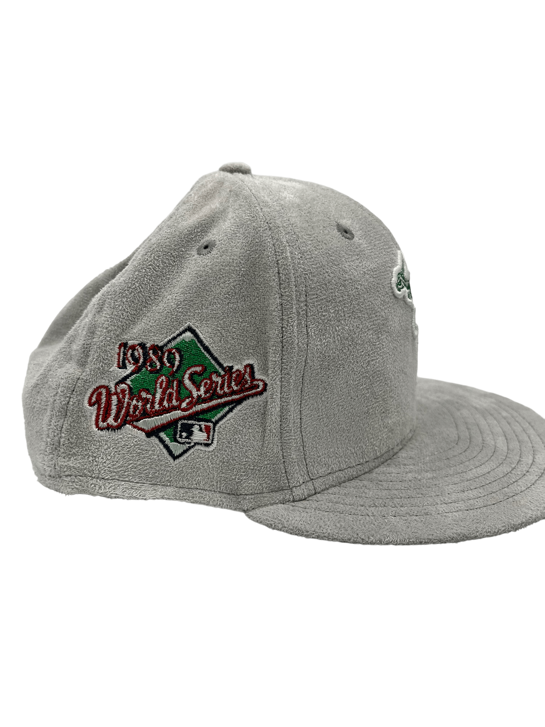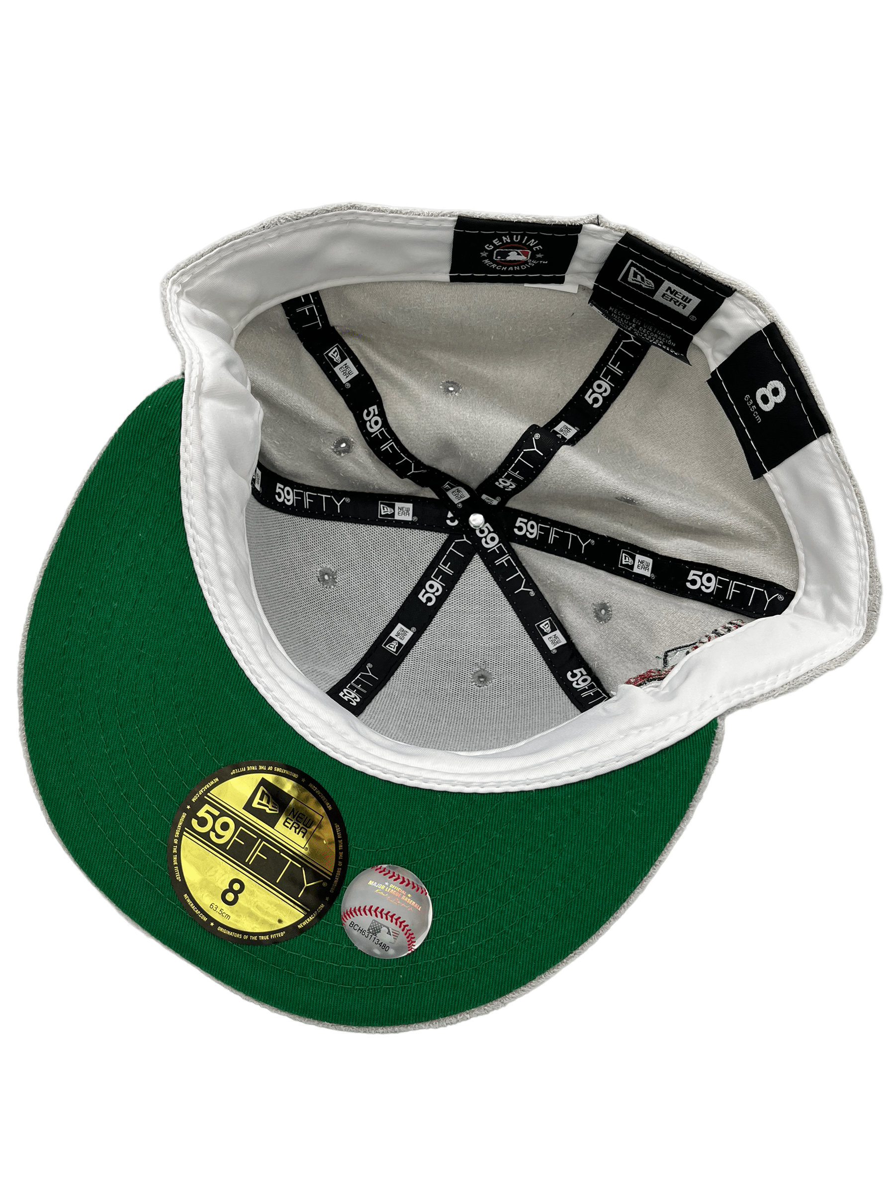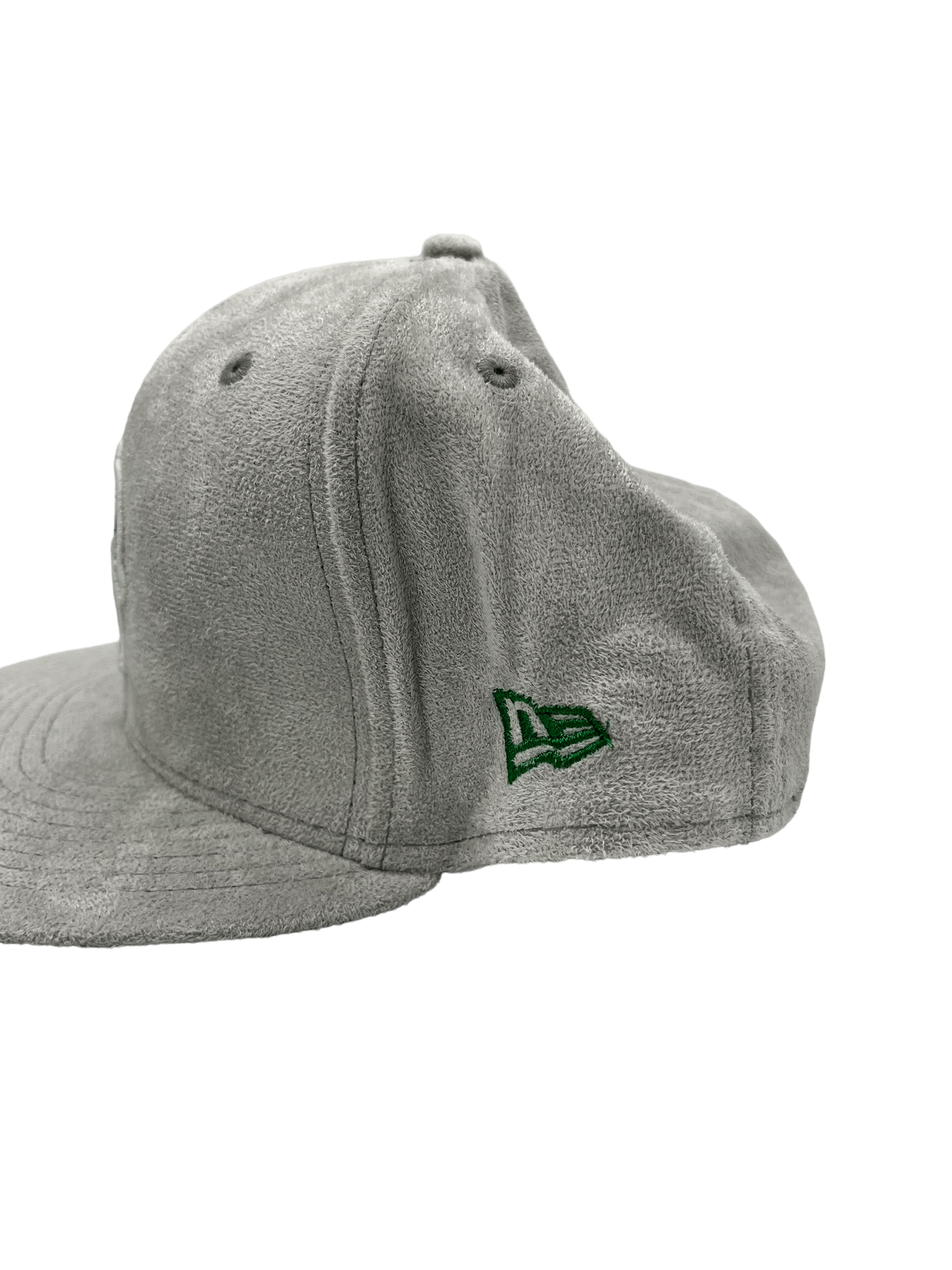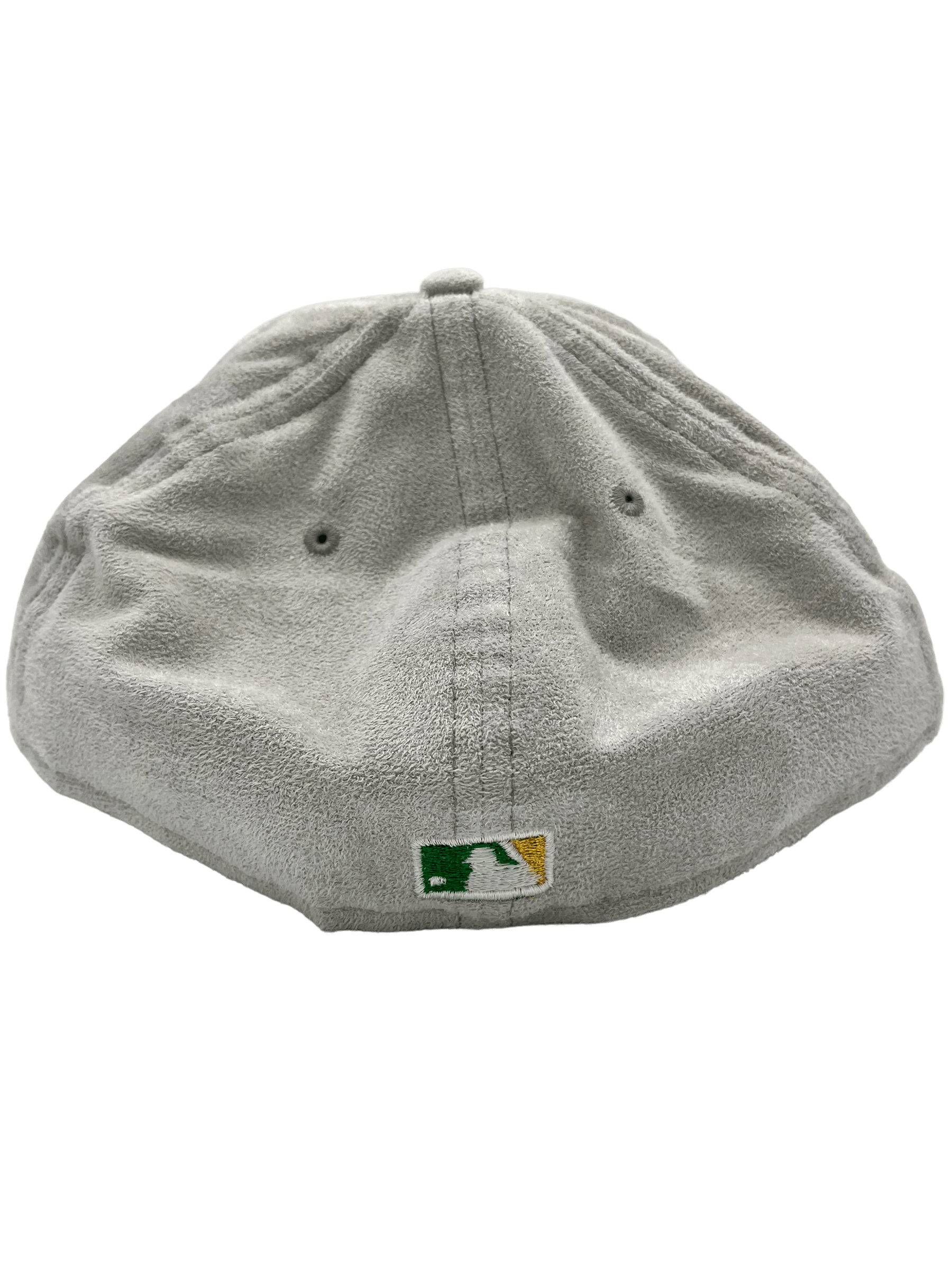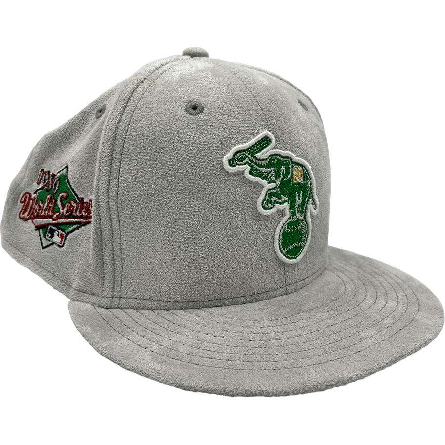 This New Era x Pro Image Sports Oakland Athletics Gray Metallic Suede 59FIFTY Fitted Hat is an exclusive release by Pro Image Sports. The fitted has a gray metallic suede six panel structured high crown, eyelets and squatchee button. The flat bill of the fitted cap is also gray metallic suede with a green undervisor and white sweatband. The front panel features the Oakland Athletics logo embroidered in green stitching with a World Series side patch embroidery on the right panel. The left panel of the fitted displays the New Era logo and the official MLB logo on the rear-crown .