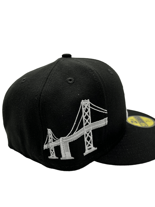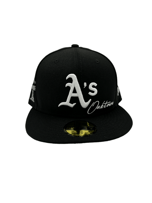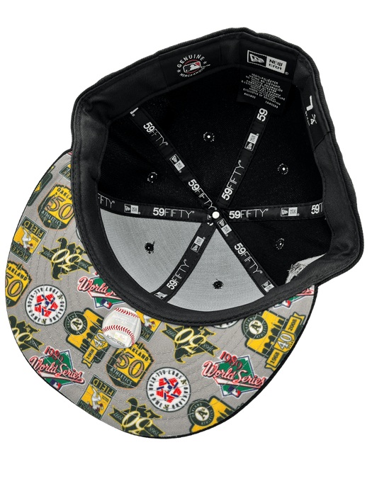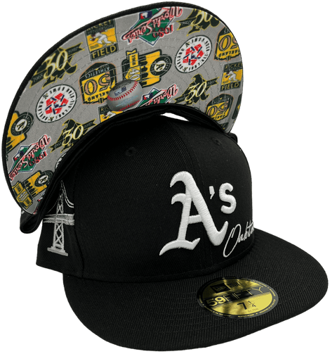 This New Era x Pro Image Sports Oakland Athletics Logo UV 2023 59FIFTY Fitted Hat has a black six panel structured high crown and embroidered eyelets with a black fabric squatchee button. The fitted cap also has a black flat bill with an all over celebratory graphic undervisor. The front panel features the Oakland A's logo embroidery and a graphic side patch embroidery on the right panel. The left panel of the fitted displays the New Era logo and the official MLB logo embroidery on the rear crown.