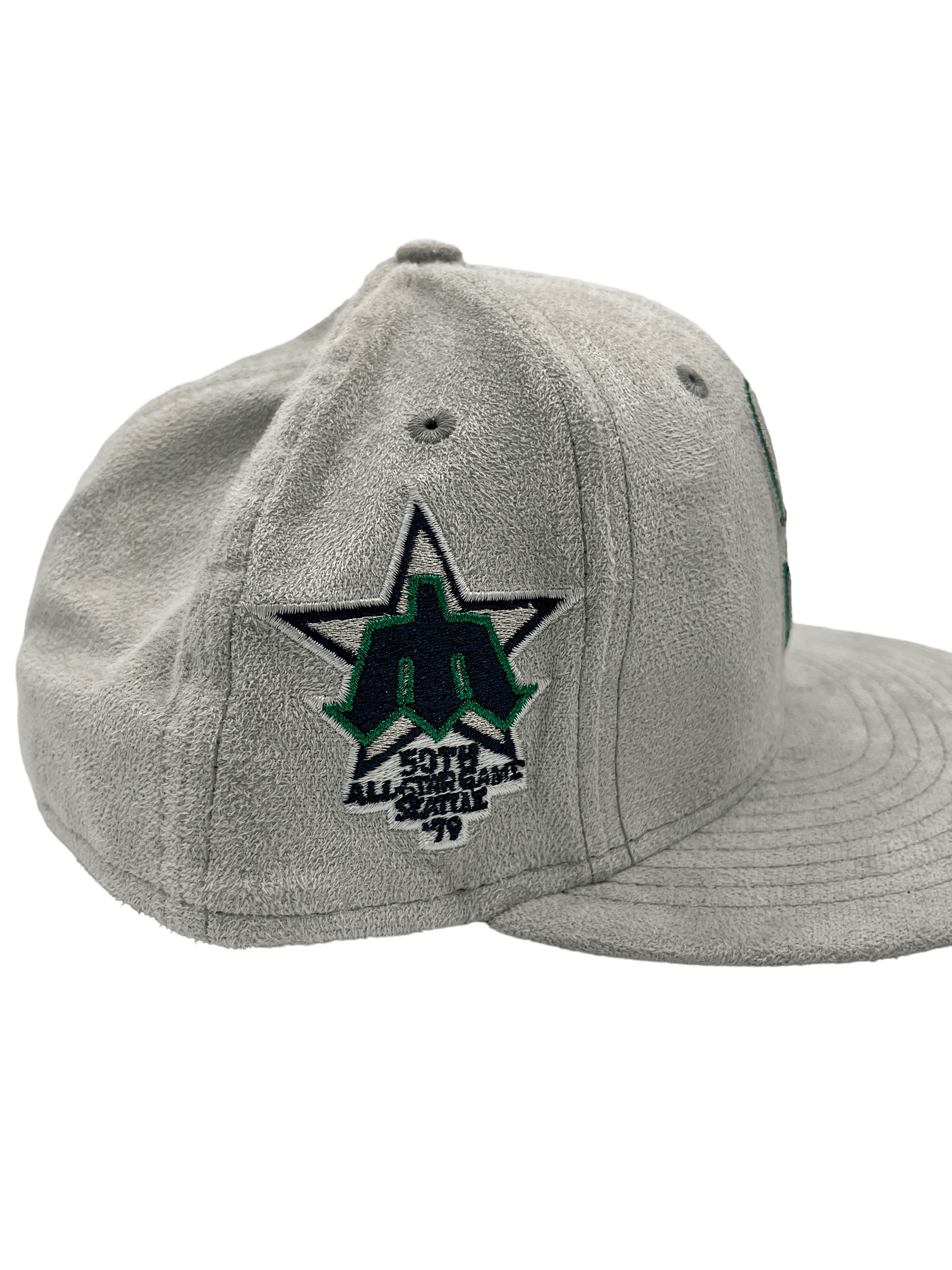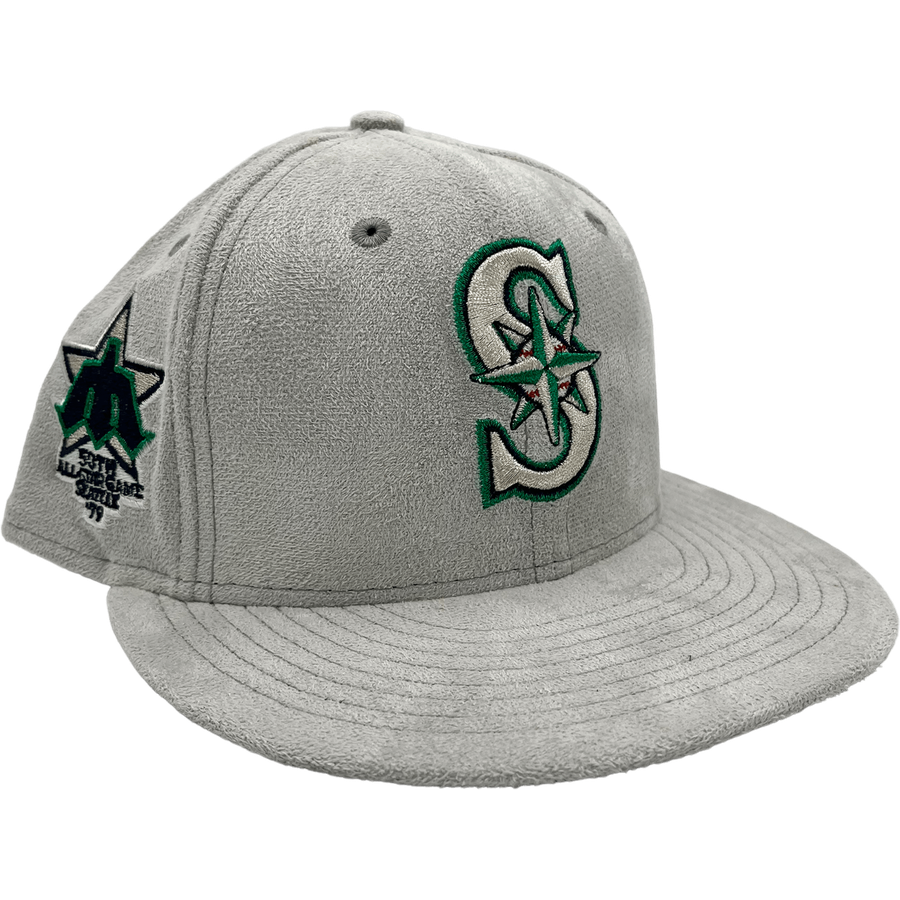 This New Era x Pro Image Sports Seattle Mariners Gray Metallic Suede 59FIFTY Fitted Hat is an exclusive release by Pro Image Sports. The fitted has a gray metallic suede six panel structured high crown, eyelets and squatchee button. The flat bill of the fitted cap is also gray metallic suede with a black undervisor and white sweatband. The front panel features the Seattle Mariners logo embroidery with an All-Star Game side patch embroidery on the right panel. The left panel of the fitted displays the New Era logo and the official MLB logo on the rear-crown .