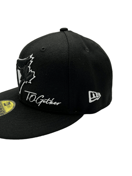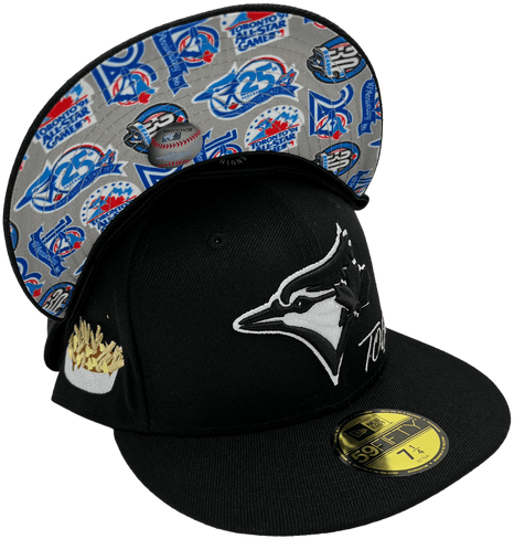 This New Era x Pro Image Sports Toronto Blue Jays Logo UV 2023 59FIFTY Fitted Hat has a black six panel structured high crown and embroidered eyelets with a black fabric squatchee button. The fitted cap also has a black flat bill with an all over celebratory graphic undervisor. The front panel features the Toronto Blue Jays logo embroidery and a graphic side patch embroidery on the right panel. The left panel of the fitted displays the New Era logo and the official MLB logo embroidery on the rear crown.