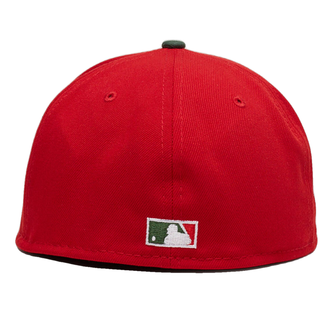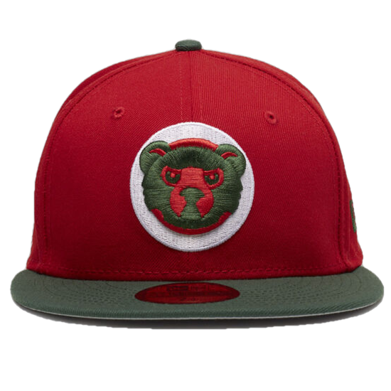 This New Era 59FIFTY Poinsettia fitted hat was released by Snipes USA. The fitted has a red six panel structured high crown and embroidered eyelets with a dark green fabric squatchee button. The fitted cap also has a dark green flat bill with a grey undervisor and black sweatband. The front panel features the Chicago Cubs logo embroidery and a side patch embroidery on the right panel. The left panel of the fitted displays the New Era logo and the official MLB logo embroidery on the rear crown.