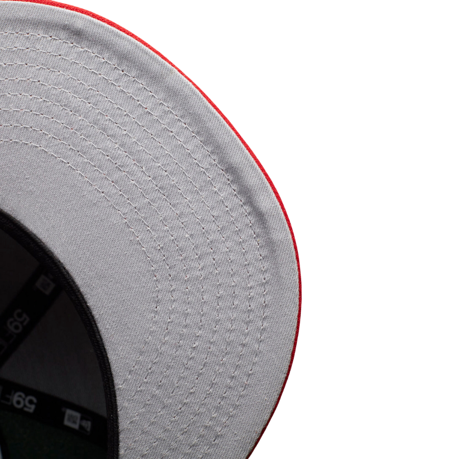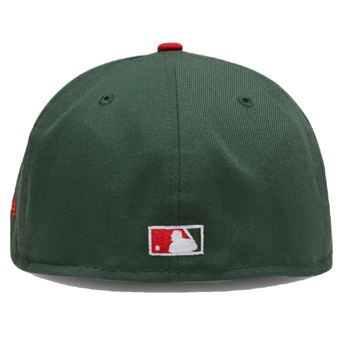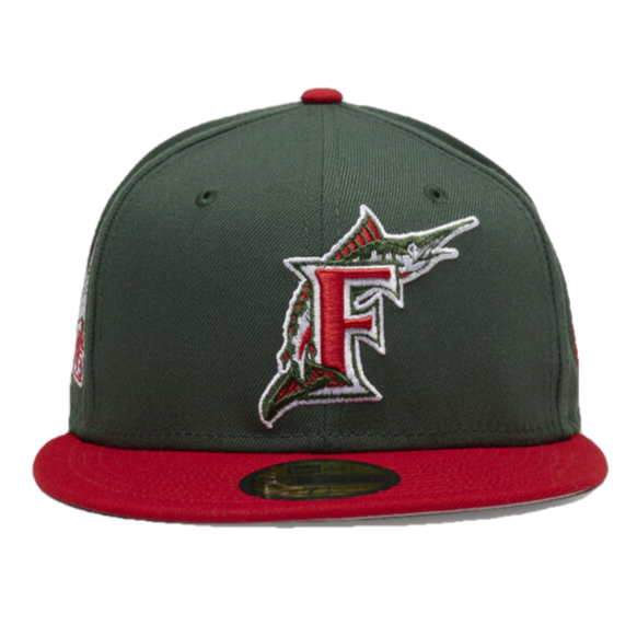 This New Era 59FIFTY Poinsettia fitted hat was released by Snipes USA. The fitted has a dark green six panel structured high crown and embroidered eyelets with a red fabric squatchee button. The fitted cap also has a red flat bill with a grey undervisor and black sweatband. The front panel features the Florida Marlins logo embroidery and a side patch embroidery on the right panel. The left panel of the fitted displays the New Era logo and the official MLB logo embroidery on the rear crown.