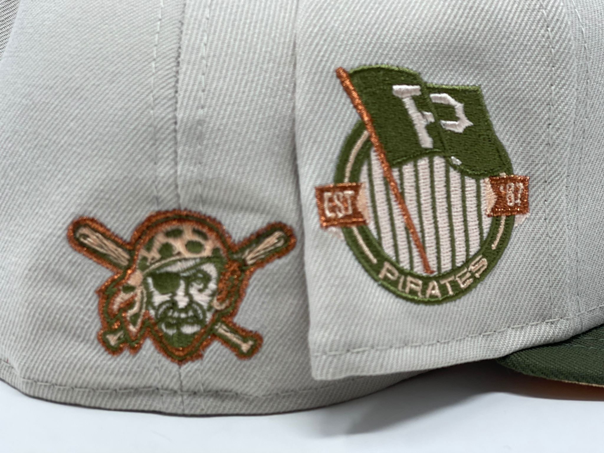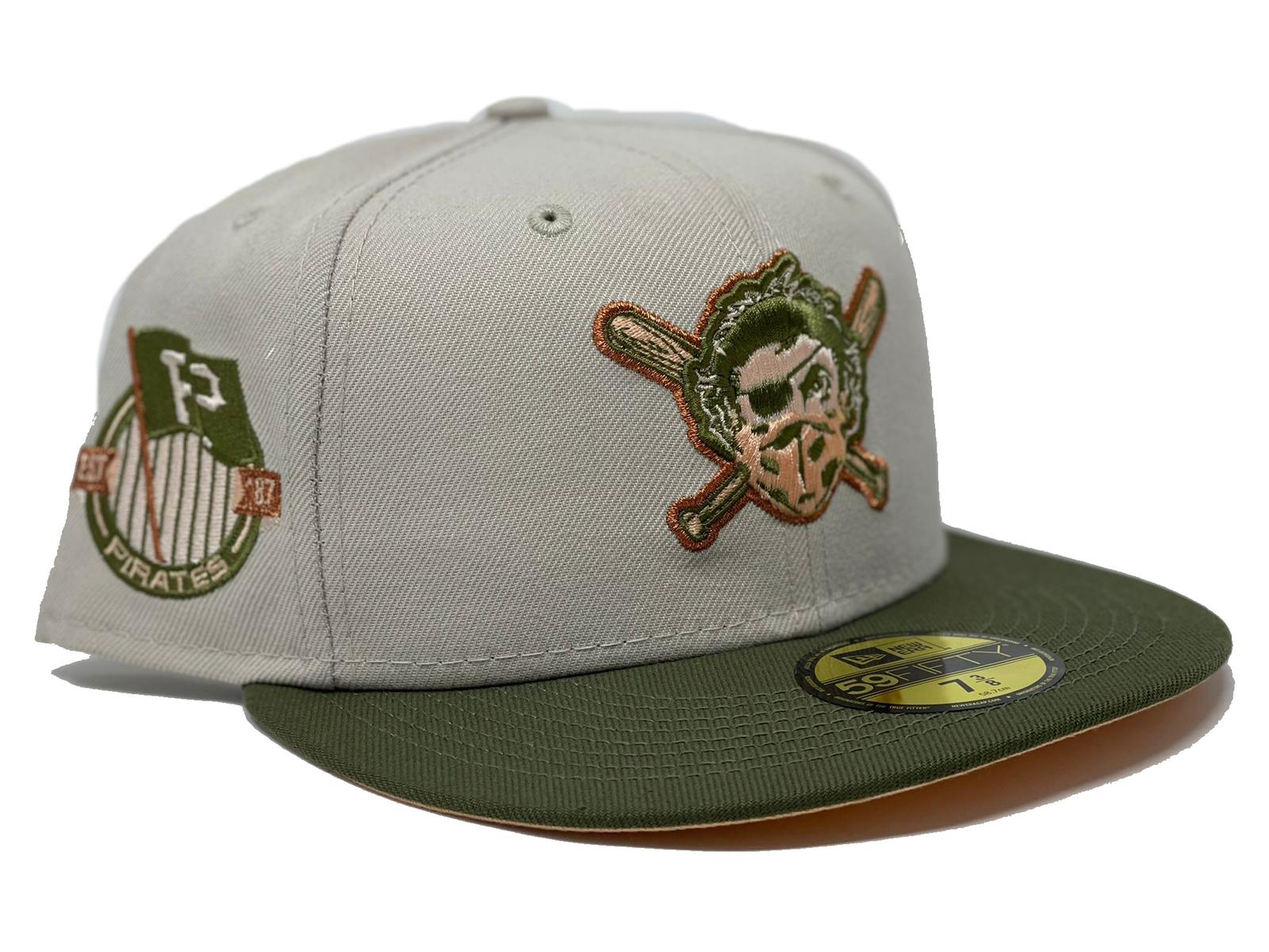 This New Era Pittsburgh Pirates 59FIFTY fitted hat is a Sports World 165 exclusive release. The six panel structured high crown, embroidered eyelets and fabric squatchee button is stone. The flat bill of the fitted cap is olive green with a peach undervisor and white sweatband. The front panel features the Pittsburgh Pirates logo embroidered in olive green and peach threads.