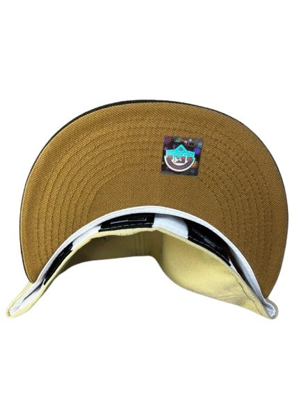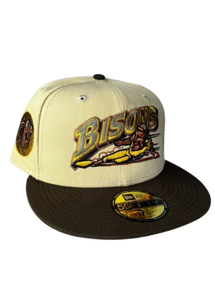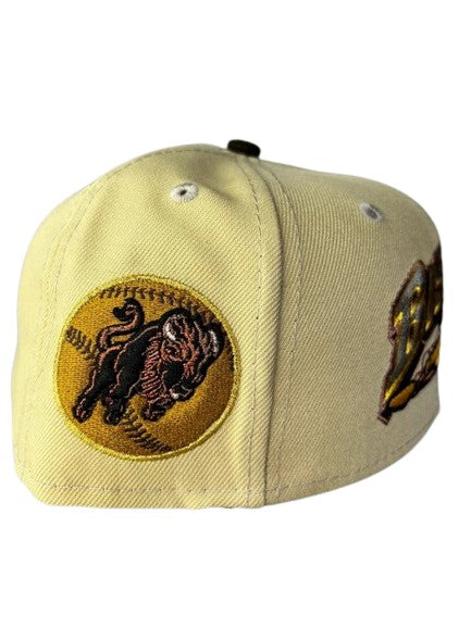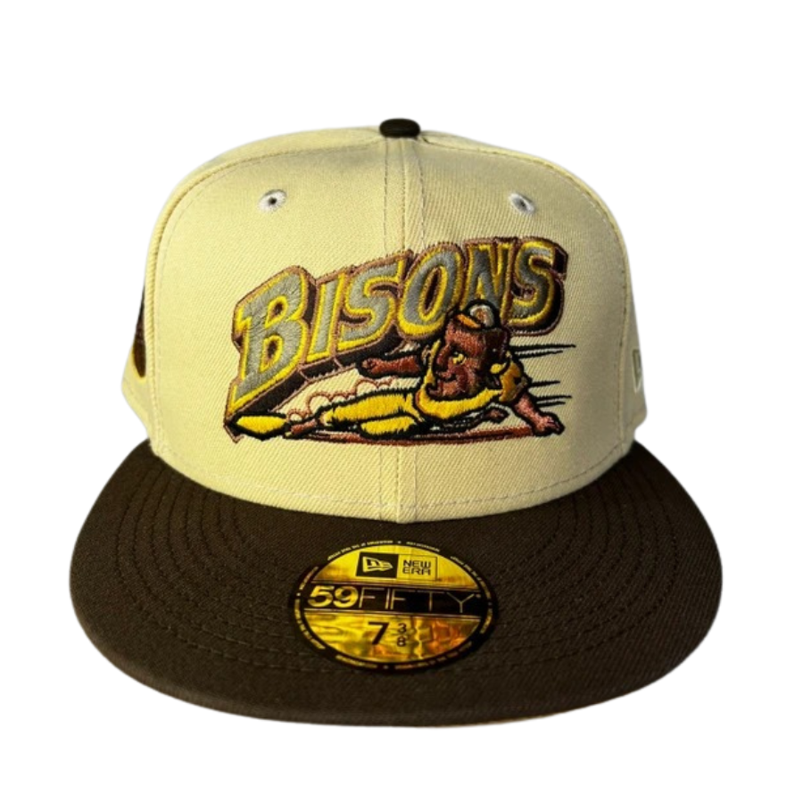 This New Era New Era Buffalo Bisons 'Shadow of the Colossus' Inspired 59FIFTY Fitted Hat has a tan six panel structured high crown and embroidered eyelets with a dark brown fabric squatchee button. The fitted cap has a dark brown flat bill with a light brown undervisor and white sweatband. The front panel features the Buffalo Bisons logo embroidery and side patch embroidery on the right panel. The left panel of the fitted displays the New Era logo and the official MILB logo embroidery on the rear crown.