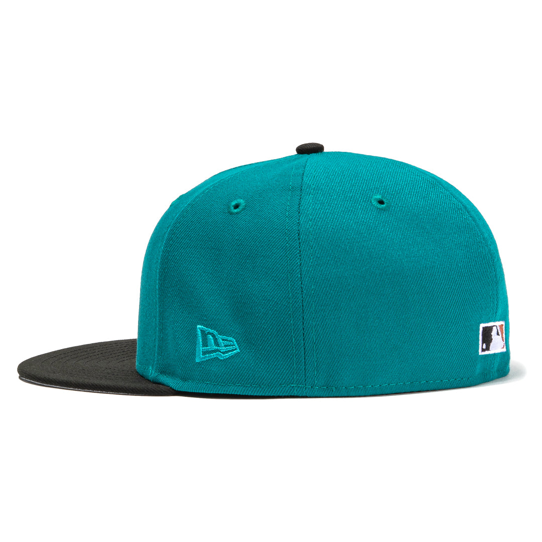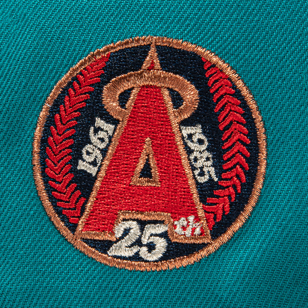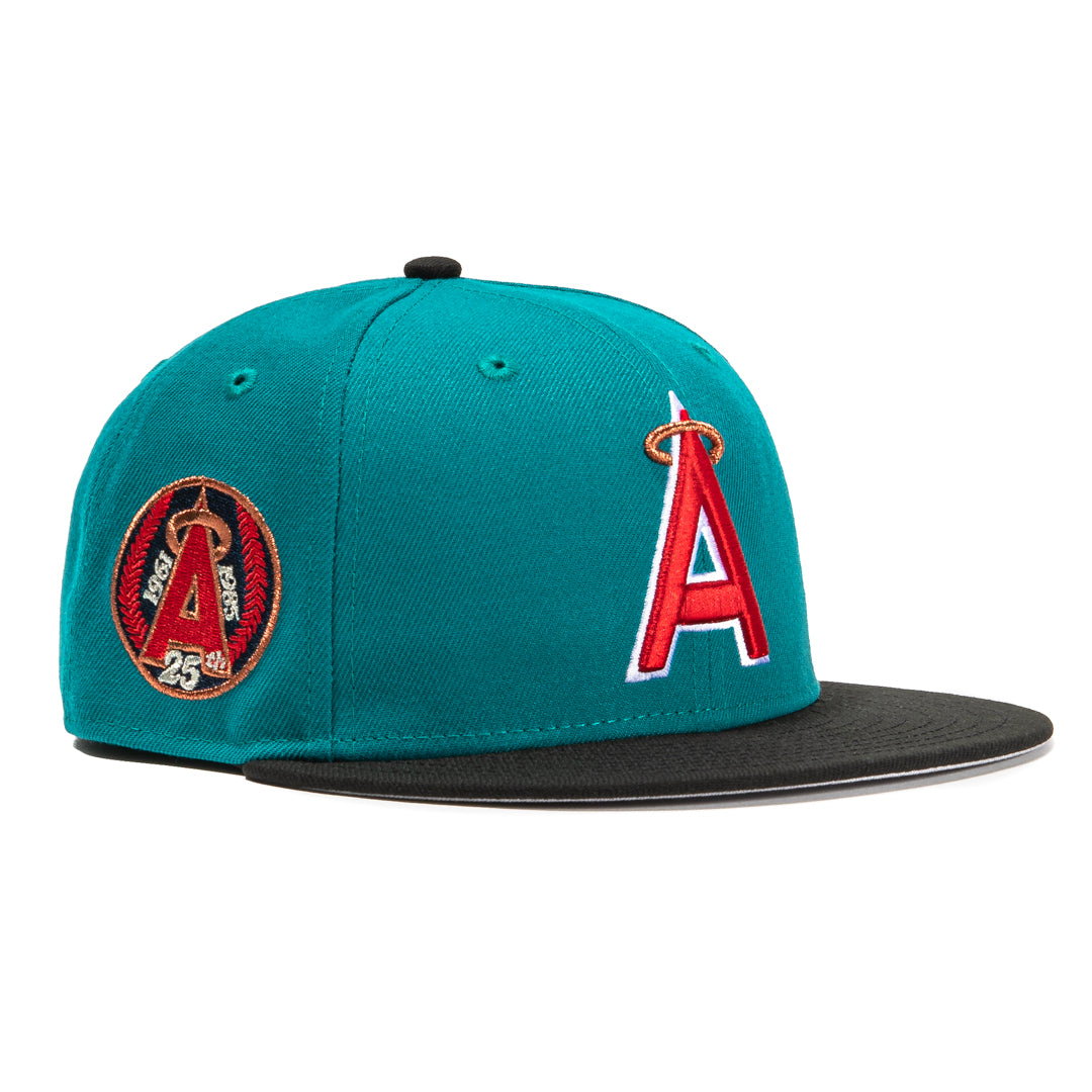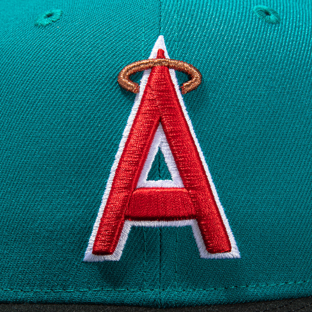 This New Era Los Angeles Angels Copper Head 59FIFTY fitted hat has a teal six panel structured high crown, teal embroidered eyelets and a black fabric squatchee button. The fitted cap also has a black flat bill with a grey undervisor and black sweatband. The front panel features the Los Angeles Angels logo embroidery and a side patch embroidery on the right panel. The left panel of the fitted displays the New Era logo and the rear crown features the official MLB logo embroidery.