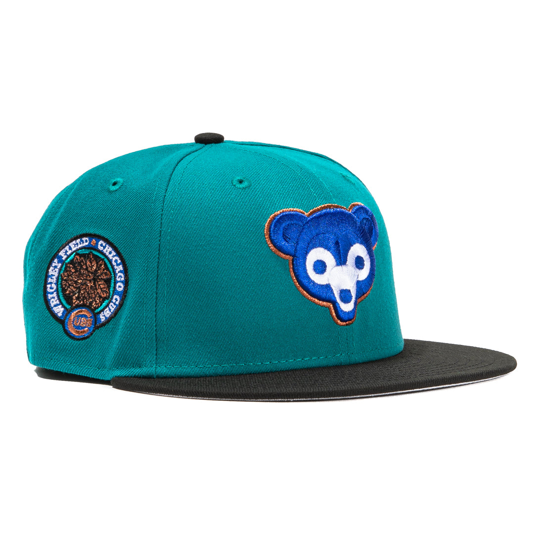 This New Era Chicago Cubs Copper Head 59FIFTY fitted hat has a teal six panel structured high crown, teal embroidered eyelets and a black fabric squatchee button. The fitted cap also has a black flat bill with a grey undervisor and black sweatband. The front panel features the Chicago Cubs logo embroidery and a side patch embroidery on the right panel. The left panel of the fitted displays the New Era logo and the rear crown features the official MLB logo embroidery.
