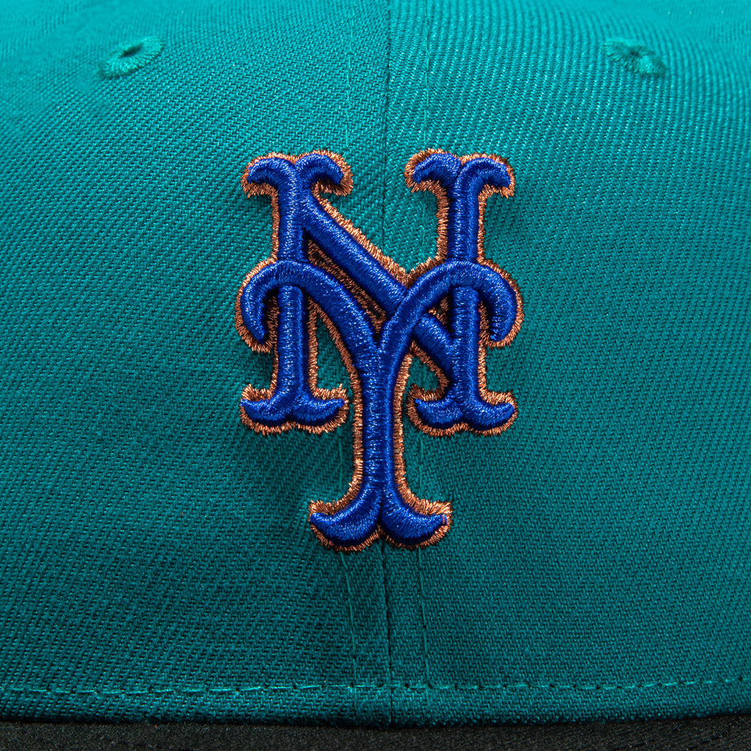 This New Era New York Mets Copper Head 59FIFTY fitted hat has a teal six panel structured high crown, teal embroidered eyelets and a black fabric squatchee button. The fitted cap also has a black flat bill with a grey undervisor and black sweatband. The front panel features the New York Mets logo embroidery and a side patch embroidery on the right panel. The left panel of the fitted displays the New Era logo and the rear crown features the official MLB logo embroidery.
