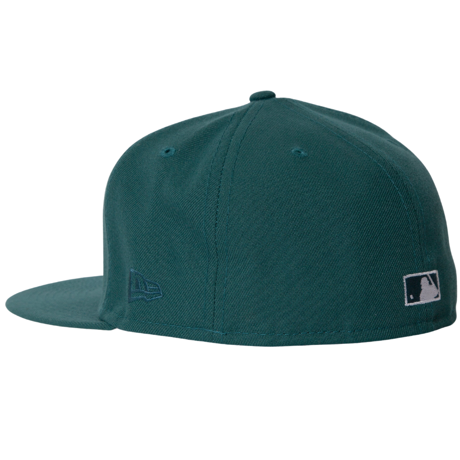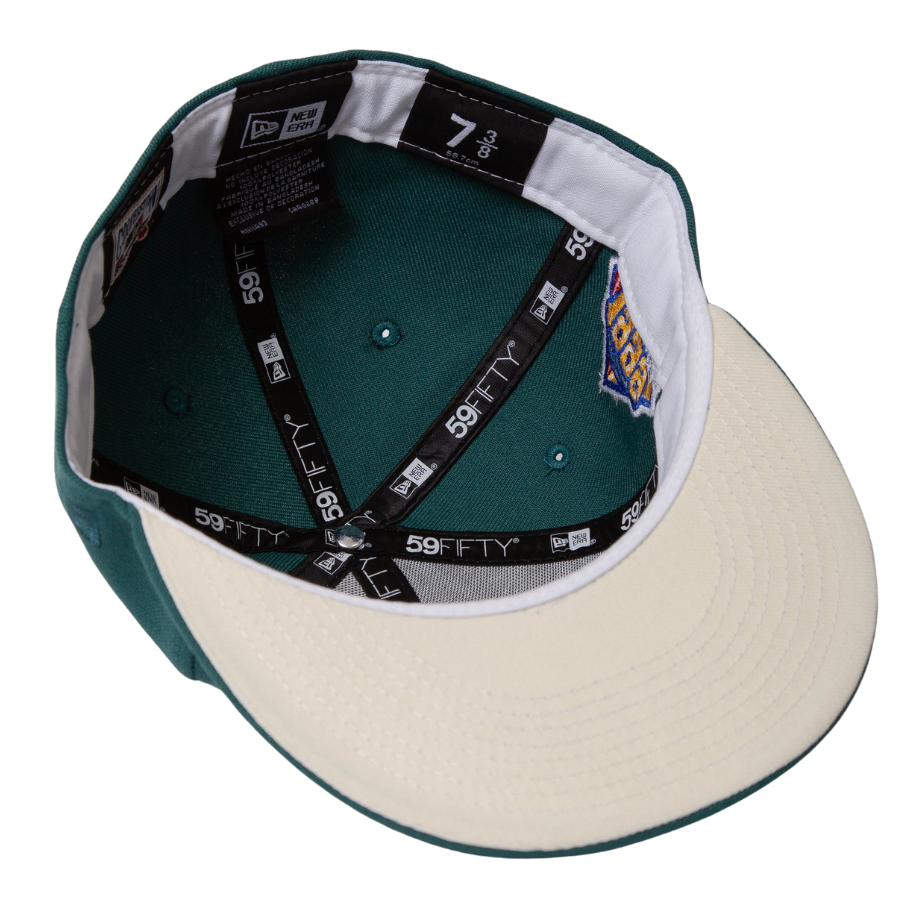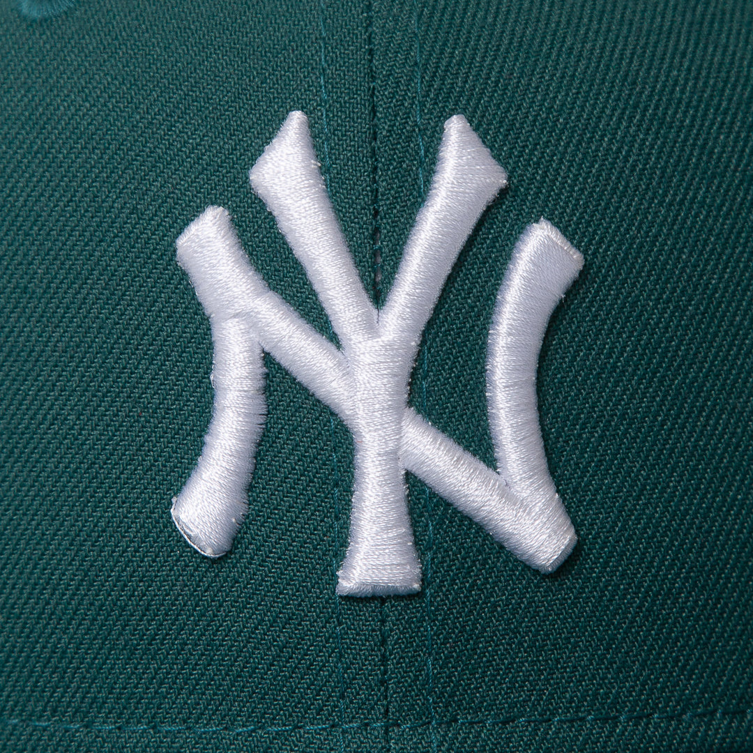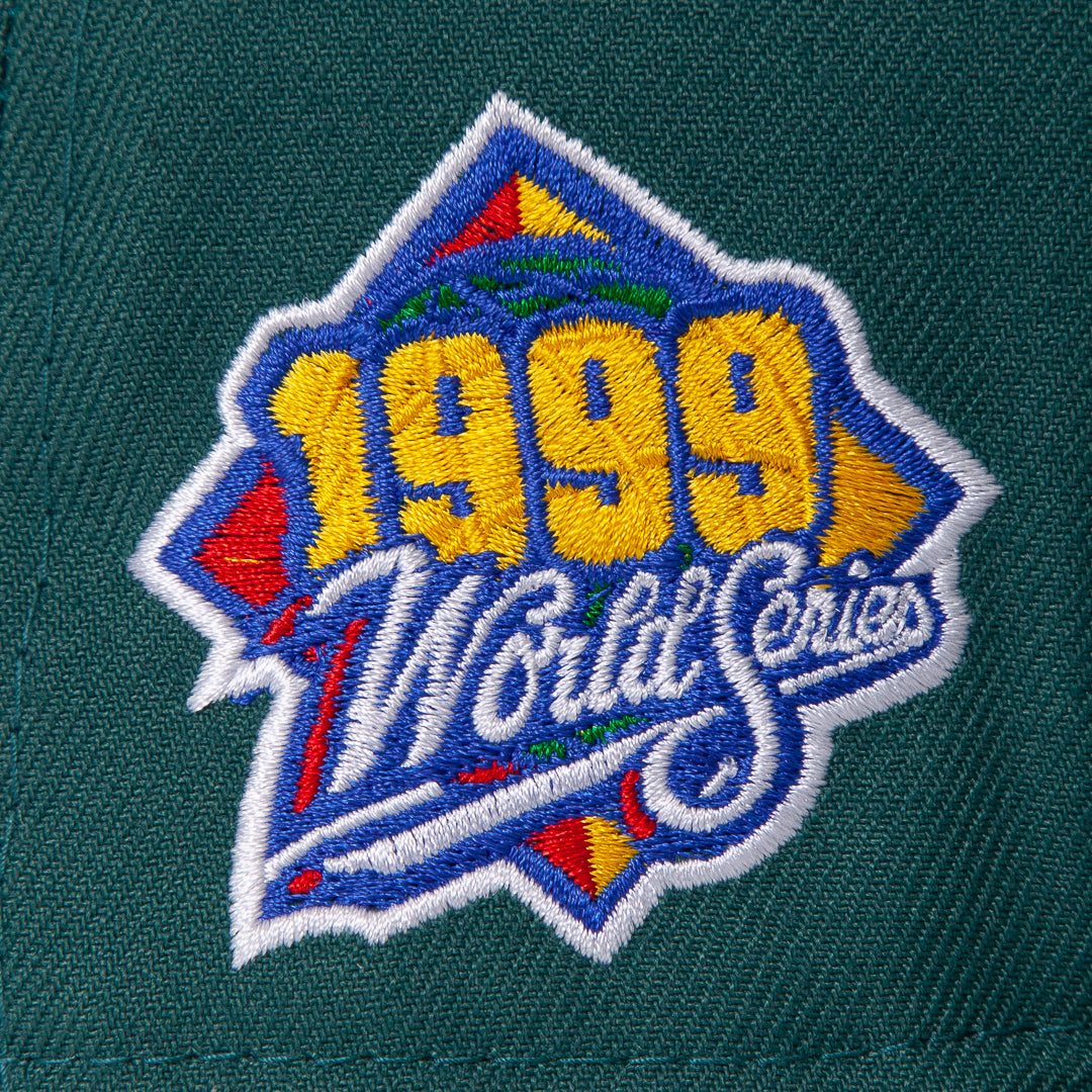 This New York Yankees fitted hat was released by Nohble. The fitted has a pine green six panel structured high crown and embroidered eyelets, a pine green fabric squatchee button and flat bill with a white undervisor and white sweatband. The front panel features a white stitched New York Yankees logo embroidery and a 1999 World Series side patch on the right panel. The left panel of the fitted displays the New Era "Fly Your Own Flag" logo and the official MLB Batterman embroidery on the rear crown.
