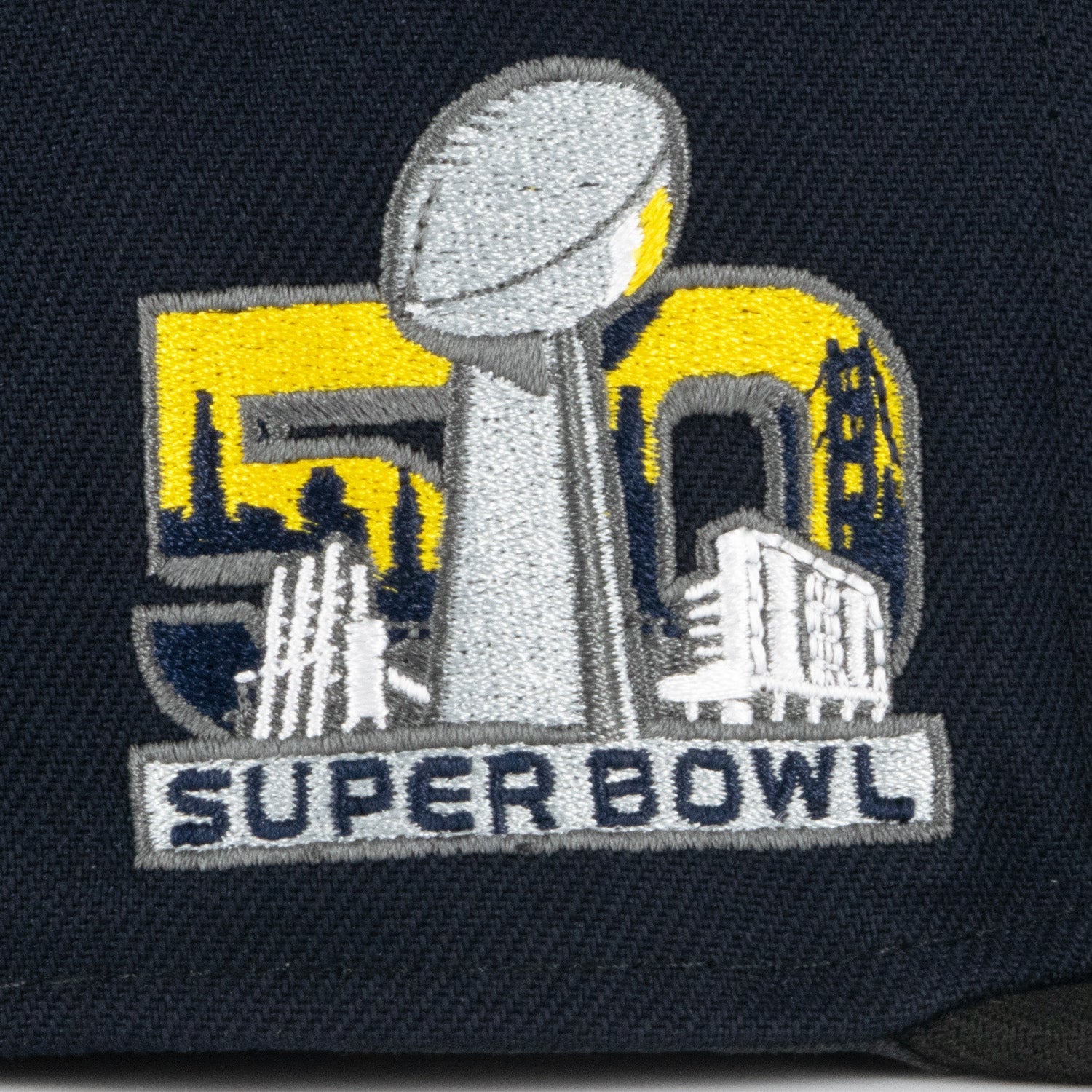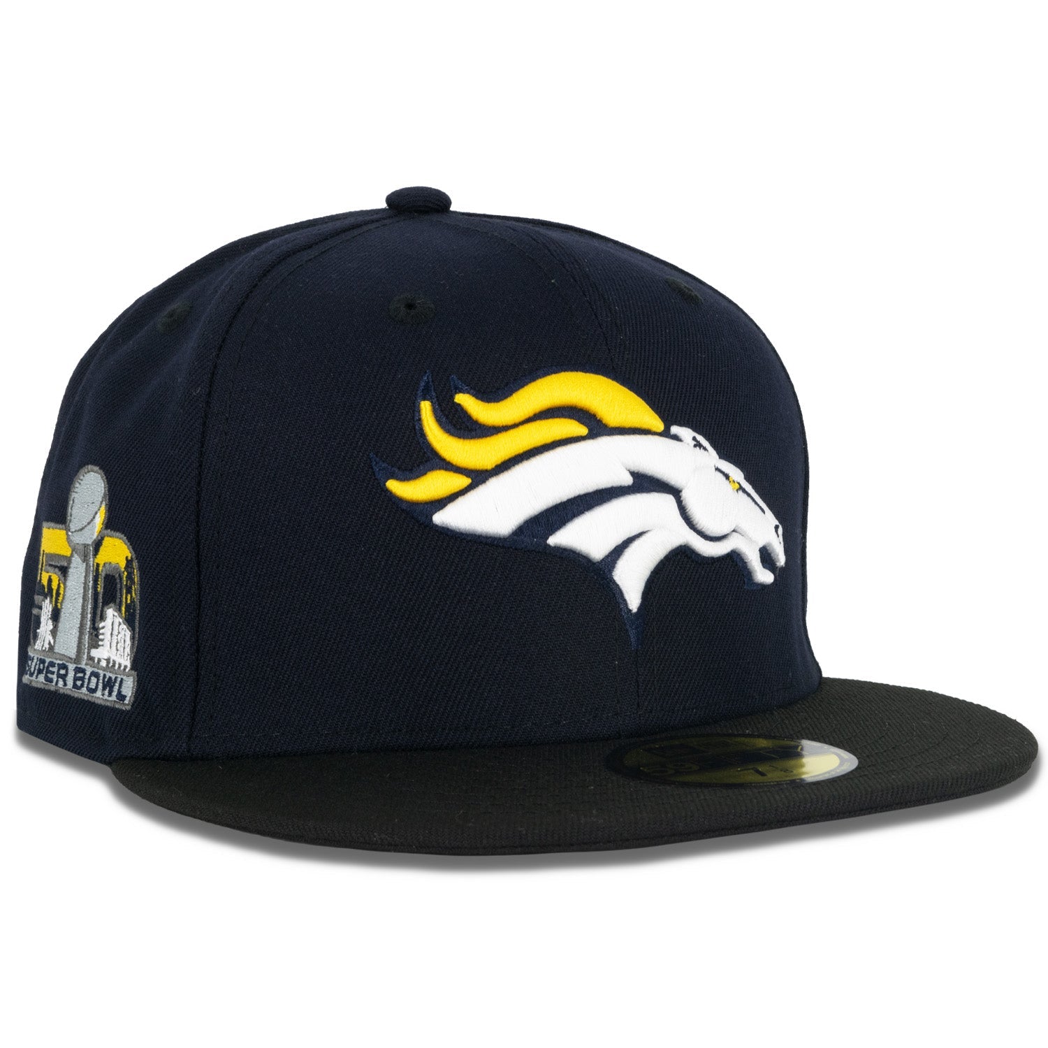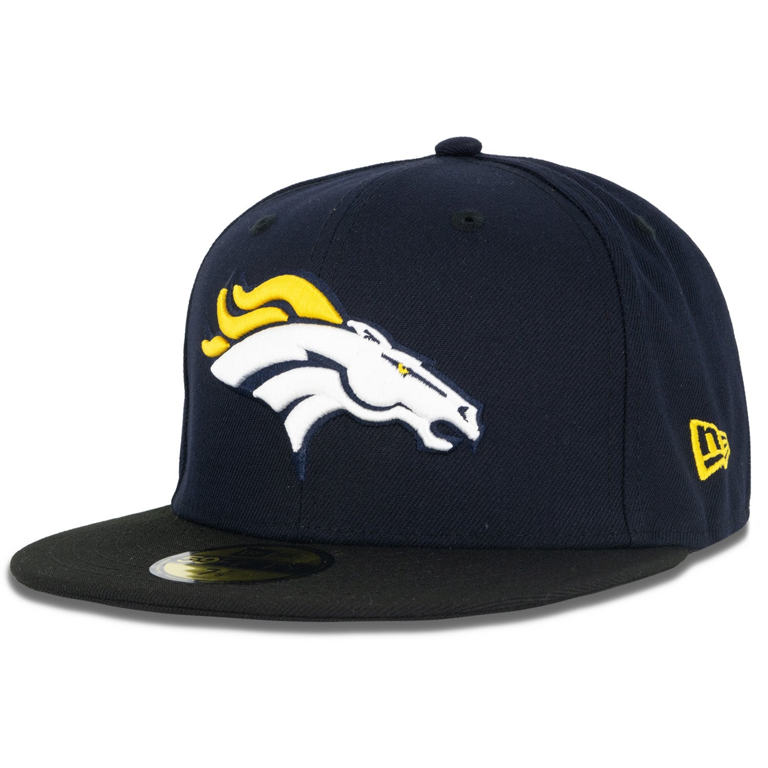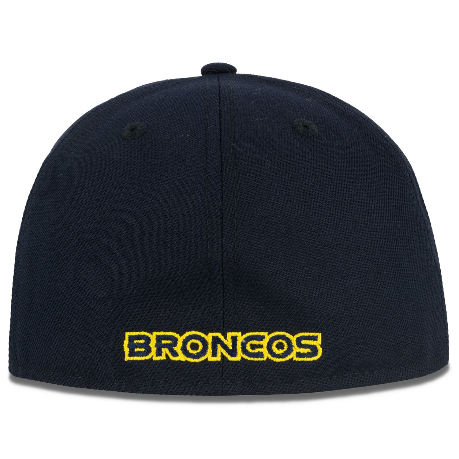 This New Era Denver Broncos Lightning 59FIFTY Fitted Hat was released by Just Sports. The fitted cap has a navy blue six panel structured high crown, embroidered eyelets and fabric squatchee button. The fitted cap also has a black flat bill. The front panel includes the Denver Broncos logo embroidered in white. yellow and navy blue stitching with a side patch on the right-wear side. The left panel of the fitted displays the New Era logo and the official NFL logo embroidery on the rear crown.