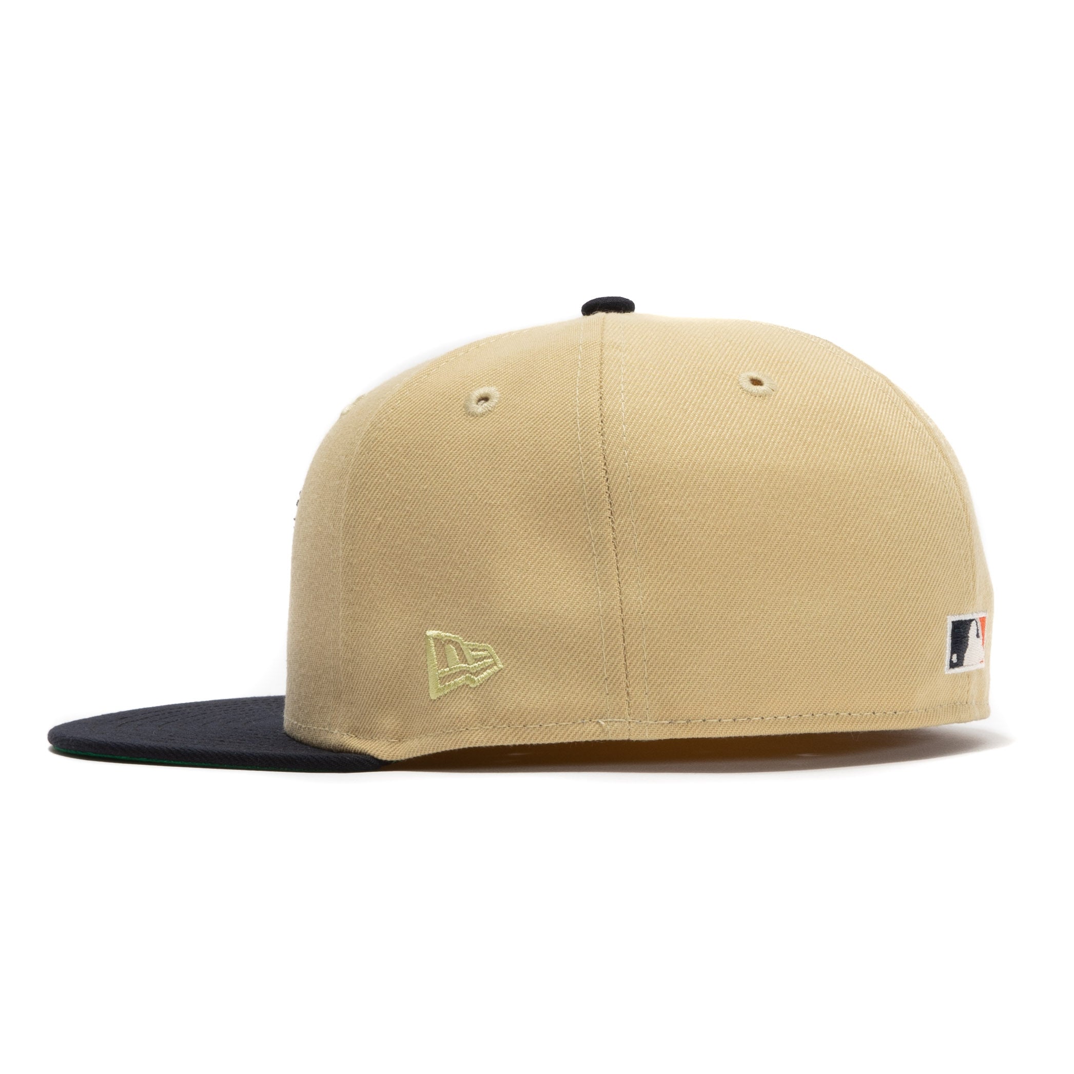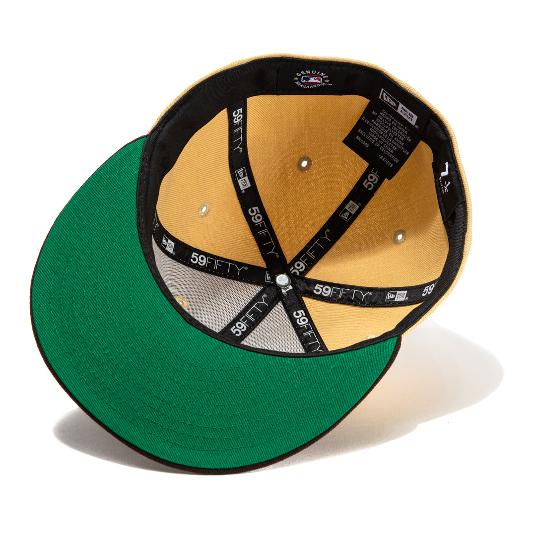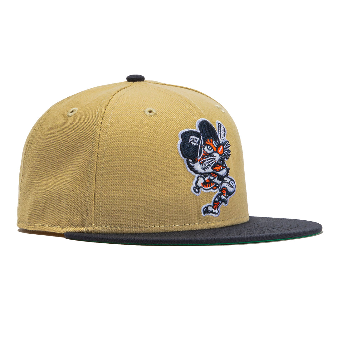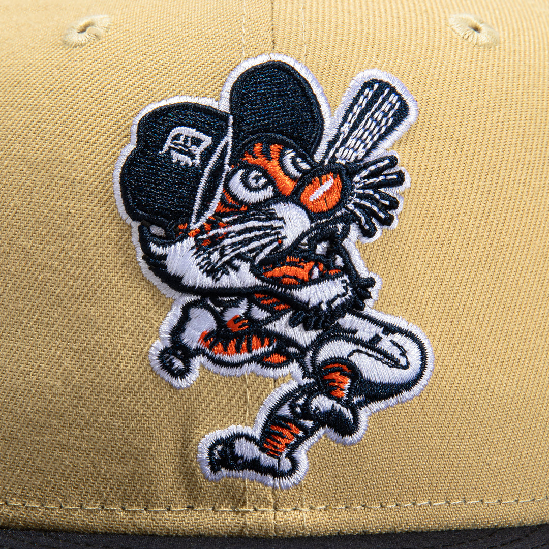 This New Era Detroit Tigers 59FIFTY fitted hat has a tan/stone six panel structured high crown, embroidered eyelets and a black fabric squatchee button. The fitted cap also has a kelly green undervisor and a black sweatband. The front panel features the Detroit Tigers logo embroidery and a side patch embroidery on the right panel. The left panel of the fitted displays the New Era logo and the official MLB logo embroidery on the rear crown.