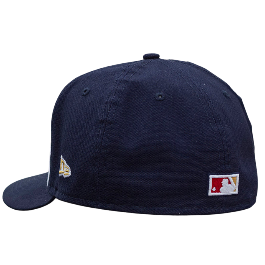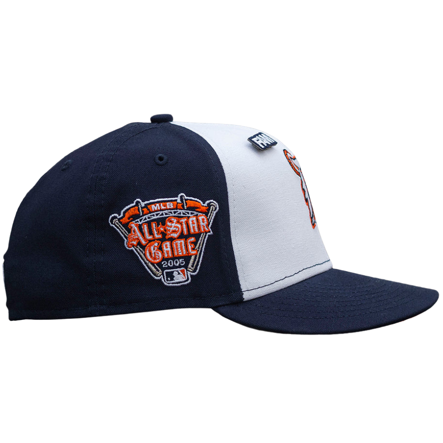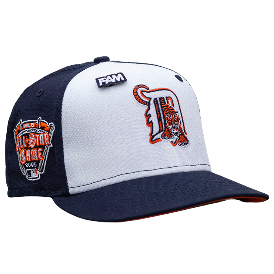 This New Era Detroit Tigers 2005 All-Star Game Cotton Canvas 59FIFTY fitted cap has a two-tone navy blue and white six panel structured high crown. The flat bill of the cap is navy blue with a rush orange undervisor and a 2005 All-Star Game side patch embroidery on the right-wear side.