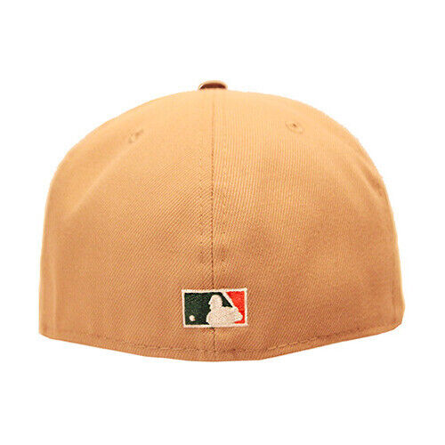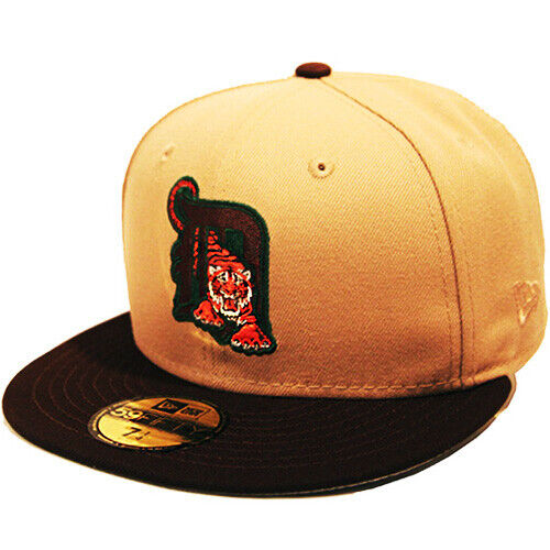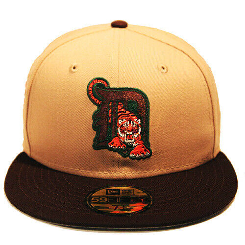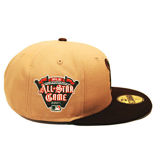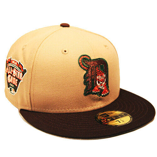 This New Era Detroit Tigers 59FIFTY fitted hat has a camel six panel structured high crown and embroidered eyelets with a walnut brown fabric squatchee button. The flat bill of the fitted is also walnut. The front panel features the Detroit Tigers logo embroidered in orange, brown and green stitching, a 2005 All-Star Game side patch on the right panel and the official MLB batterman logo on the rear-crown.