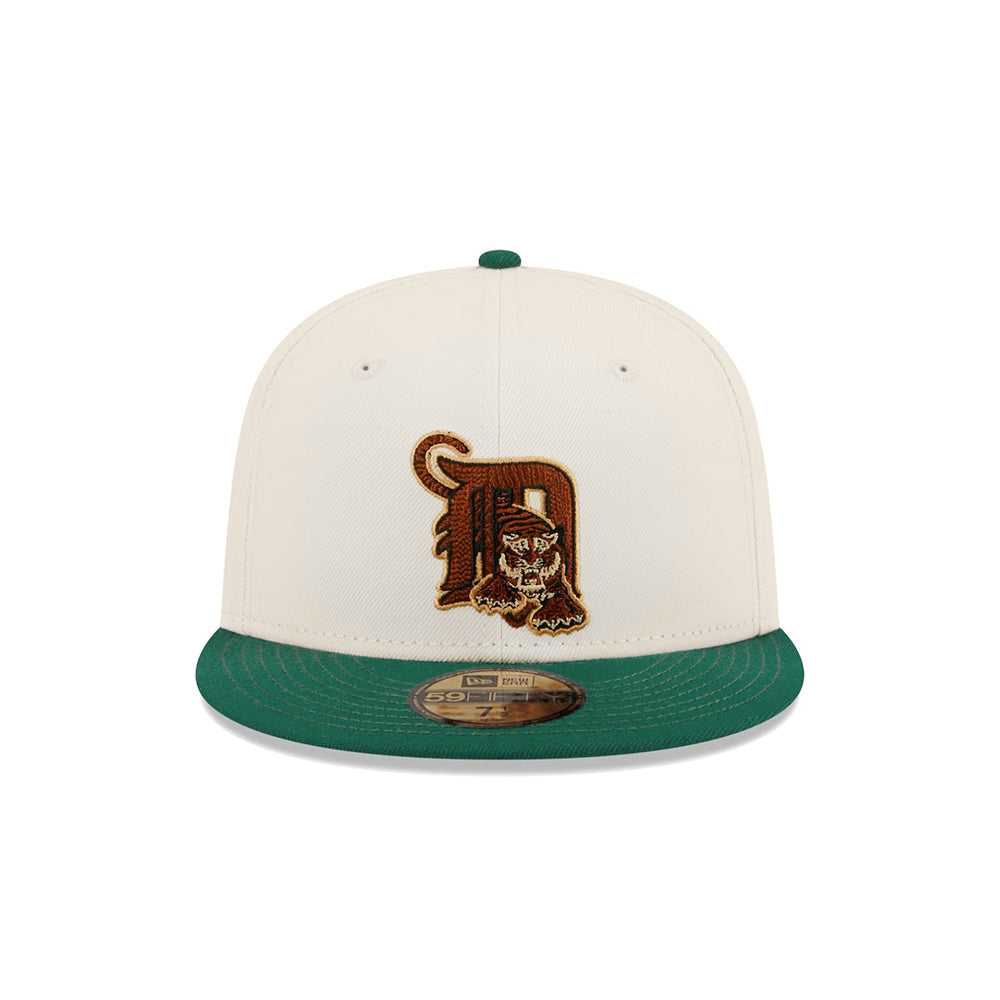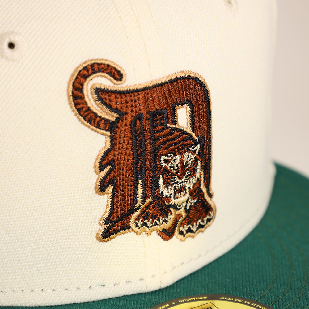 This Detroit Tigers 59FIFTY fitted hat was released by Crown Minded. The fitted has a chrome six panel structured high crown and embroidered eyelets with a green flat bill & fabric squatchee button. The fitted also has a grey bottom under bill with a black sweatband. The front panel features the Detroit Tigers logo embroidery with a matching chrome/green and brown side patch on the right panel. The left panel of the fitted displays the New Era logo and the official MLB Batterman embroidery on the rear crown.