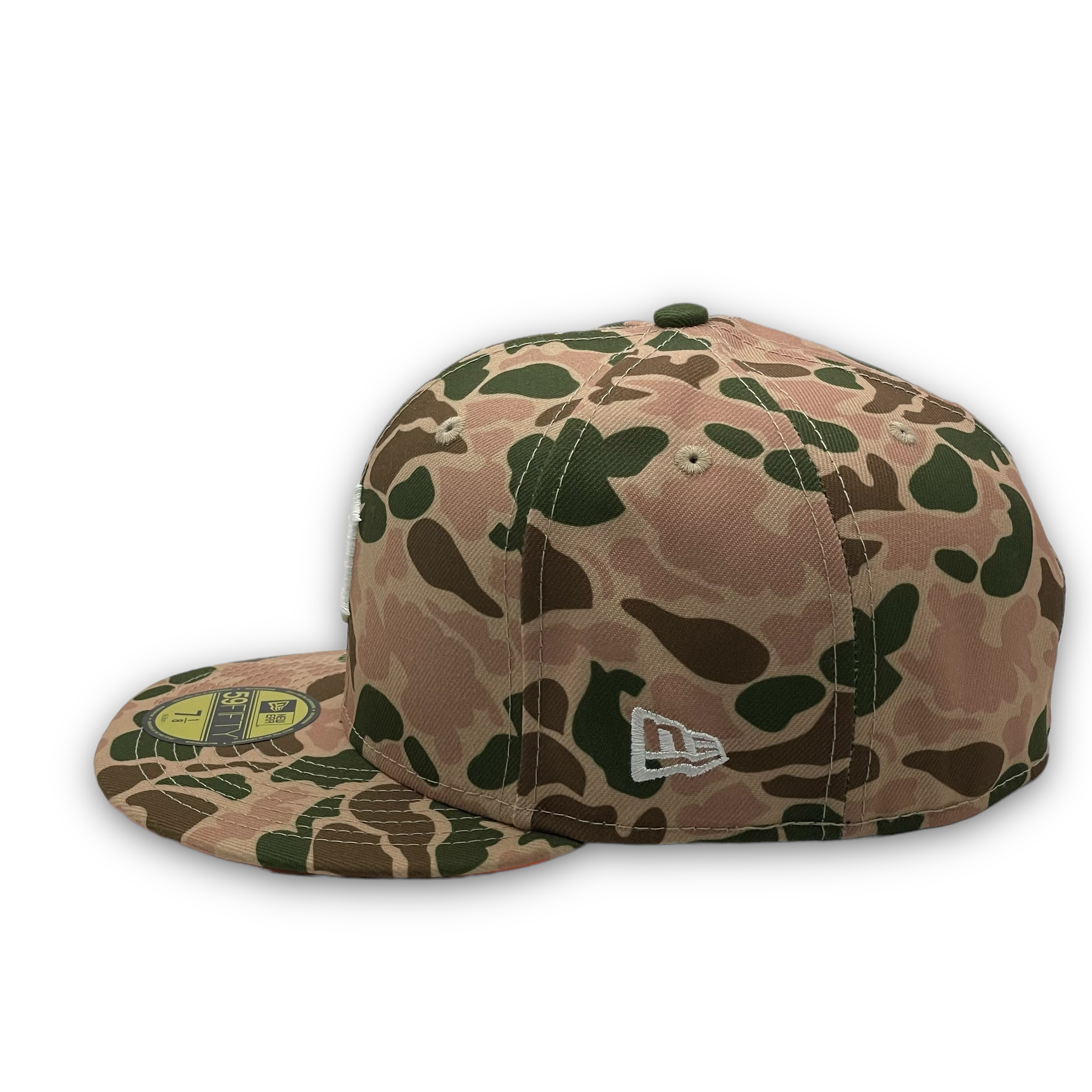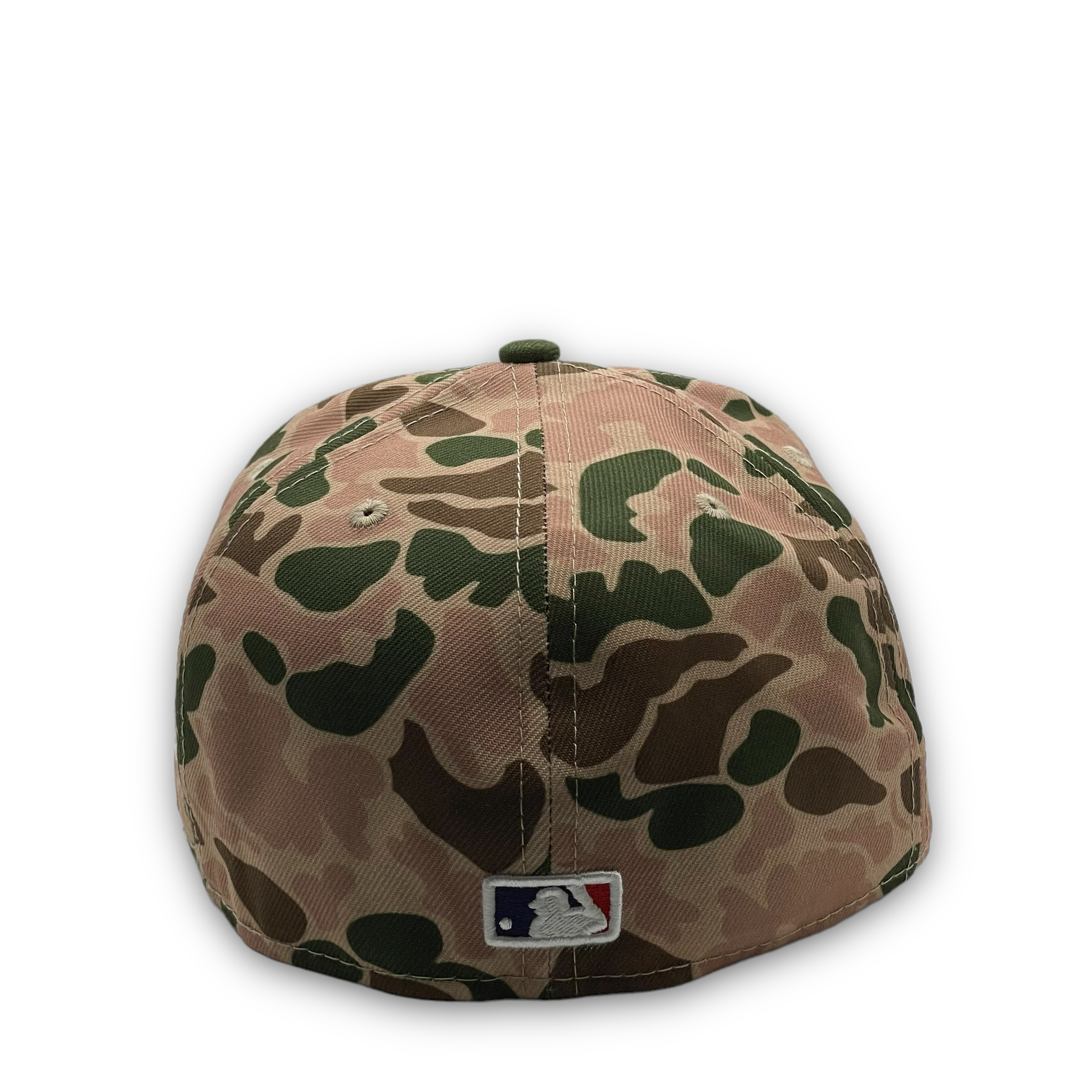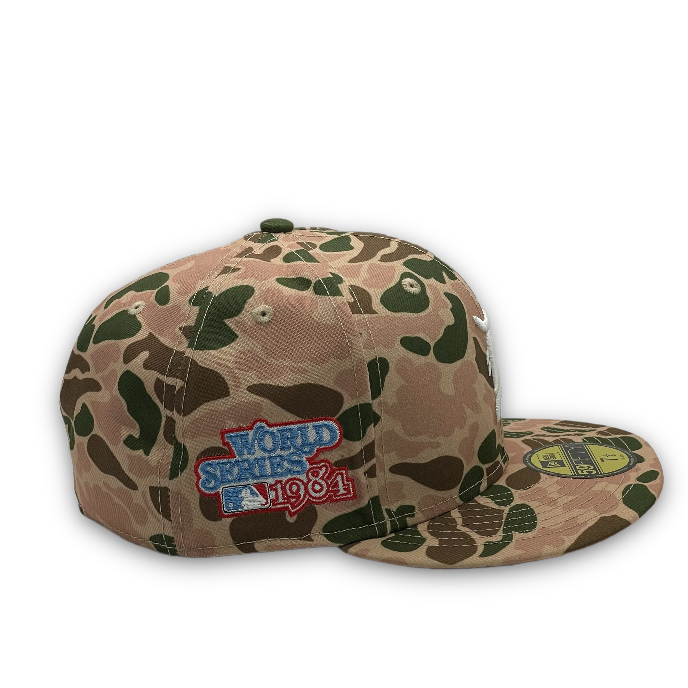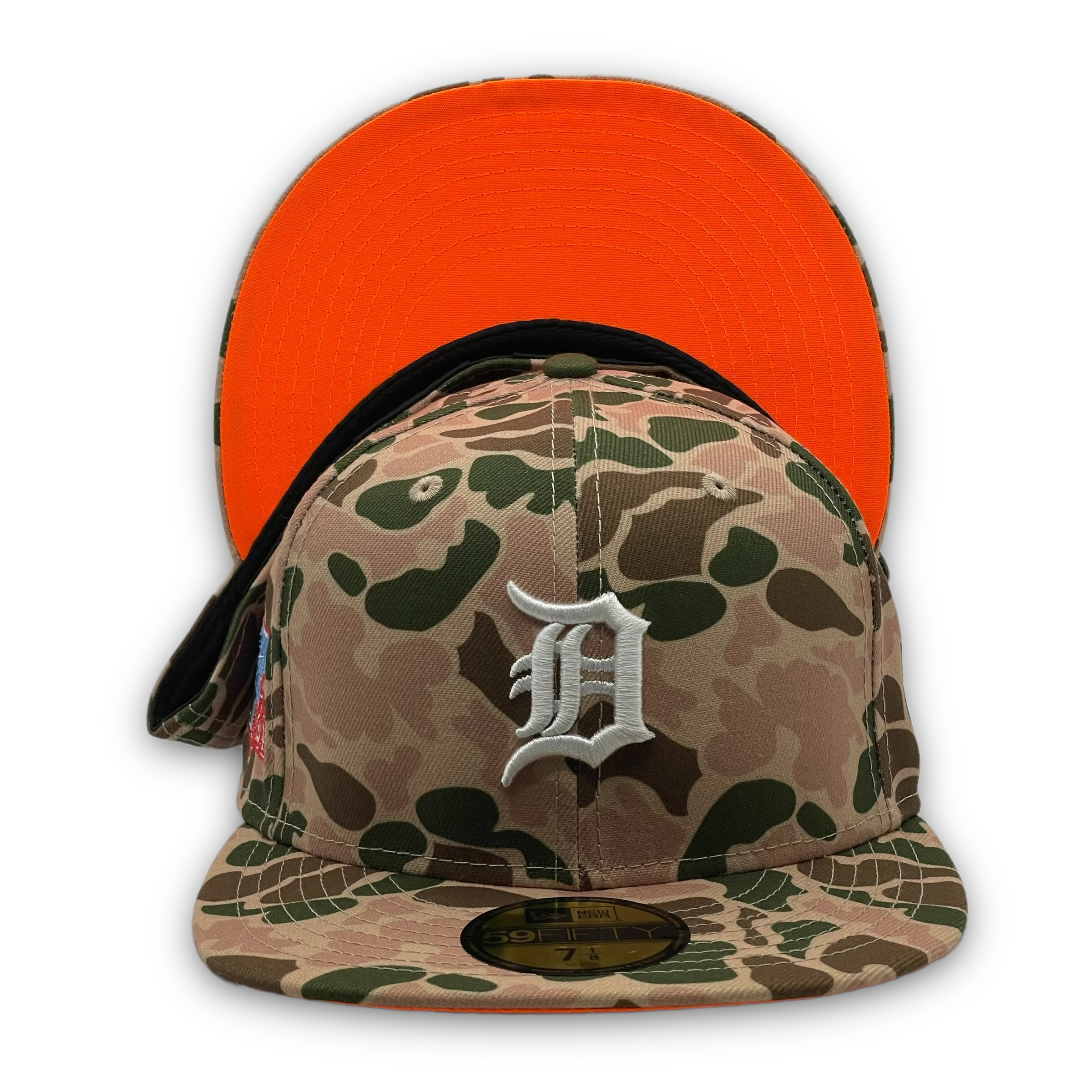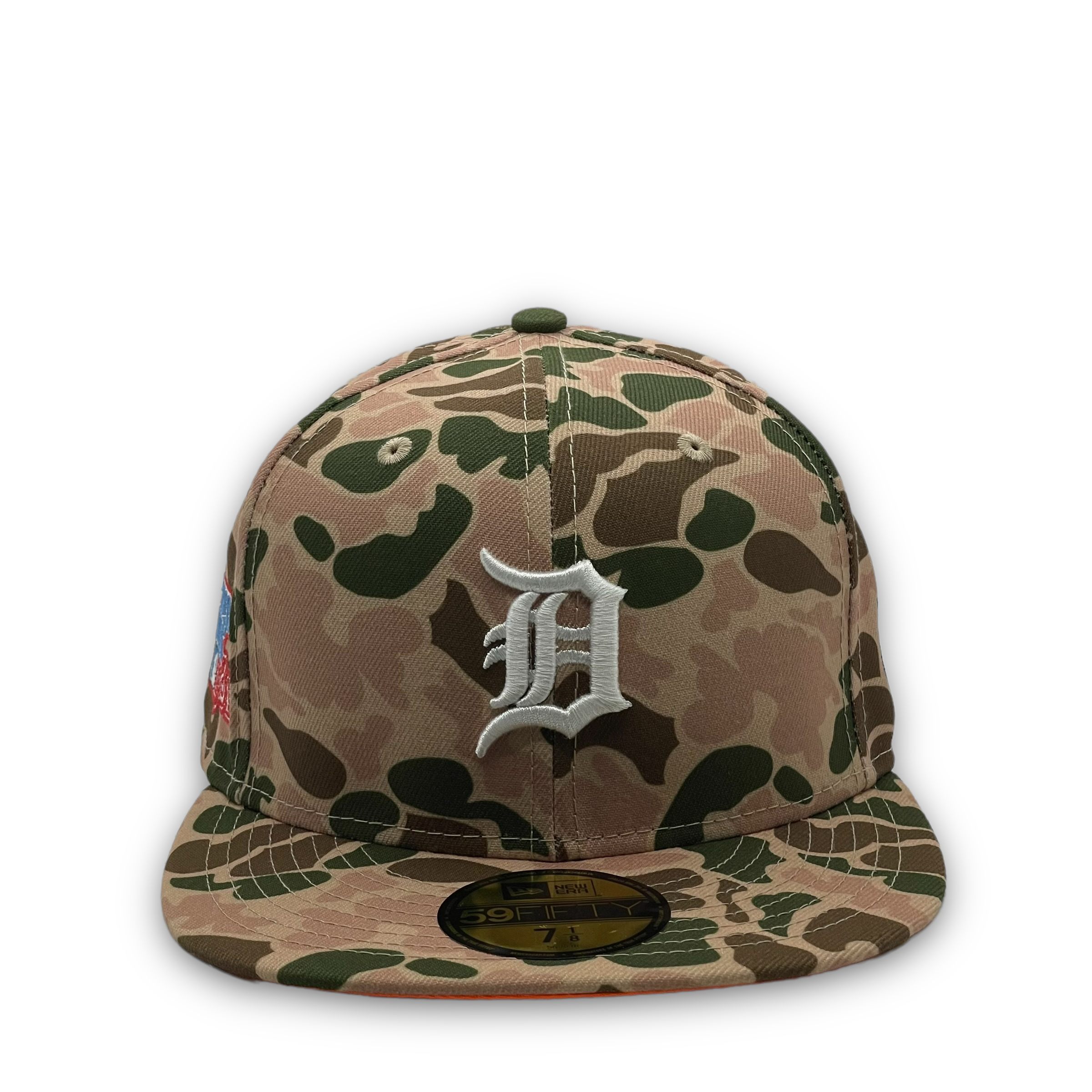 This New Era Detroit Tigers "Duck Camo" 1984 World Series 59FIFTY Fitted Hat was released by Burdeens Chicago. The fitted cap features a six panel structured high crown, embroidered eyelets and fabric squatchee button in a duck camo colorway. The front panel includes the Detroit Tigers logo embroidery and the New Era logo embroidered on the left panel and the official MLB insignia embroidered on the rear crown.