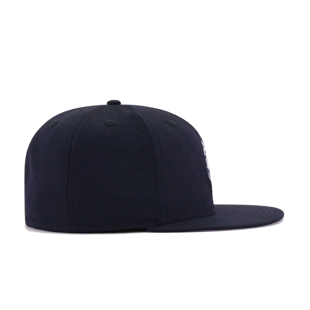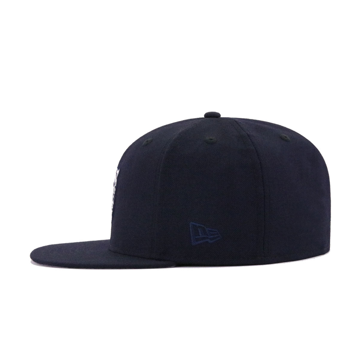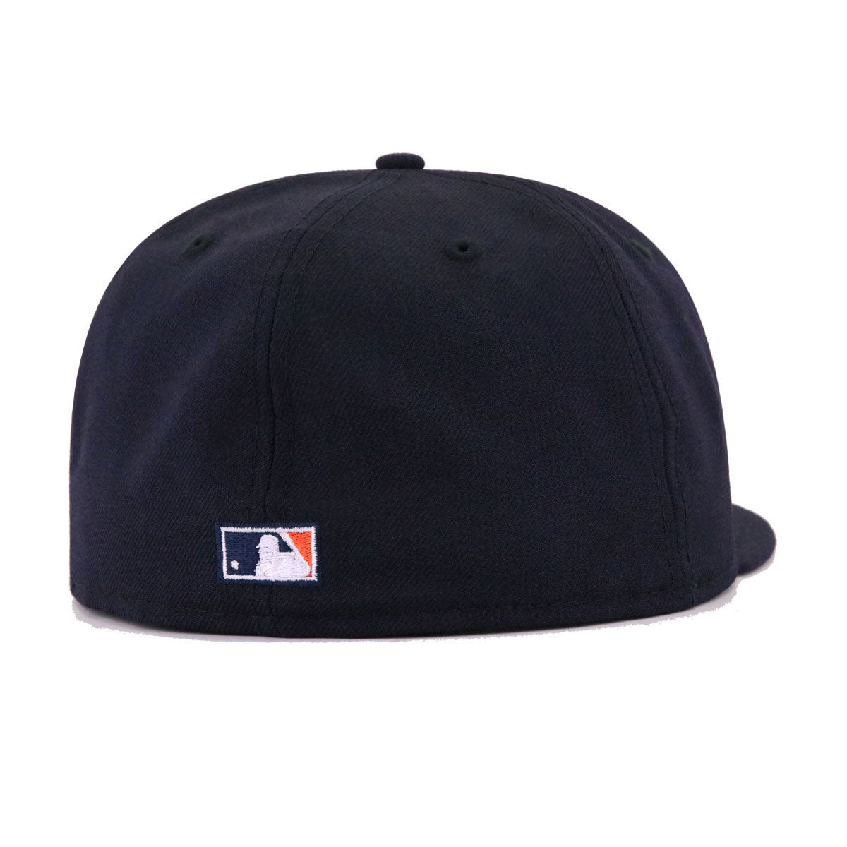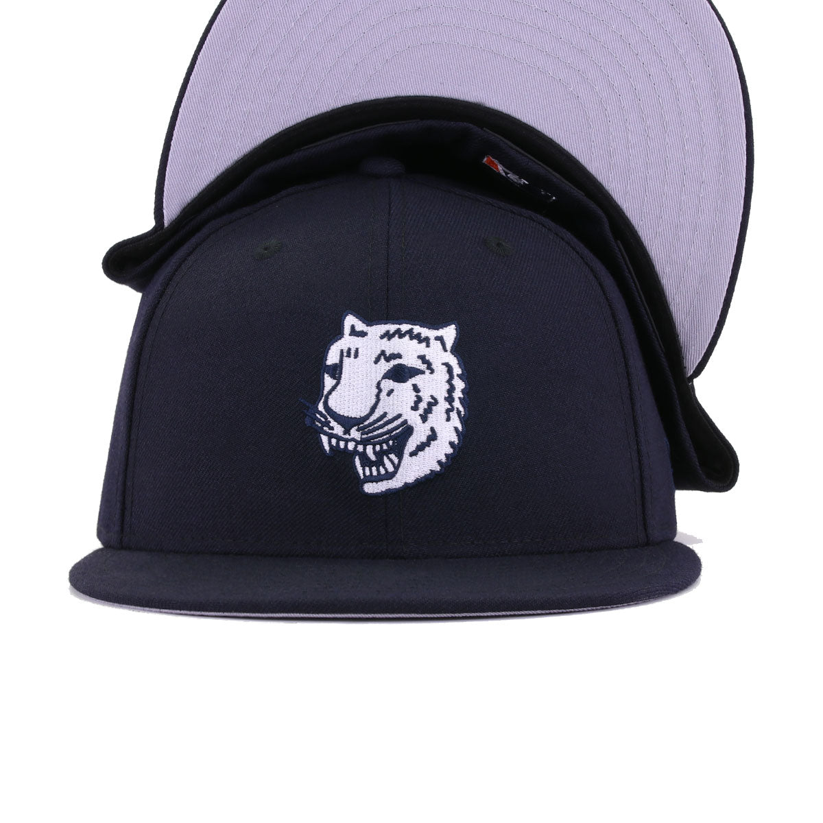This New Era Detroit Tigers Navy 1927 White Tiger 59FIFTY Fitted Hat has a navy blue six panel structured high crown and embroidered eyelets with a navy blue fabric squatchee button. The fitted cap has a navy blue flat bill with a grey undervisor and black sweatband. The front panel features the Detroit Tigers logo embroidery. The left panel of the fitted displays the New Era logo and the official MLB logo embroidery on the rear crown.