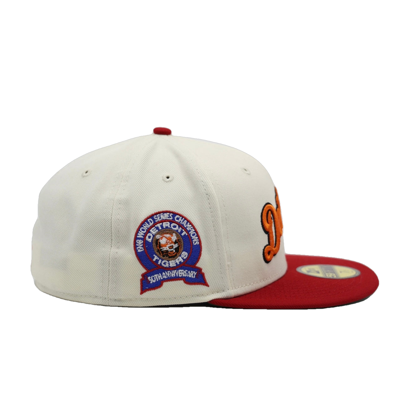 This New Era Detroit Tigers "Netherlands" 50th Anniversary 59FIFTY Fitted Hat was released by All The Right. The fitted has a _chrome six panel structured high crown and embroidered eyelets. The flat bill is red. The front panel features the Detroit Tigers logo embroidered in orange stitching and a 50th Anniversary side patch embroidered on the right panel. The left panel of the fitted displays the New Era logo and the official MLB logo embroidery on the rear crown.