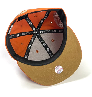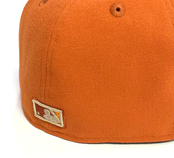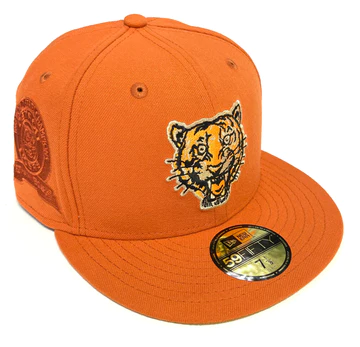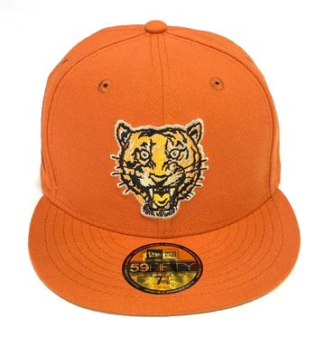This New Era Detroit Tigers Orange “Bengal Tiger” 59FIFTY Fitted Hat has an orange six panel structured high crown and embroidered eyelets with an orange fabric squatchee button. The fitted cap has an orange flat bill with a light brown undervisor and black sweatband. The front panel features the Detroit Tigers logo embroidery and a side patch embroidery on the right panel. The left panel of the fitted displays the New Era logo and the official MLB logo embroidery on the rear crown.
