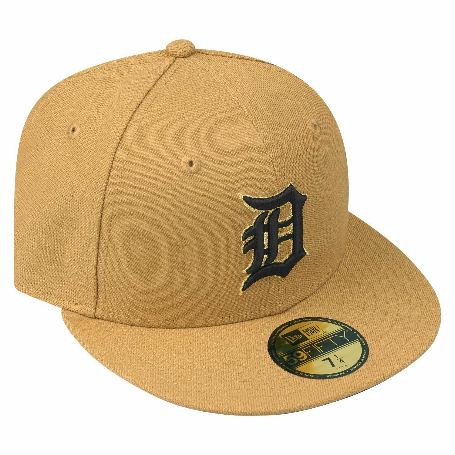 This New Era Detroit Tigers fitted hat has a Panama Tan colorway. The six panel structured high crown, embroidered eyelets and fabric squatchee button are Panama Tan. The flat bill of the fitted is also Panama tan with a black undervisor and black sweatband.