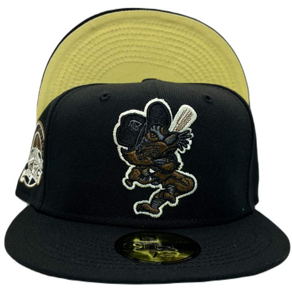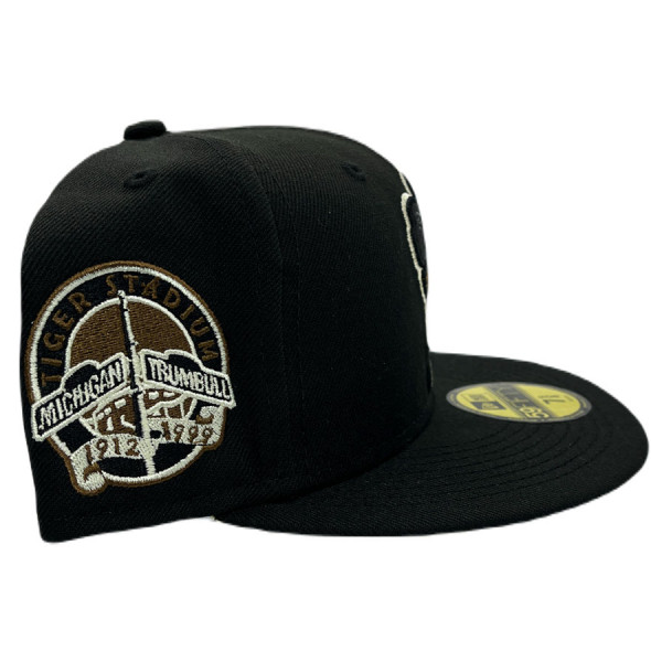 This New Era Detroit Tigers "Punk Pack" Ziggy Stardust Inspired Tiger Stadium 1999 Final Season 59FIFTY Fitted Hat has a black six panel structured high crown and embroidered eyelets with a black fabric squatchee button. The fitted cap has a black flat bill with a light yellow undervisor and white sweatband. The front panel features the Detroit Tigers logo embroidery and a 1999 Final Season Tiger Stadium side patch on the right panel. The left panel of the fitted displays the New Era logo and the official MLB logo embroidery on the rear crown.