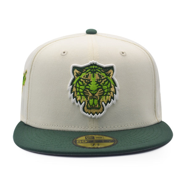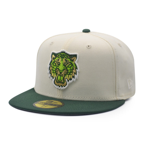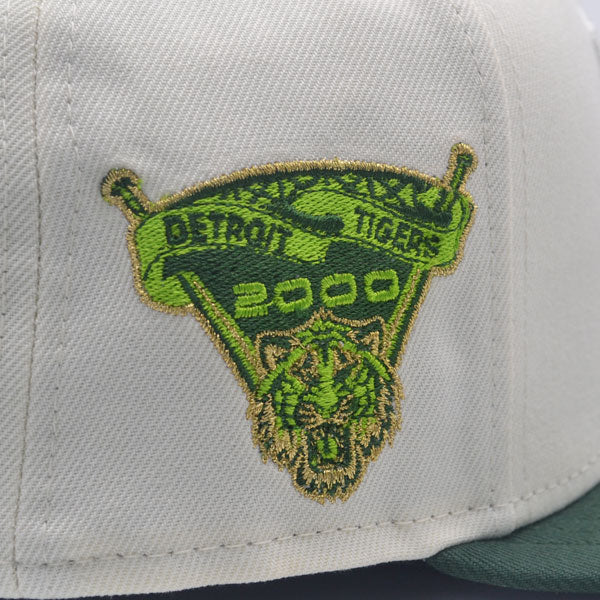 This New Era Detroit Tigers White/Pine/Gold 2000 All-Star Game 59FIFTY Fitted Hat was released by Hat Dreams. The fitted has a white six panel structured high crown and embroidered eyelets with a pine green fabric squatchee button. The flat bill of the fitted cap is also pine green with a grey bottom undervisor. The front panel features the Detroit Tigers logo embroidery and a side patch embroidered on the right panel. The left panel of the fitted displays the New Era logo and the official MLB Batterman logo embroidered on the rear crown.