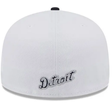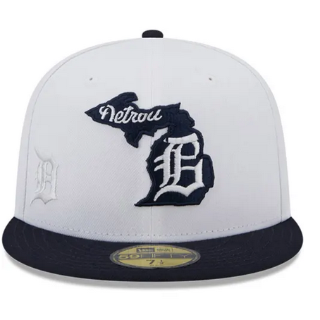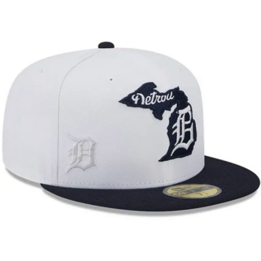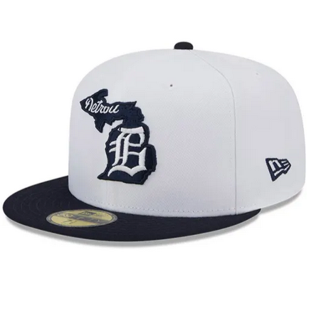 This New Era Detroit Tigers State 59FIFTY fitted hat has a white six panel structured high crown and embroidered eyelets with a navy fabric squatchee button and flat bill. The front panel features the Detroit Tigers logo embroidered inside a state logo graphic.