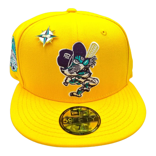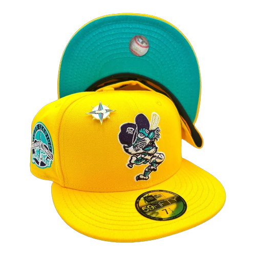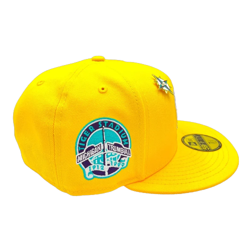 This New Era Detroit Tigers Yellow/Teal 1912-1999 Stadium Patch 59FIFTY Fitted Hat has a yellow six panel structured high crown and embroidered eyelets with a yellow fabric squatchee button. The fitted cap has a yellow flat bill with a teal undervisor. The front panel features the Detroit Tigers logo embroidery and a 1912-1999 side patch embroidery on the right panel. The left panel of the fitted displays the New Era logo and the official MLB logo embroidery on the rear crown.
