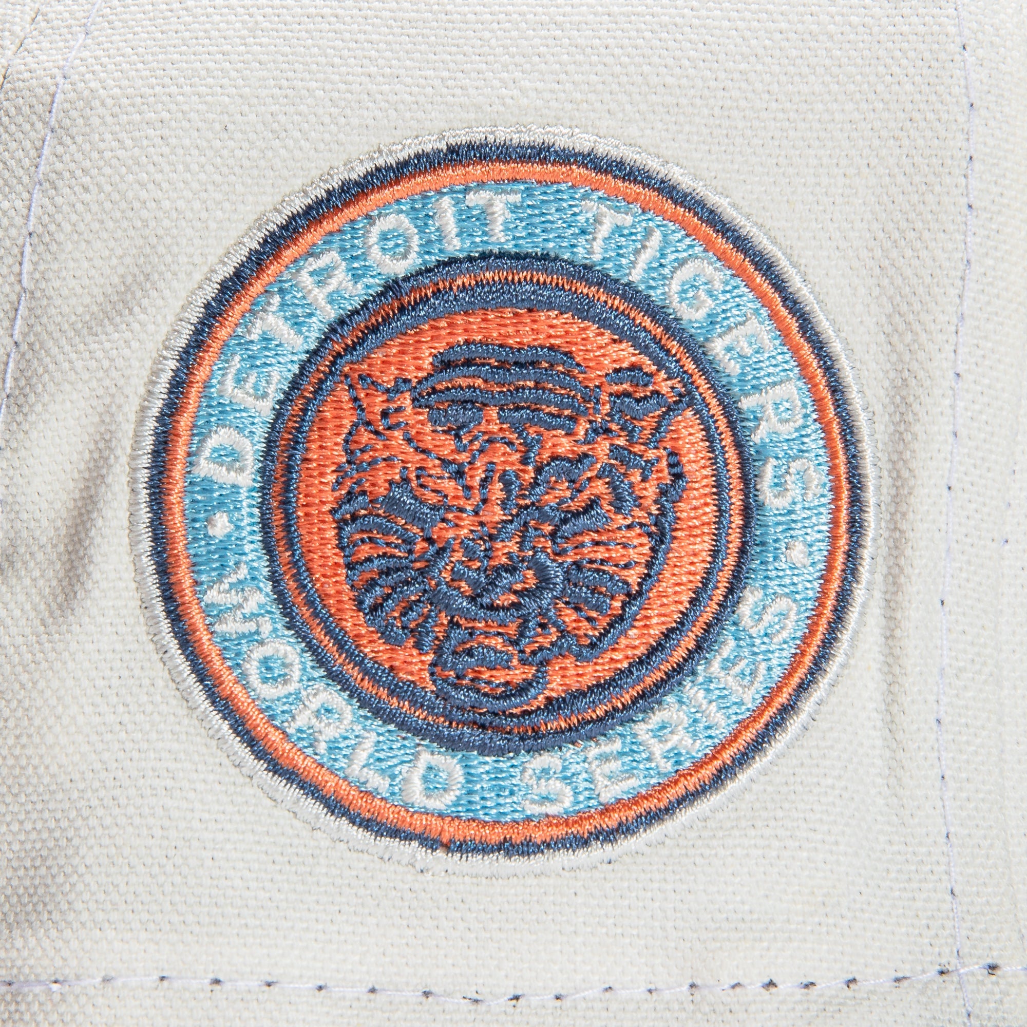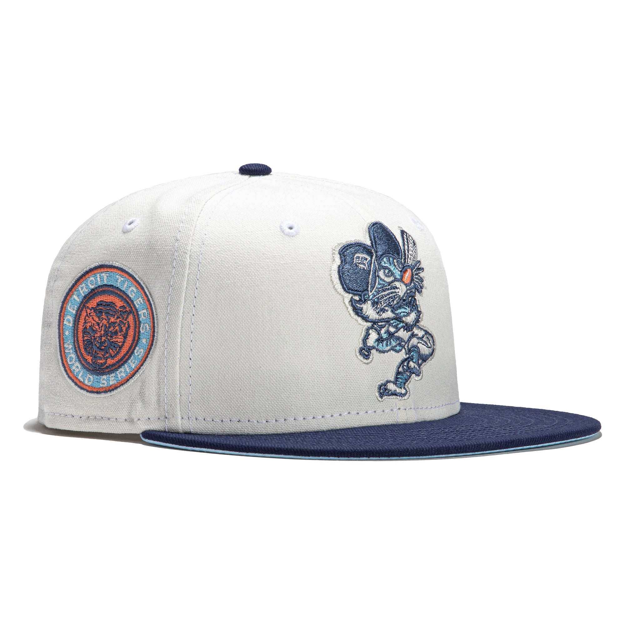 This New Era Monaco Detroit Tigers 1968 World Series 59FIFTY Fitted Hat is a Hat Club exclusive. The fitted has a stone six panel structured high crown and embroidered eyelets with a navy fabric squatchee button. The fitted cap also has a navy flat bill with a light blue satin undervisor. The front panel features the Detroit Tigers logo embroidery and a 1968 World Series side patch embroidery on the right panel. The left panel of the fitted displays the New Era logo and the official MLB logo embroidery on the rear crown.