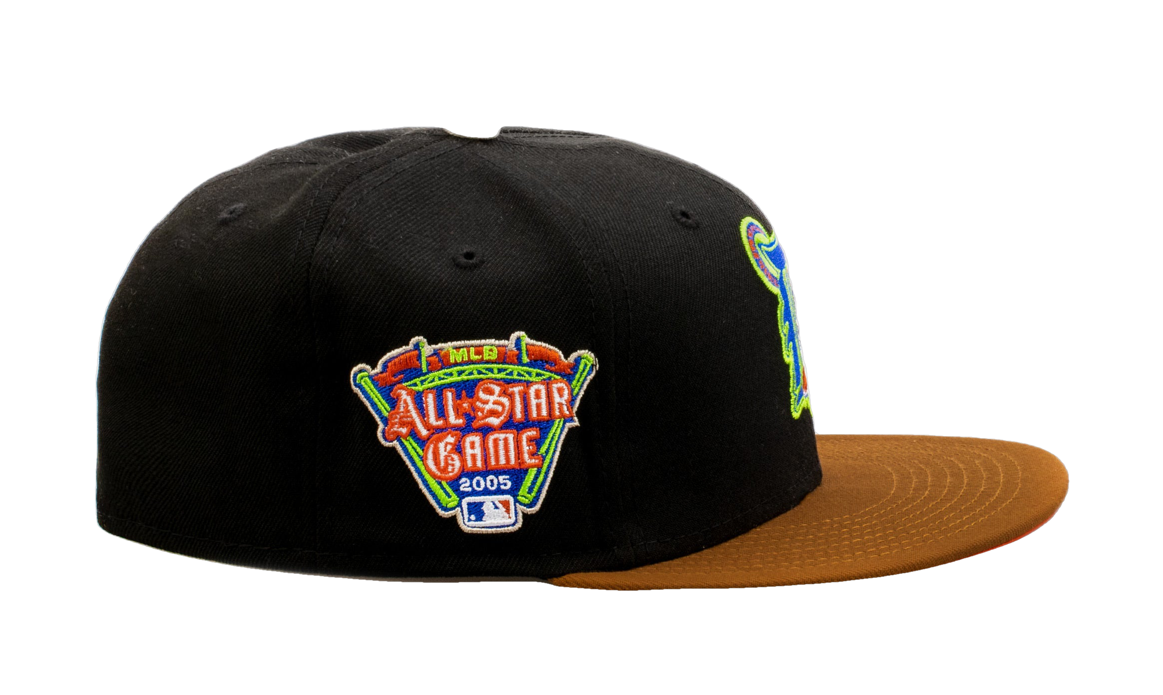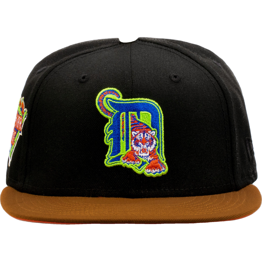 This New Era x Shoe Palace Detroit Tigers "Gingerbread" 59FIFTY Fitted Hat was released by Shoe palace. The Gingerbread fitted has a black six panel structured high crown and embroidered eyelets. The flat bill of the fitted is brown with an orange undervisor and black sweatband. The front panel features the Detroit Tigers logo embroidery and a side patch embroidered on the right panel. The left panel of the fitted displays the New Era logo and the official MLB logo embroidery on the rear crown.