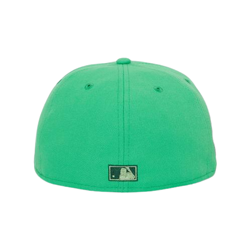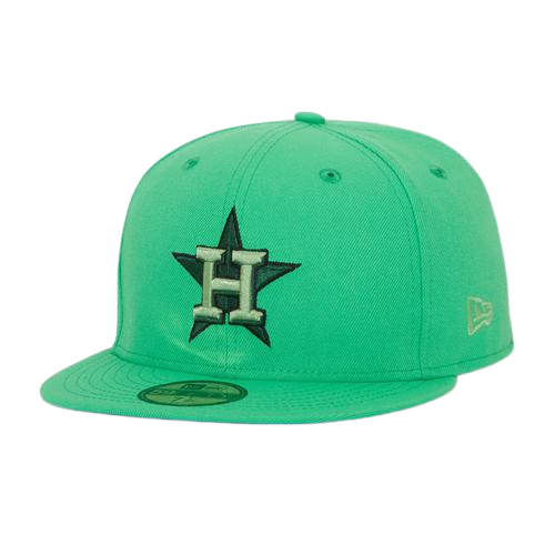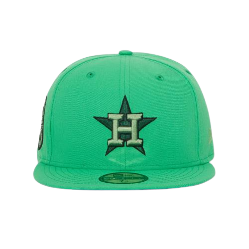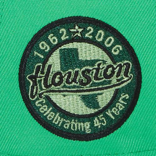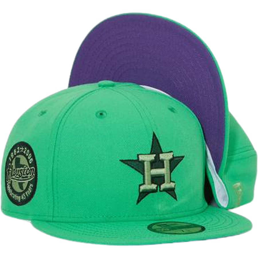 This New Era Houston Astros Green "Hulk" 59FIFTY Fitted Hat has a green six panel structured high crown and embroidered eyelets with a green fabric squatchee button. The fitted cap has a green flat bill with a purple undervisor and white sweatband. The front panel features the Houston Astros logo embroidery and a 45 Years side patch on the right panel. The left panel of the fitted displays the New Era logo and the official MLB logo embroidery on the rear crown.
