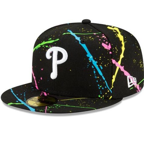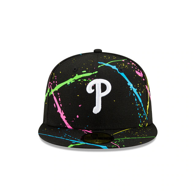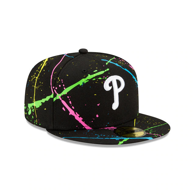 Light up the night with the Philadelphia Phillies Streakpop 59FIFTY Fitted Cap featuring an embroidered team logo at the front panels with a neon splatter detailing throughout the crown and a MLB Batterman logo at the rear. Additional details include a gray undervisor.